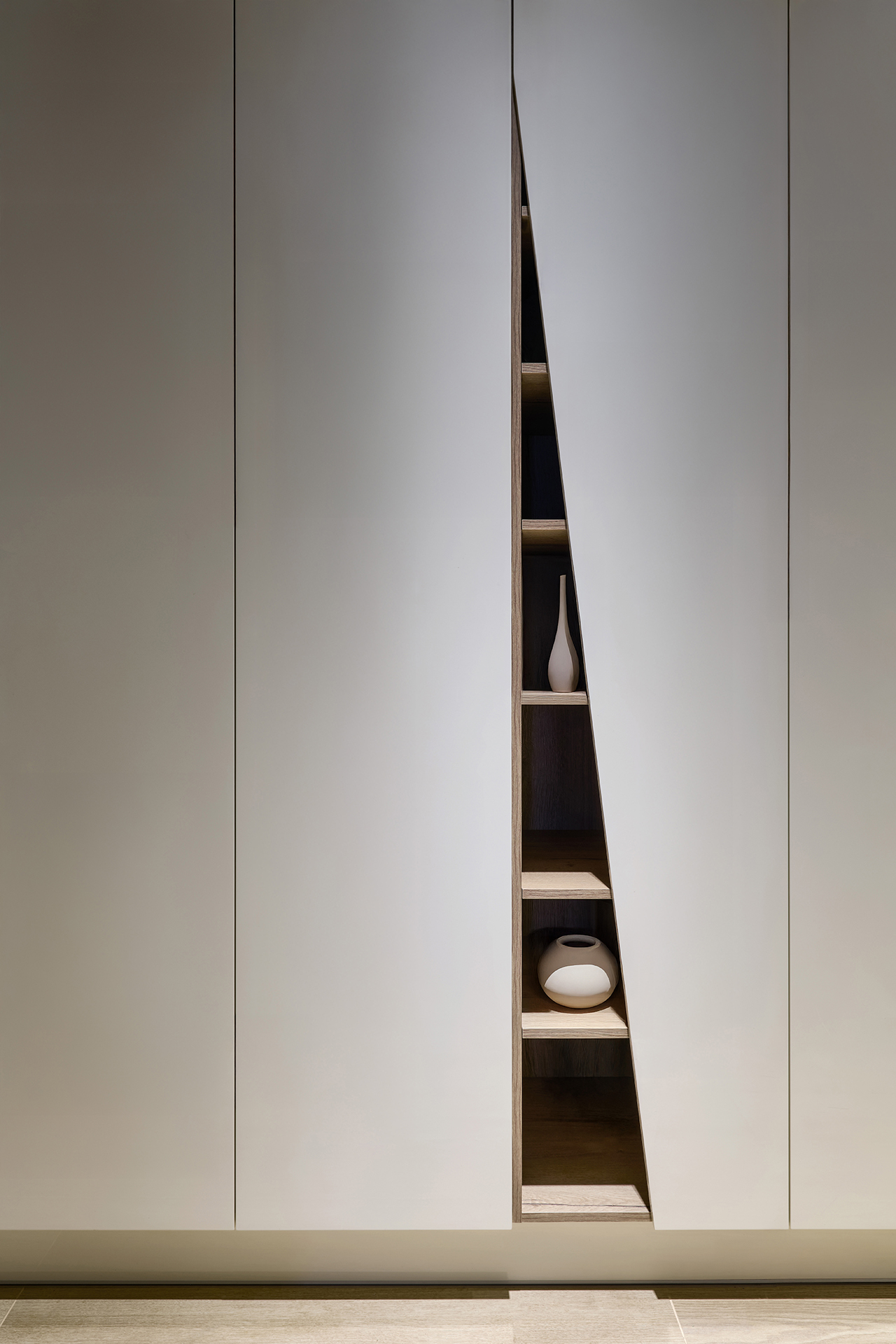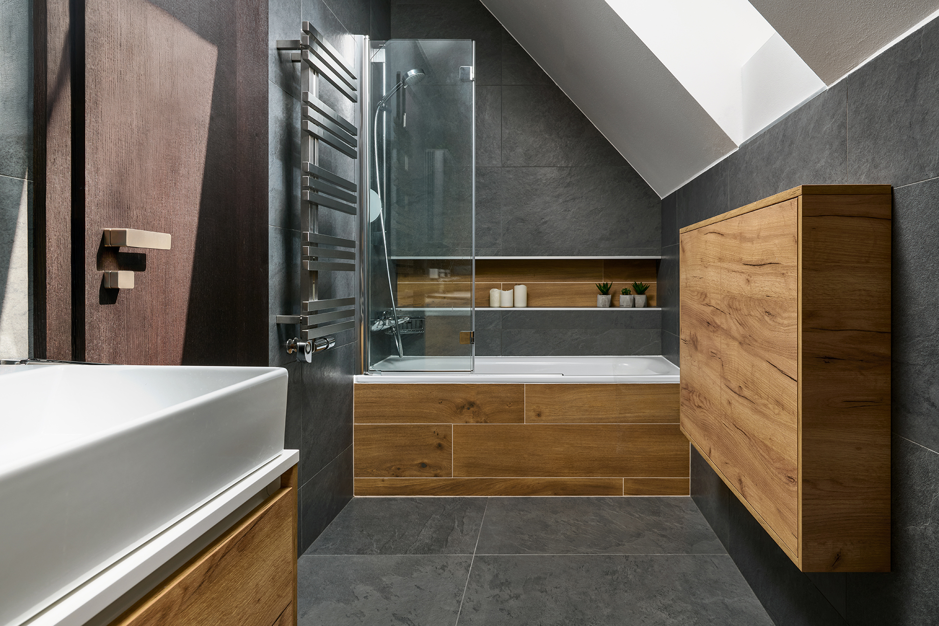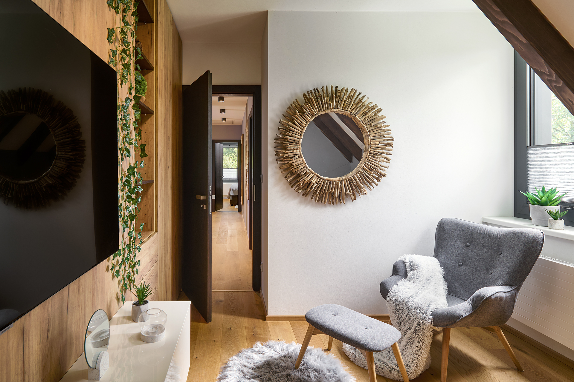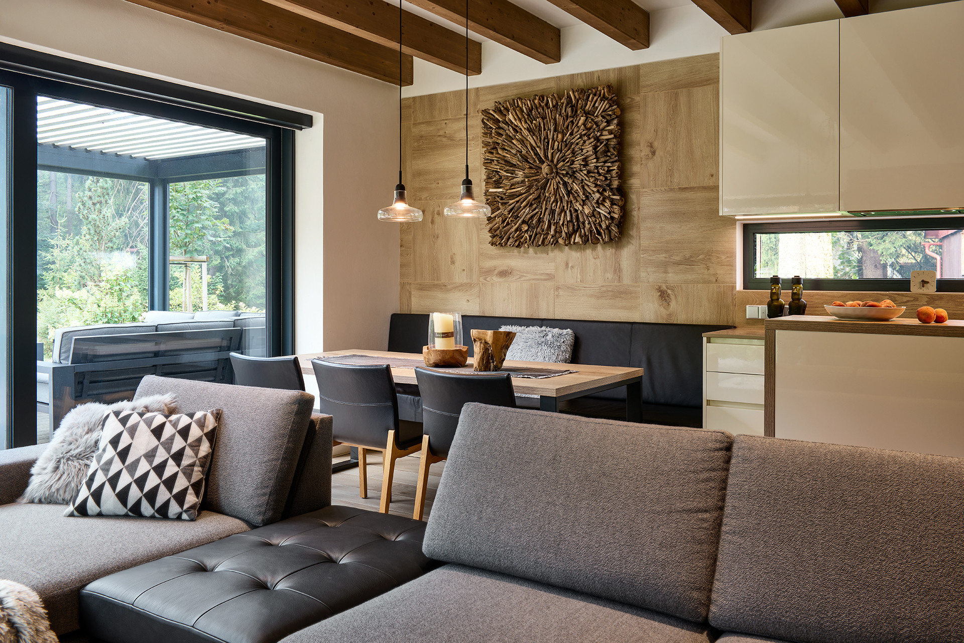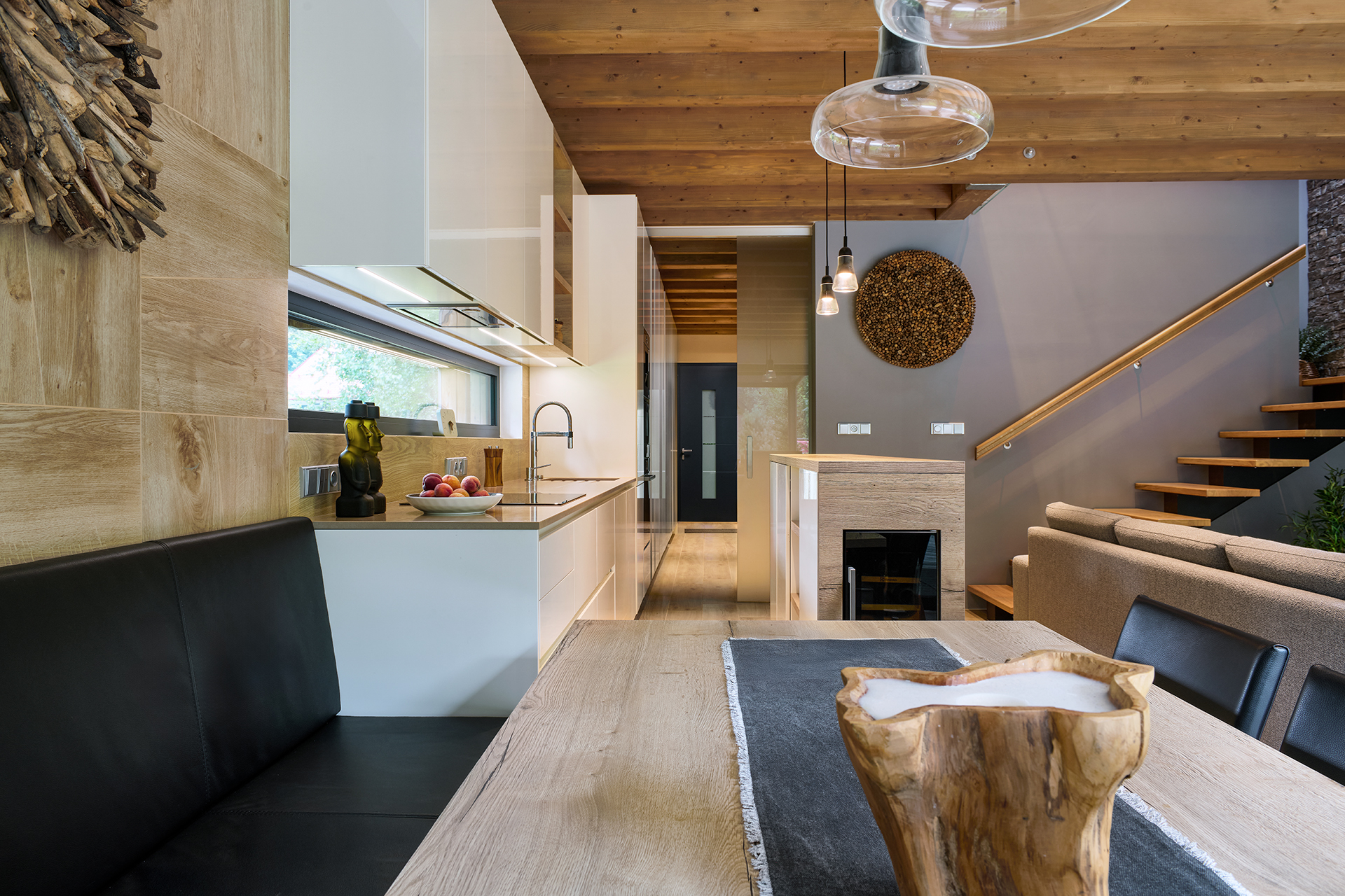 Tento interiér ztělesňuje nadčasovou eleganci s pocitem útulného pohodlí. Koncept staví na harmonii přírodního dřeva, kameninových dekorů a čistých, moderních linií, které dohromady vytvářejí klidný a vizuálně působivý celek.