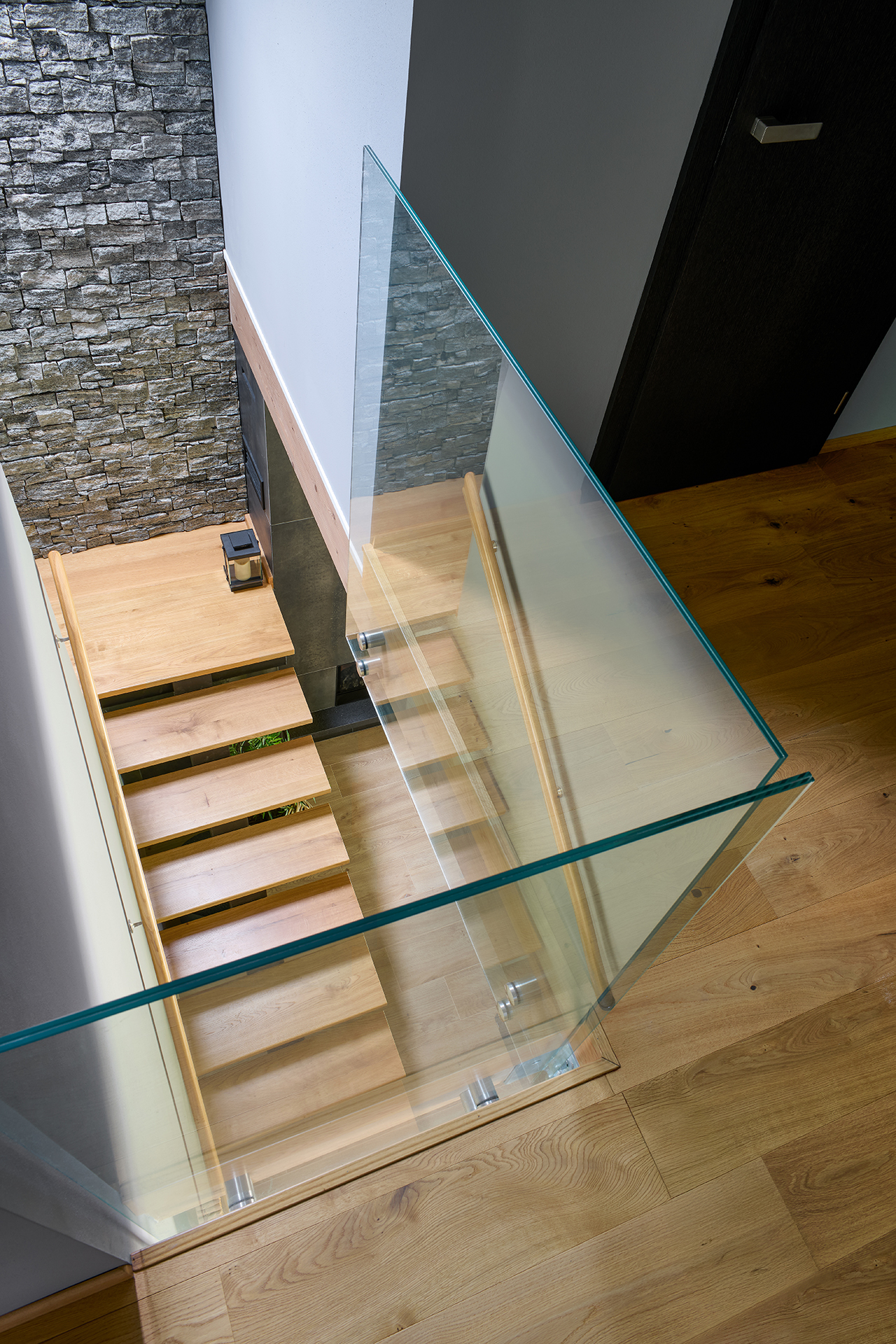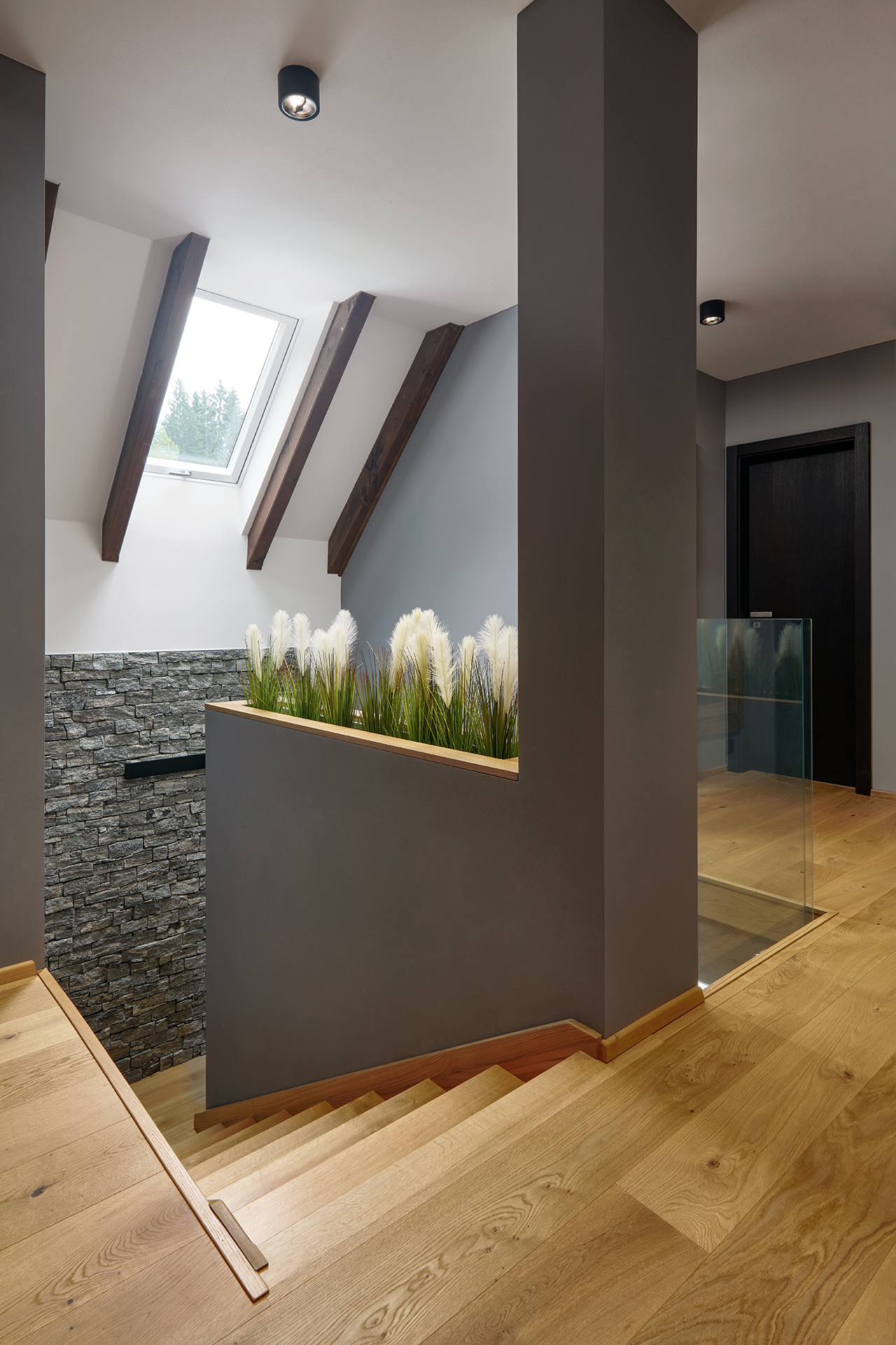 Obývací část zaujme propojením materiálů a detailů. Výrazné šedé kamenné obložení kontrastuje s lehkostí konferenčních stolků, zatímco skříňka pod TV vyrobená na míru prostoru dodává osobitý charakter a luxusní nádech.