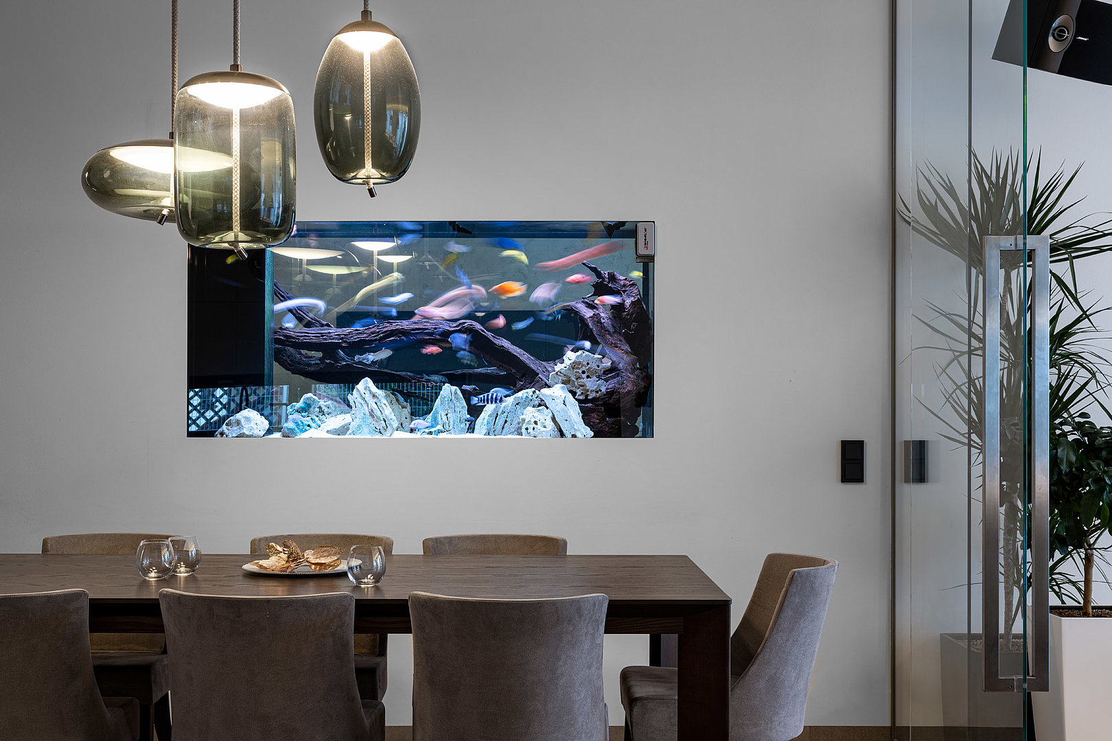 Interiér, kde jsou dva jídelní stoly. Stůl JS34 v dýhovaném provedení a další atypický, vyrobený na zakázku pro 12 lidí, se speciální povrchovou úpravou a keramickou stolovou deskou.