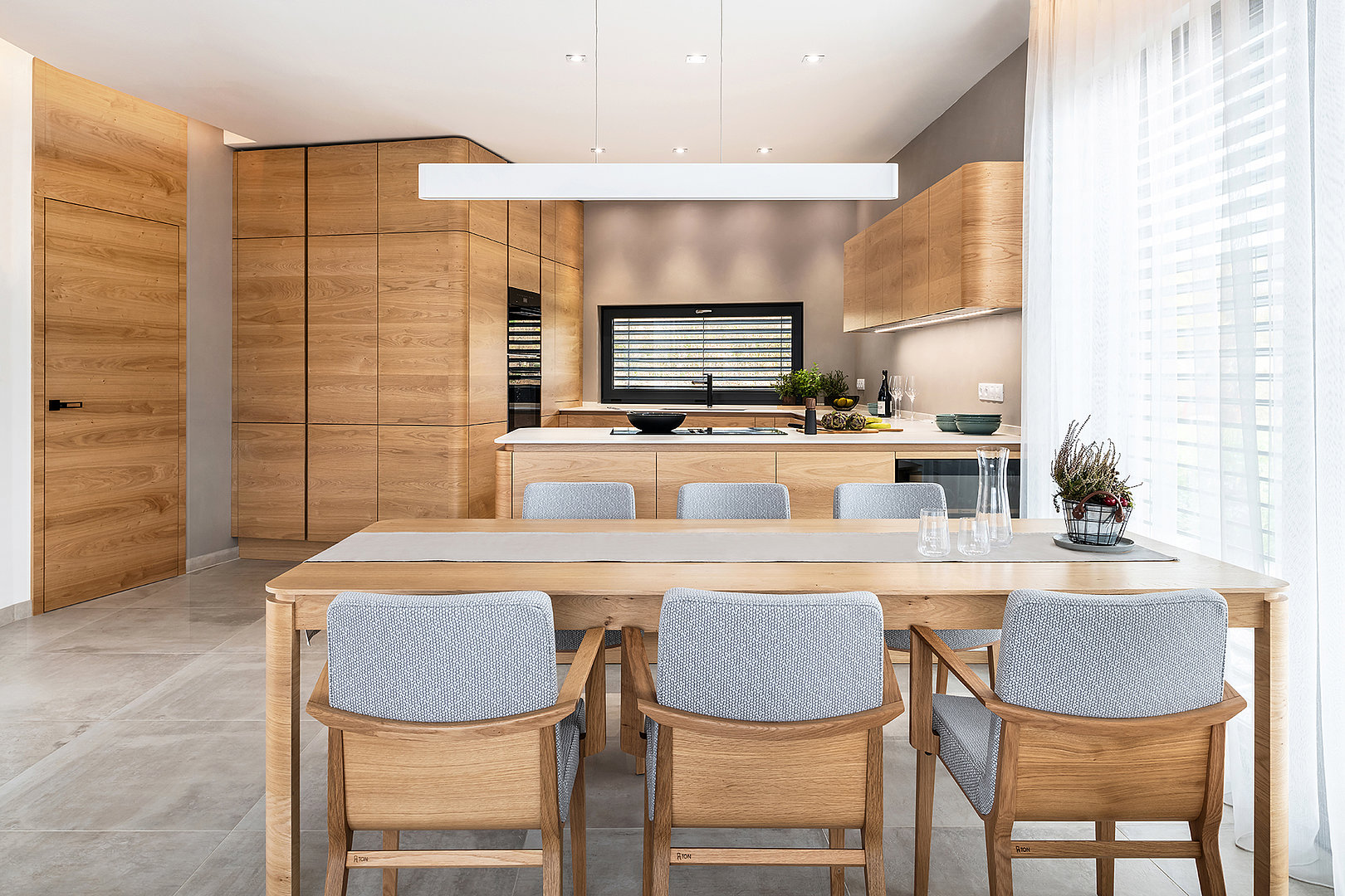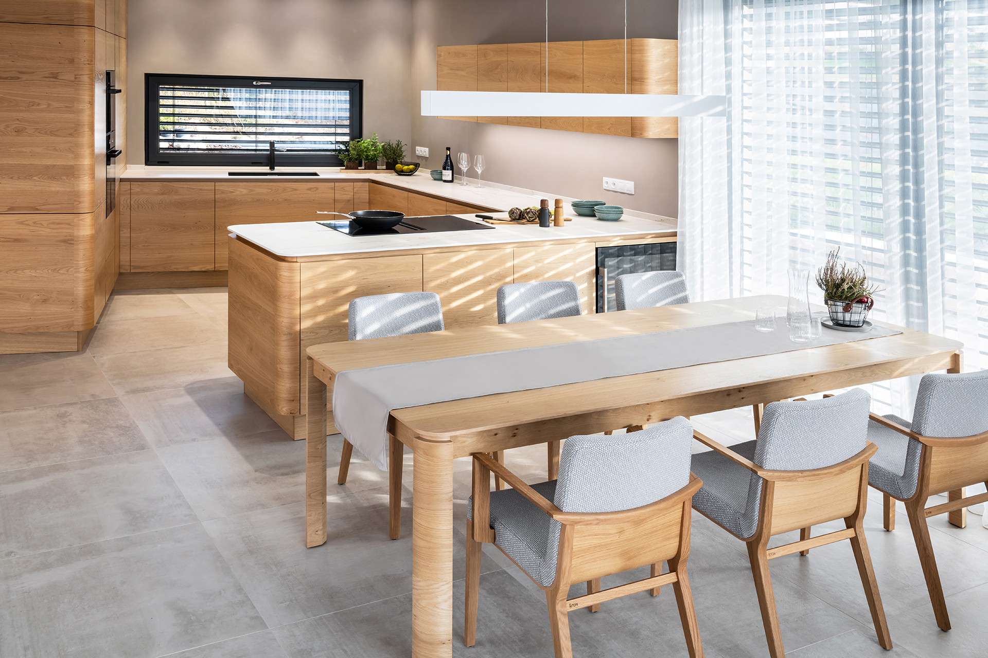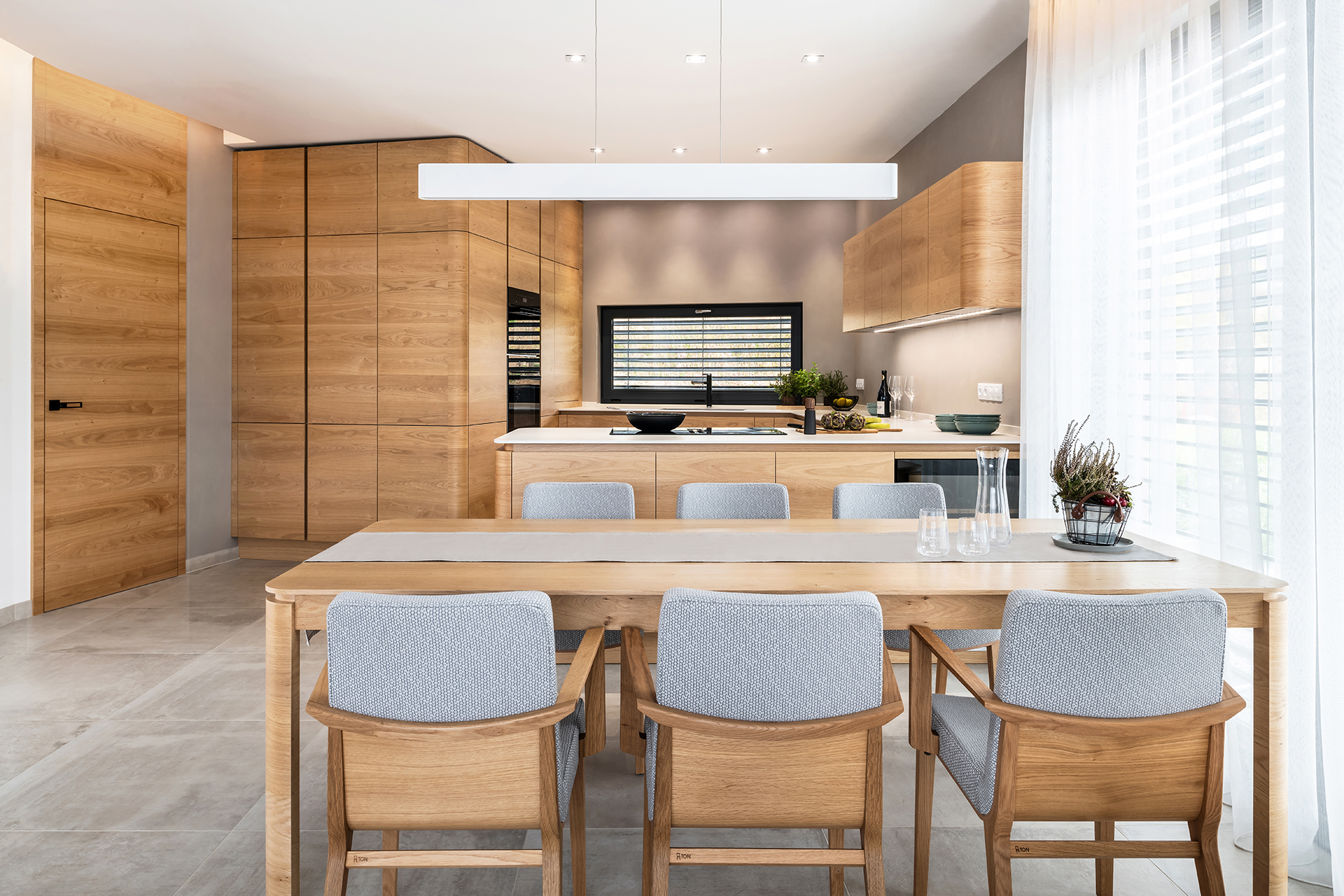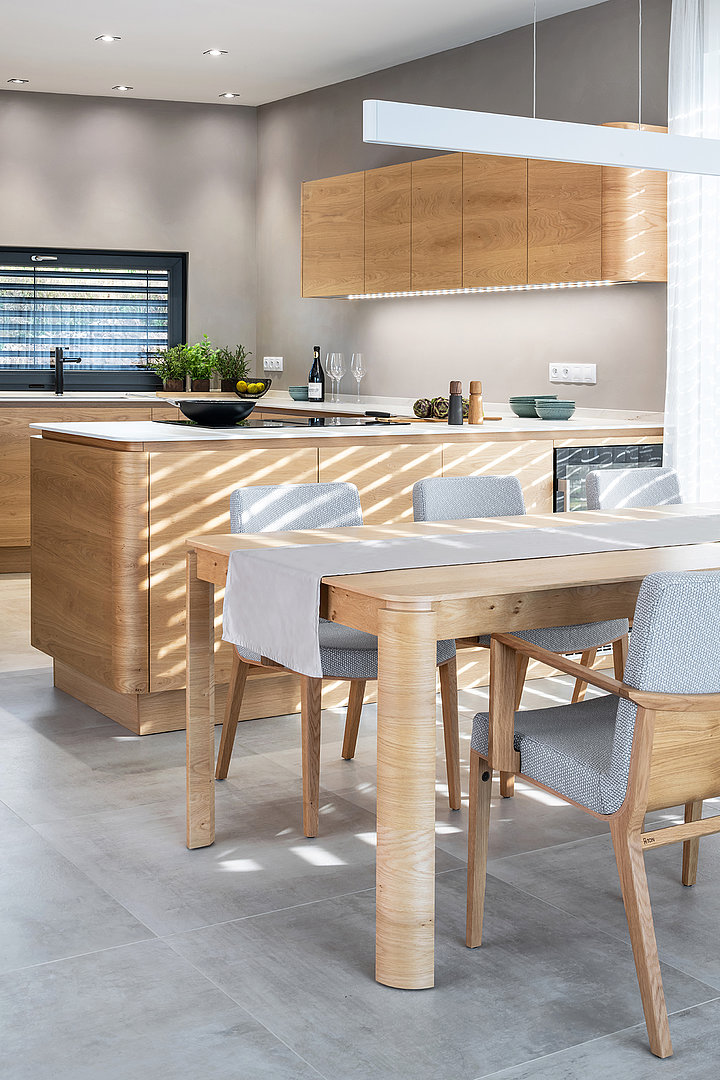Jídelna ve stejném designu a materiálech, jako kuchyně, vytváří krásný propojený a ucelený prostor.