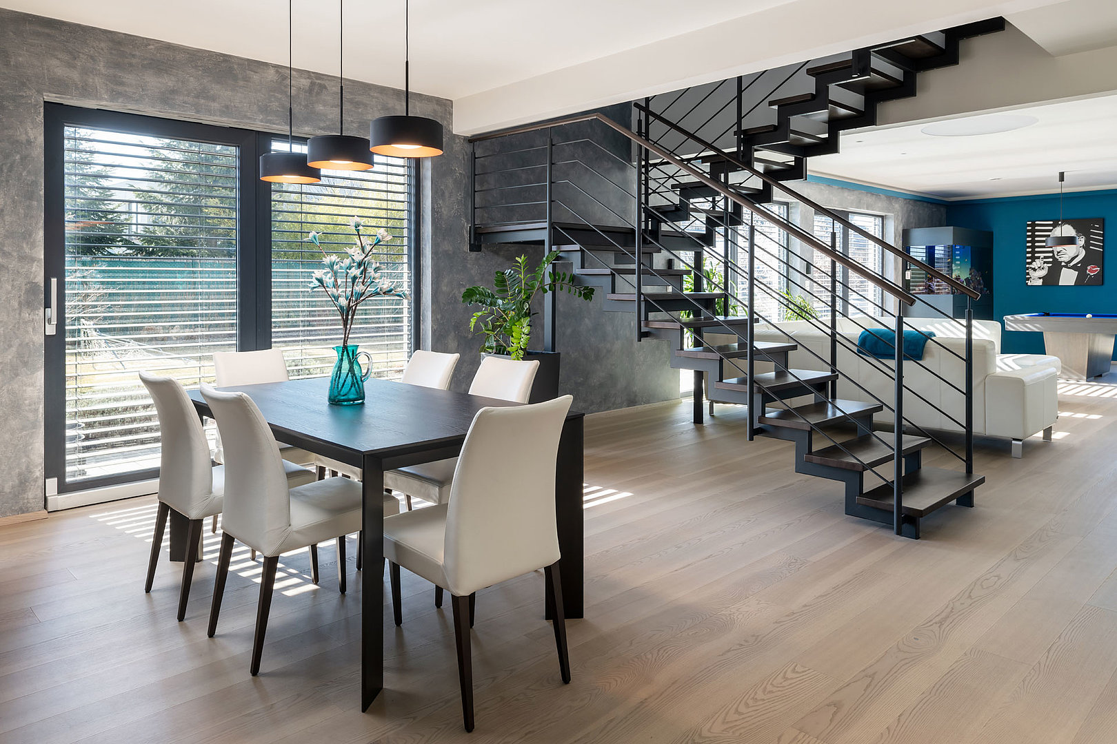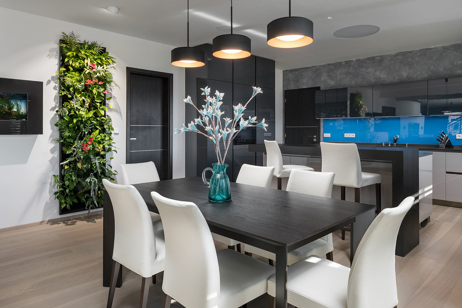 Příjemné posezení u jídelního stolu s výhledem do zahrady. Celý interiér je symetrický, vyvážený a nese se v tónech tmavé dýhy a svěží tyrkysově modré.