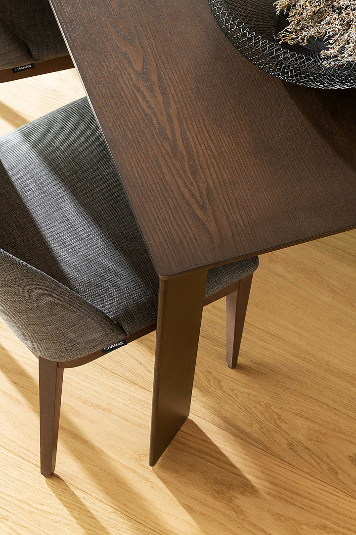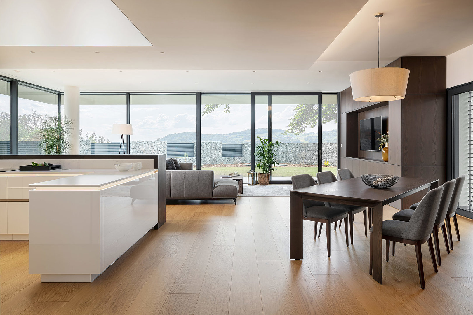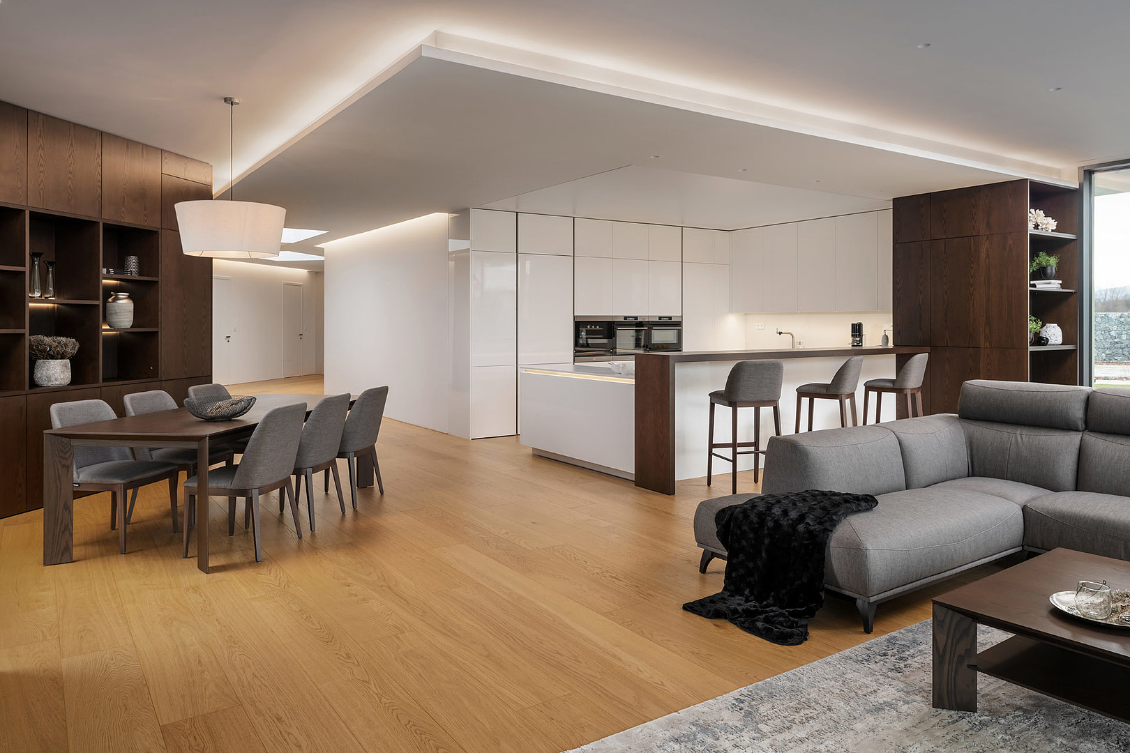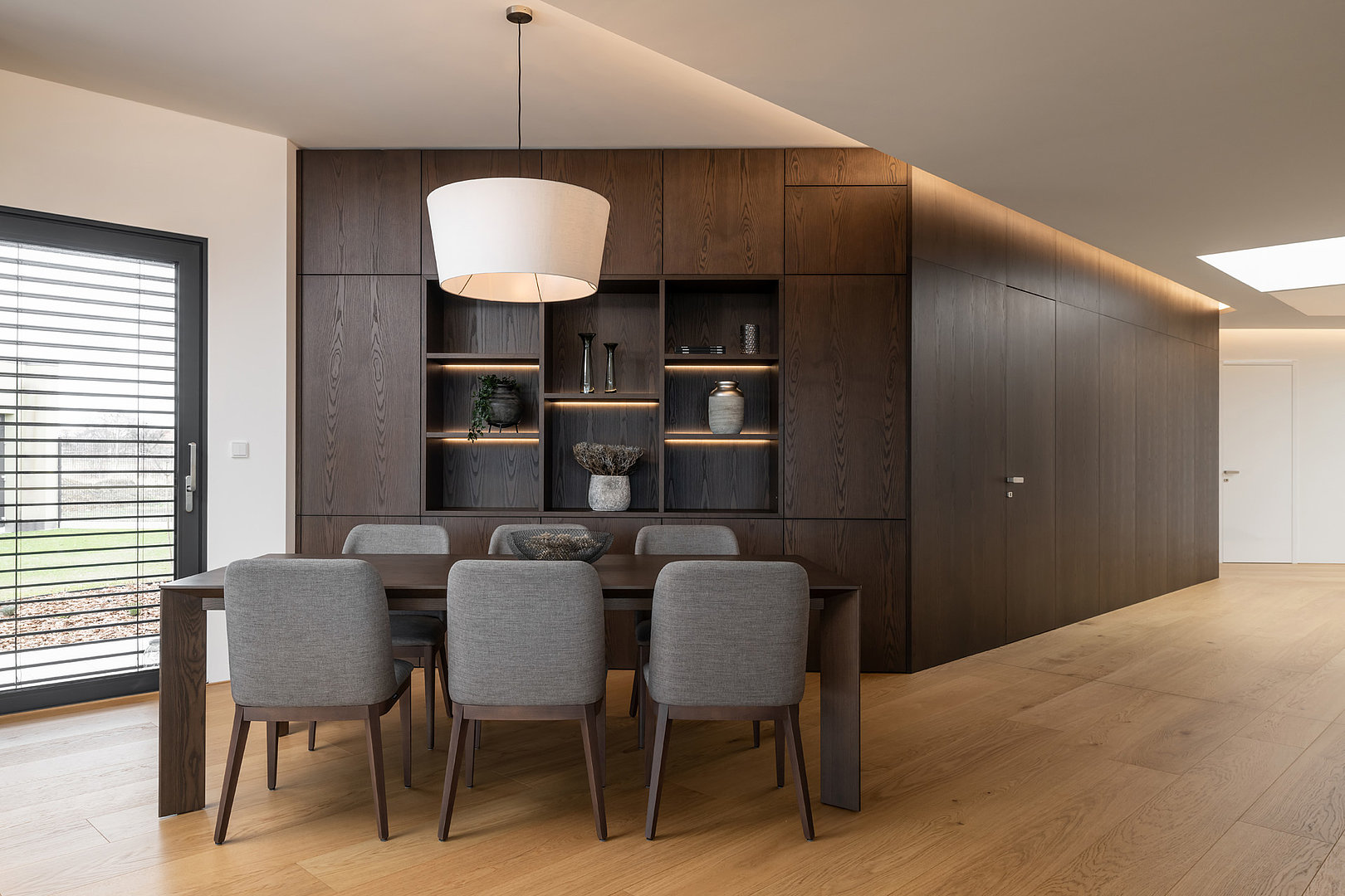 Jídelní stůl JS48, židle NORMAN, obklad stěny i úložné skříňky s otevřenými policemi jsou ve stejném materiálovém provedení. Celý interiér působí kompaktně a harmonicky.