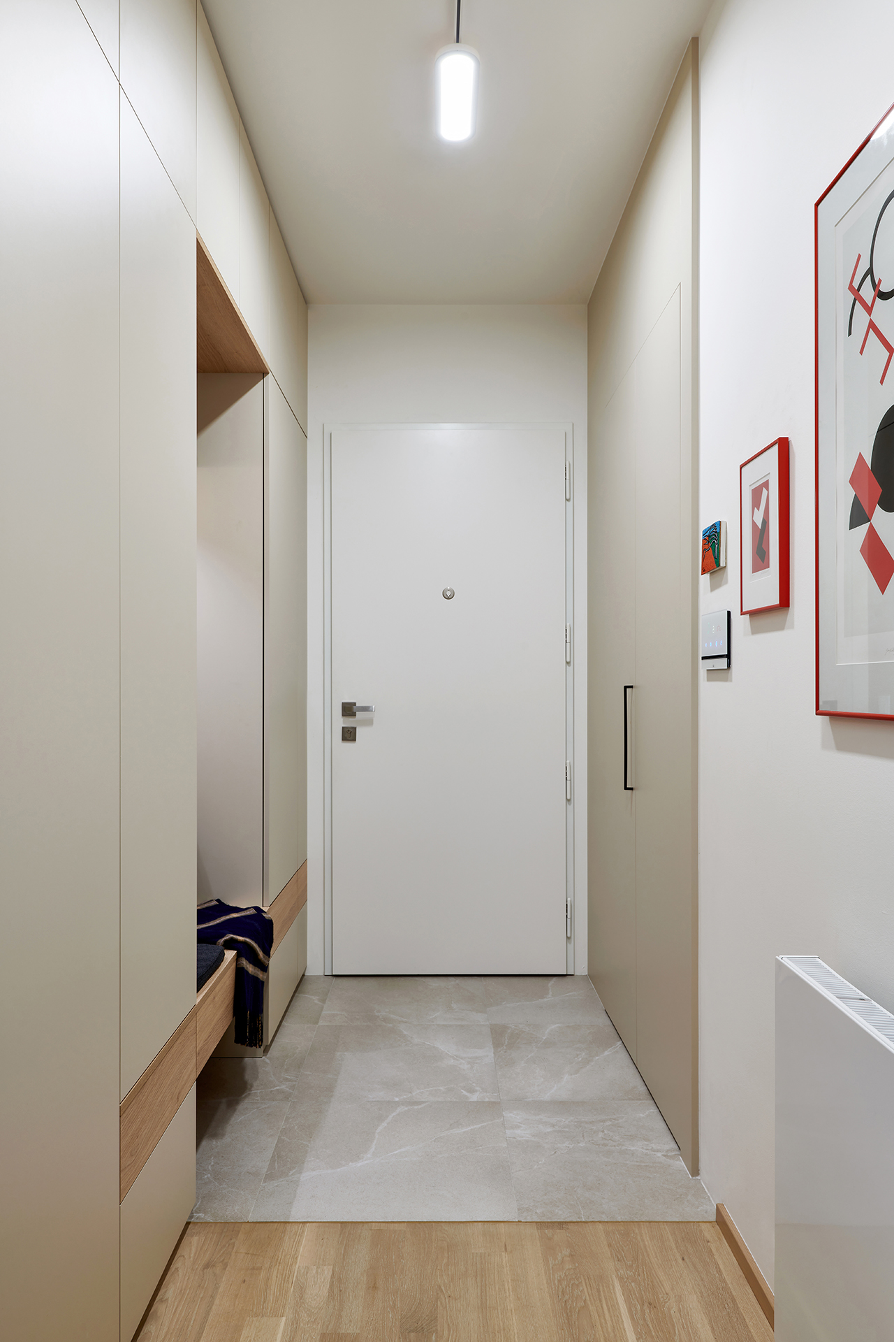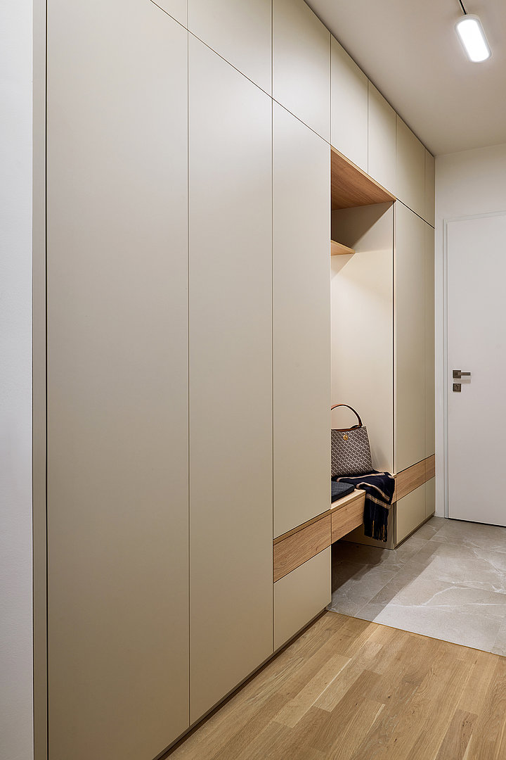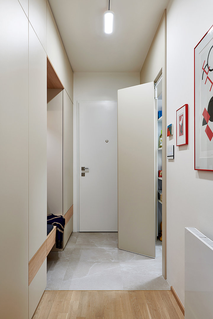 Tato realizace zahrnuje i designovou přeměnu chodby, ve které byly také, mimo jiné, velmi důmyslně zakryté rozvaděče. Do technické místnosti, kde je umístěná pračka se sušičkou, jsou použité praktické skládací dveře. Celá realizace opět koresponduje s myšlenkou INTERIOR CONCEPT a je tak v designovém i materiálovém provedení, které doslova ladí s ostatními pokoji.