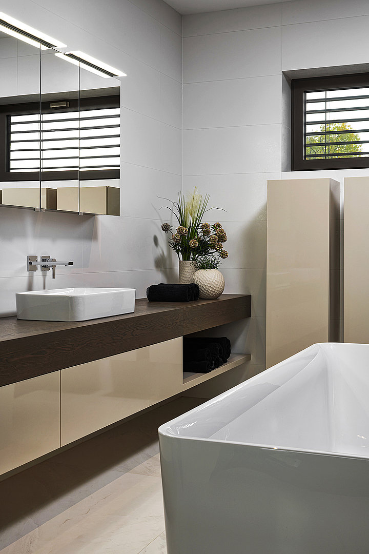 Koupelnová sestava MODUS v přírodní dýze a laku ve vysokém lesku v minimalistickém designu. Speciální úprava dvířek i interiérových dveří odolá zvýšené vlhkosti, která se v koupelně objevuje.