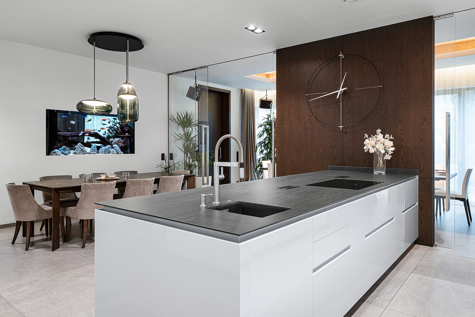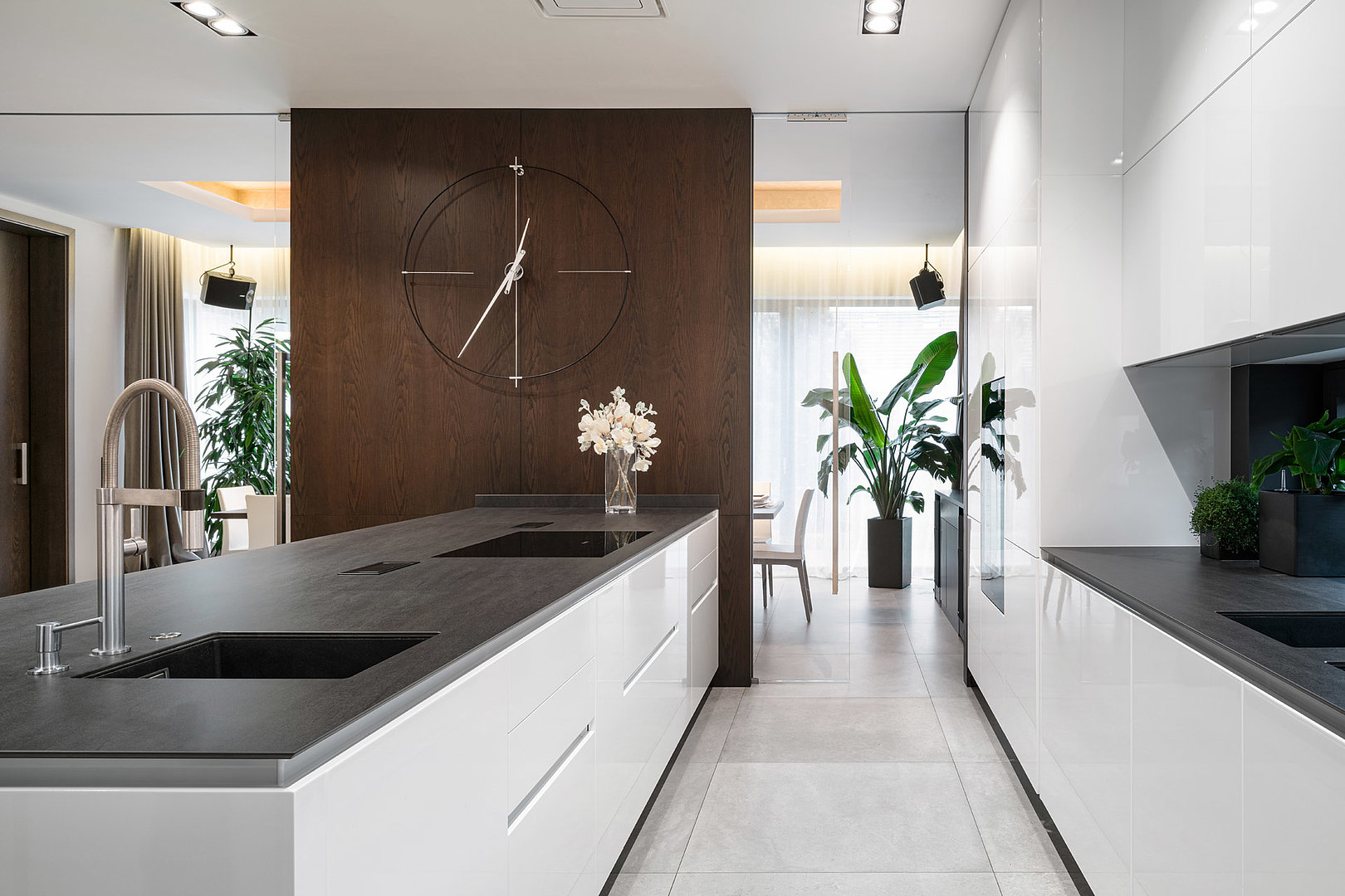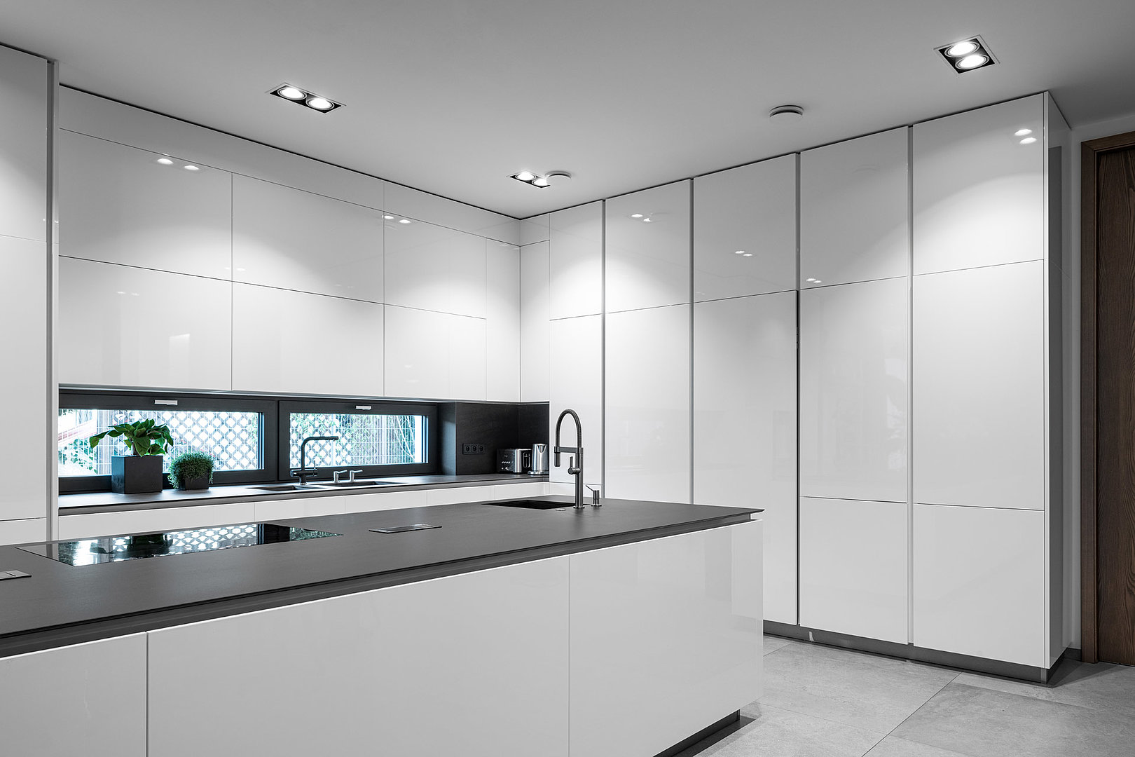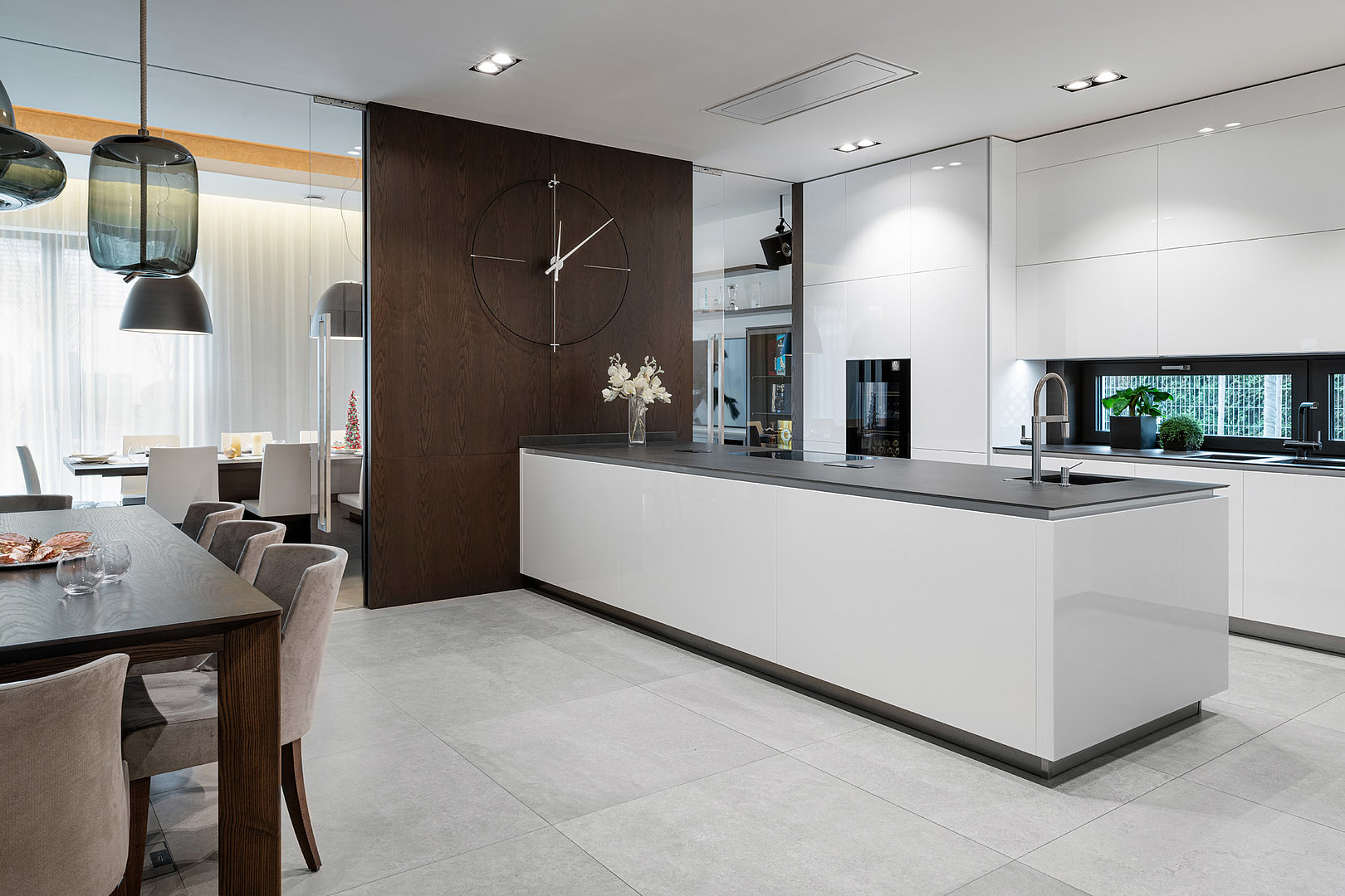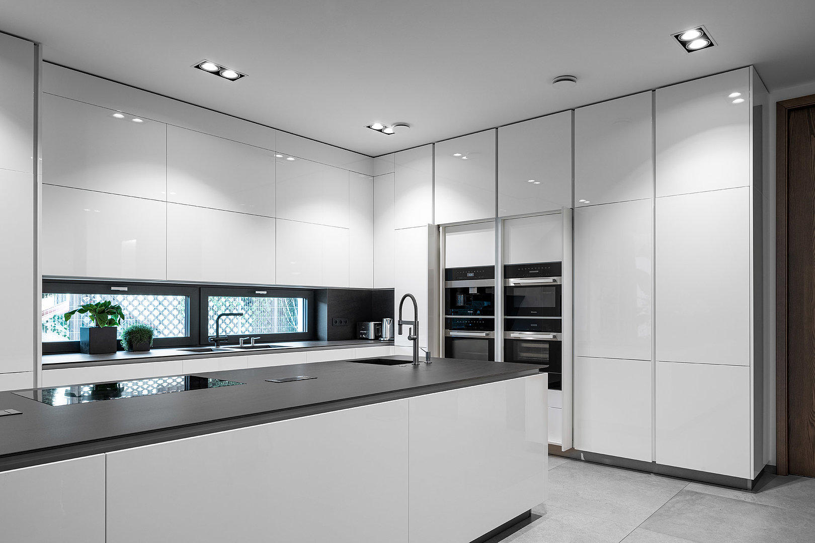 Prostorná nadčasová kuchyně ELITE / LINE s kuchyňským ostrůvkem v bílém laku. Spotřebiče jsou důmyslně skryté za dvířky vysokých technických skříní a neruší tak celkový vzhled kuchyně.