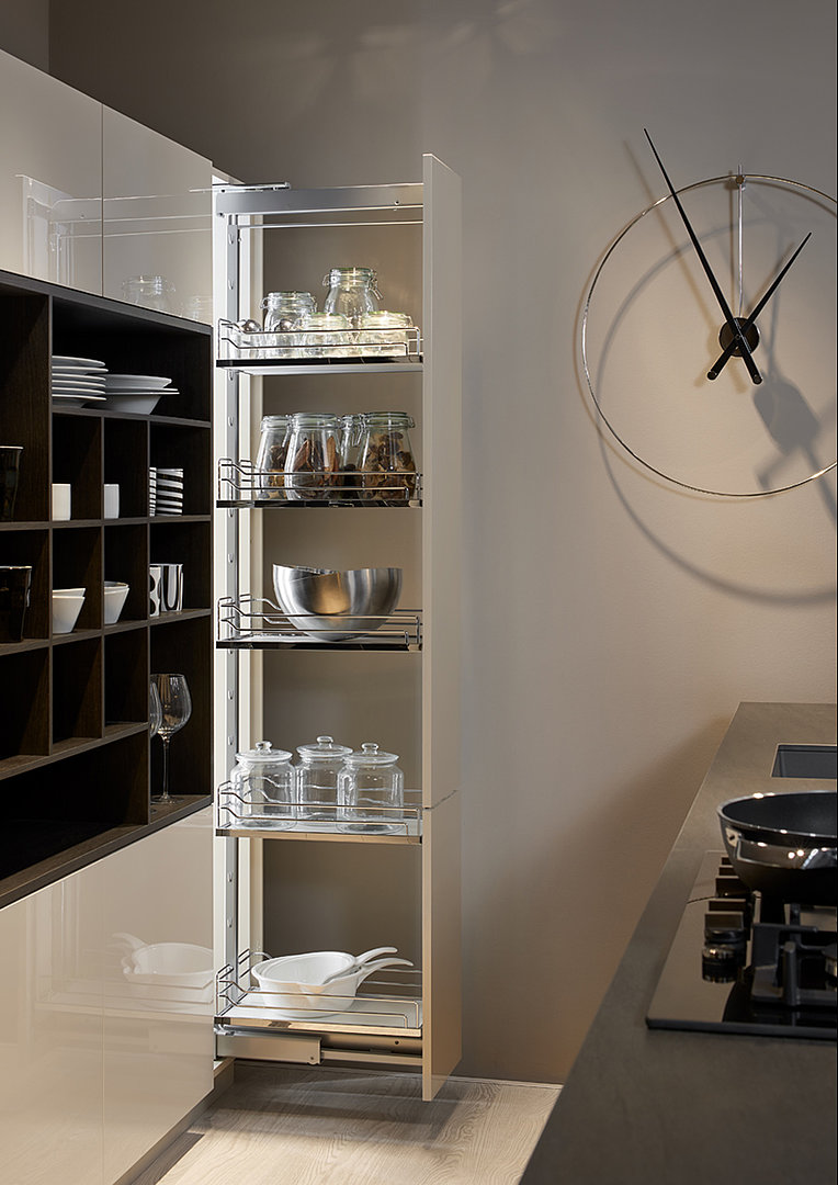 Tato kuchyňská sestava je velmi působivá mimo jiné díky vnitřním členitým nikám ve vysoké skříni. Jednoduše krásná moderní sestava s nevšední tváří.