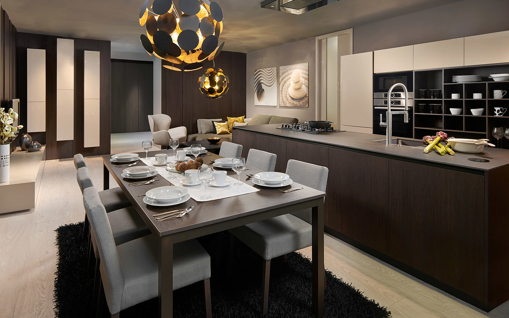 Kuchyně ELITE s jídelnou v kombinaci dubu carbon a champagne