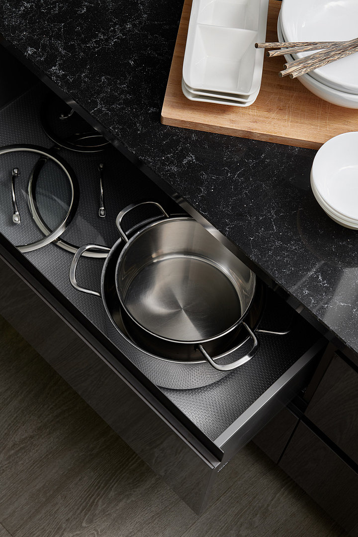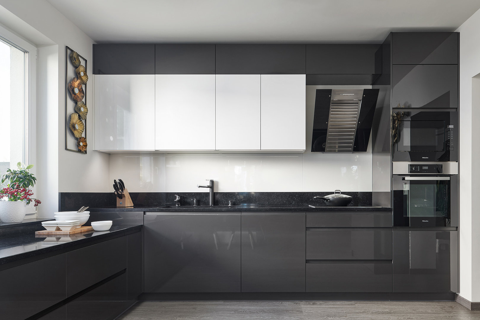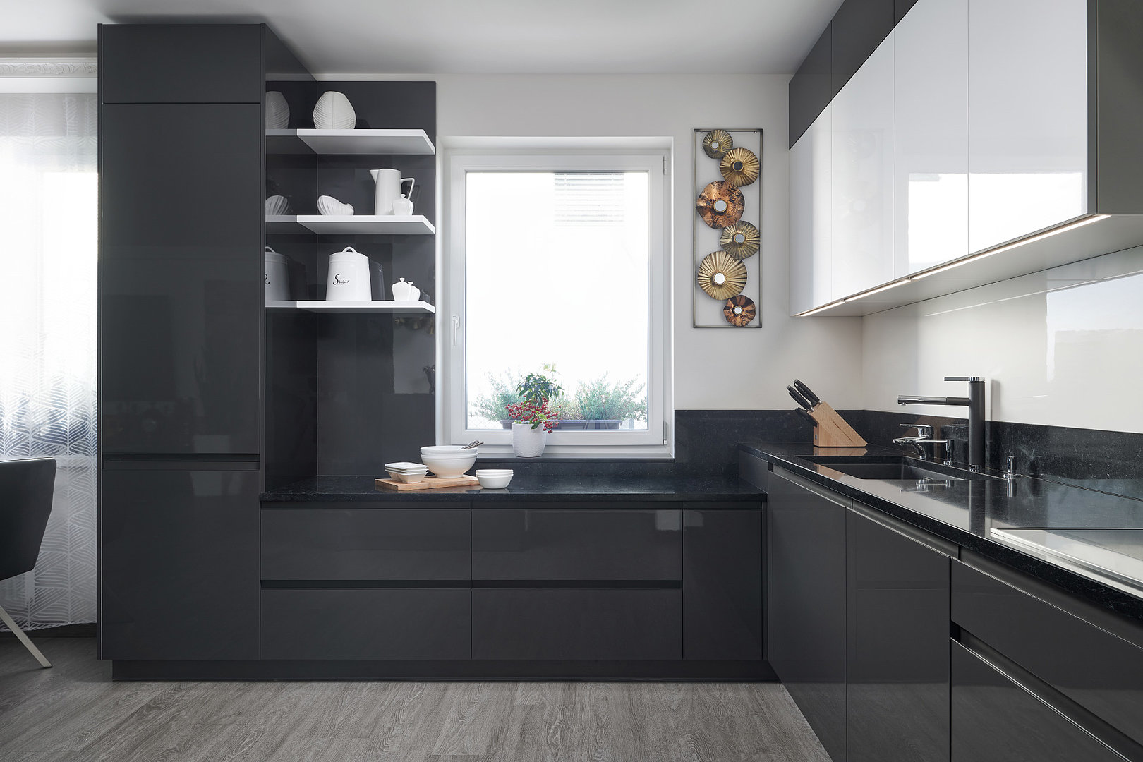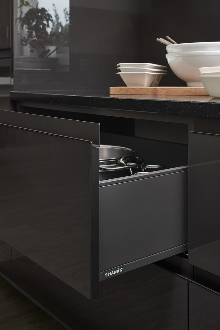 Stále více mezi zákazníky roste oblíbenost šedých povrchů v interiéru, a to ať už se jedná o světlejší či tmavší provedení. V naší další realizaci dominuje tmavý lak titan star ve vysokém lesku, doplněný o bílé skříňky a police, které kuchyni dodávají na jemnosti a eleganci.