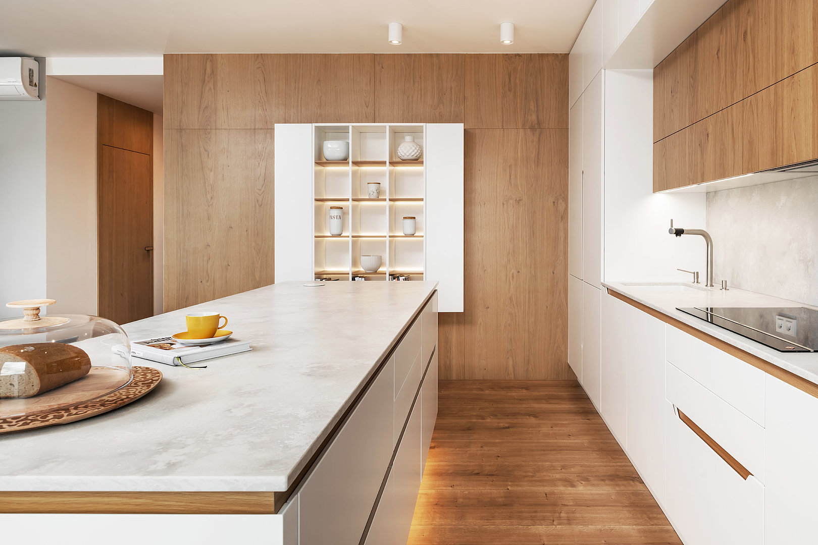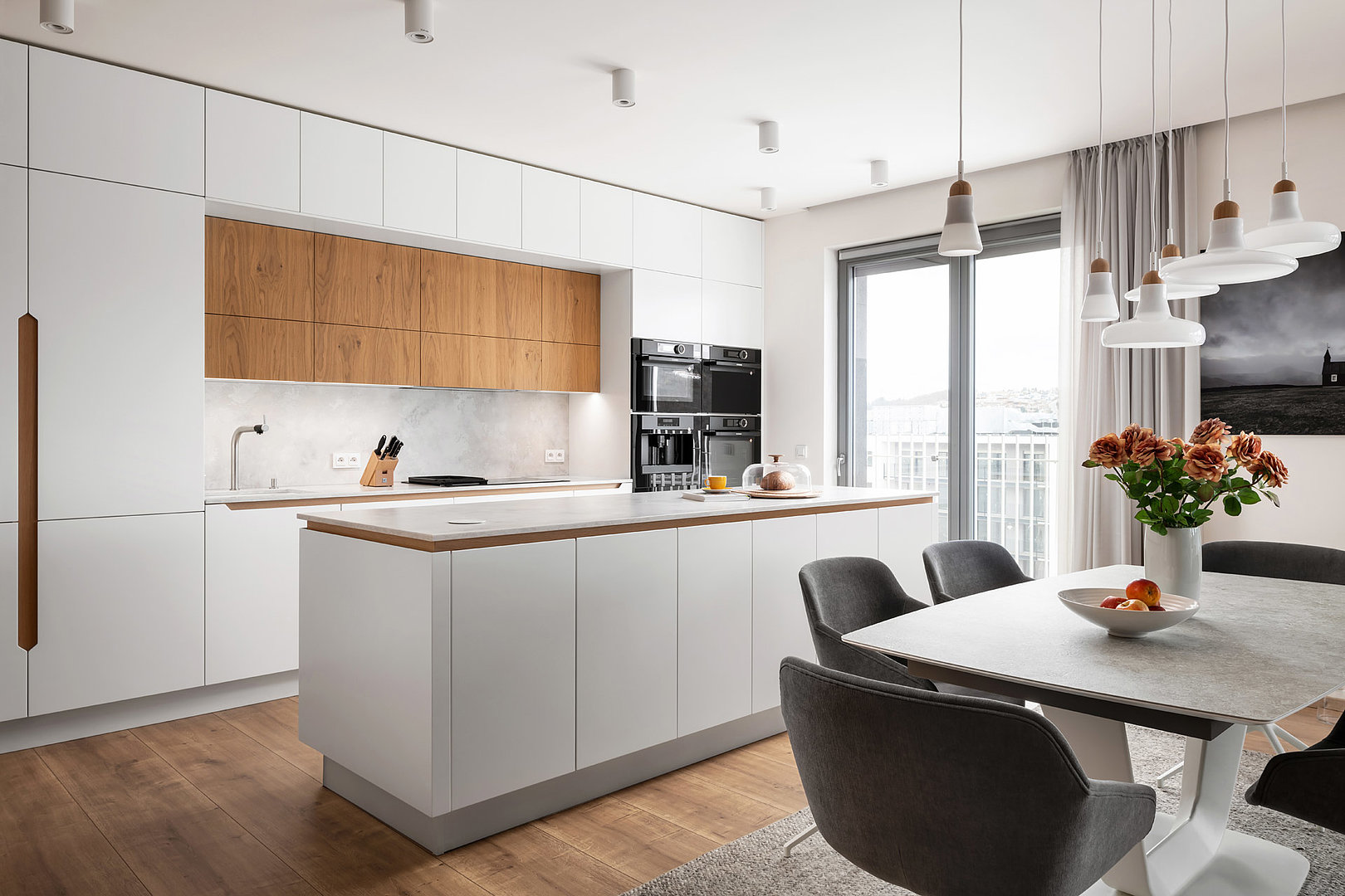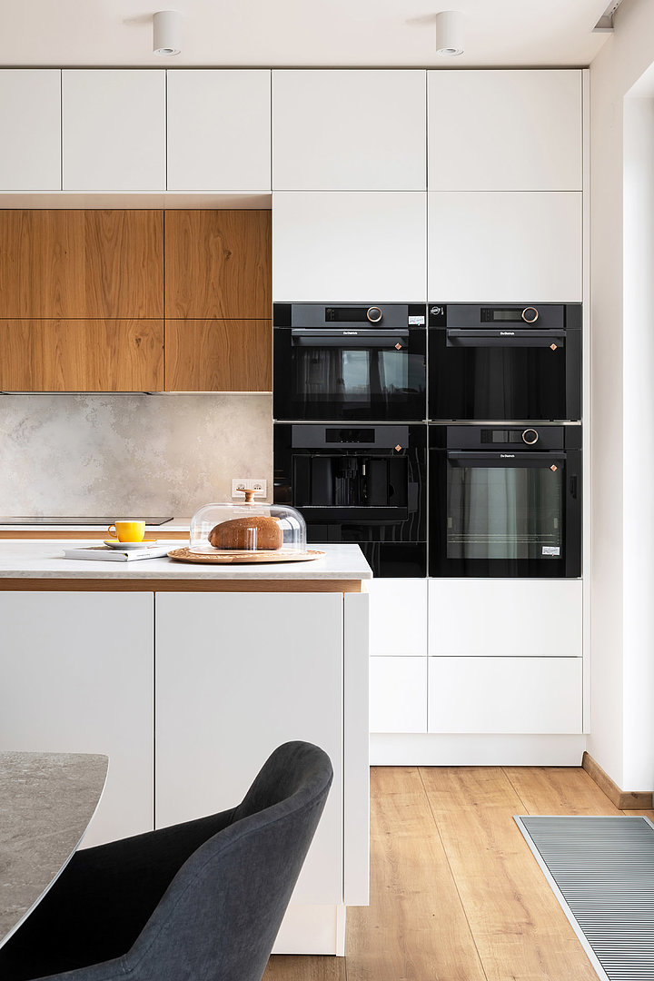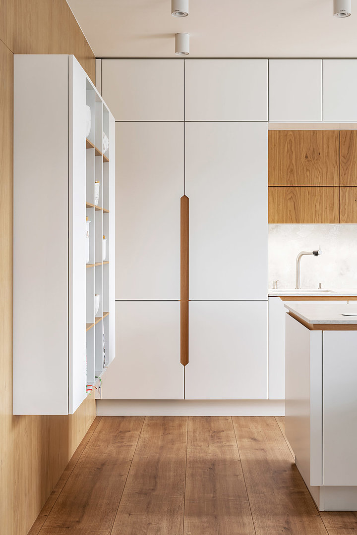 Nadčasová sestava kuchyně modelu SOLID/LINE v bílém matné laku v kombinaci s přírodní dýhou. Bez povšimnutí nezůstane detail otevírání vysokých skříní, který dává vyniknout dýze.