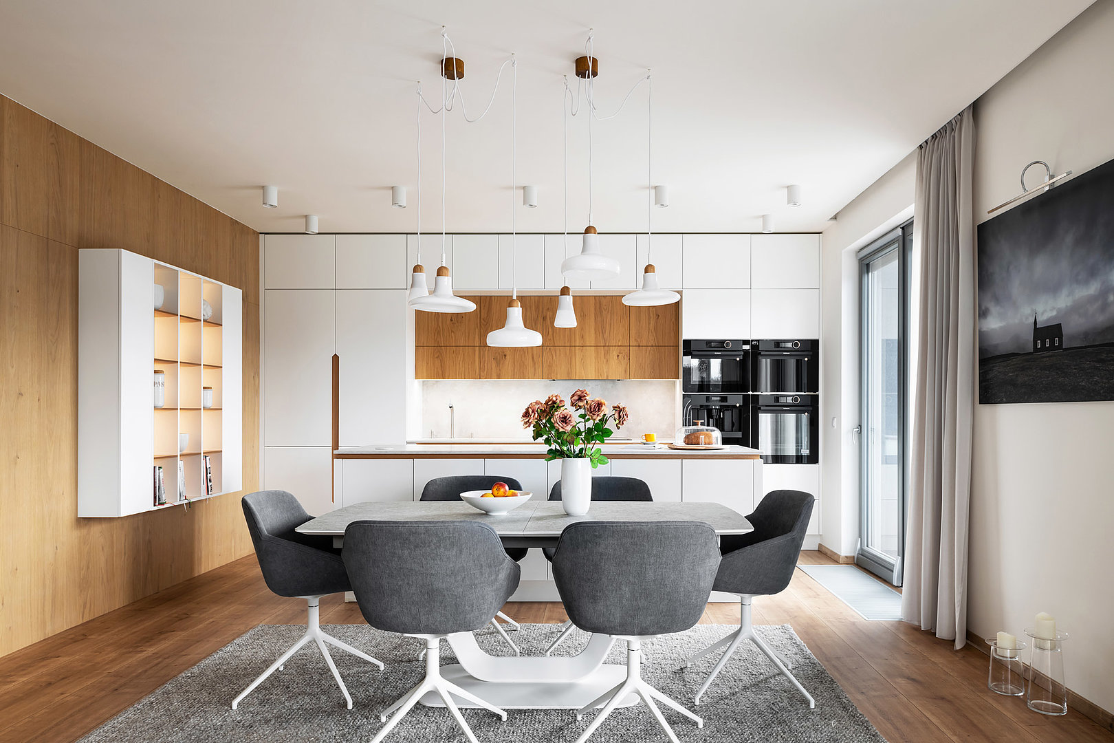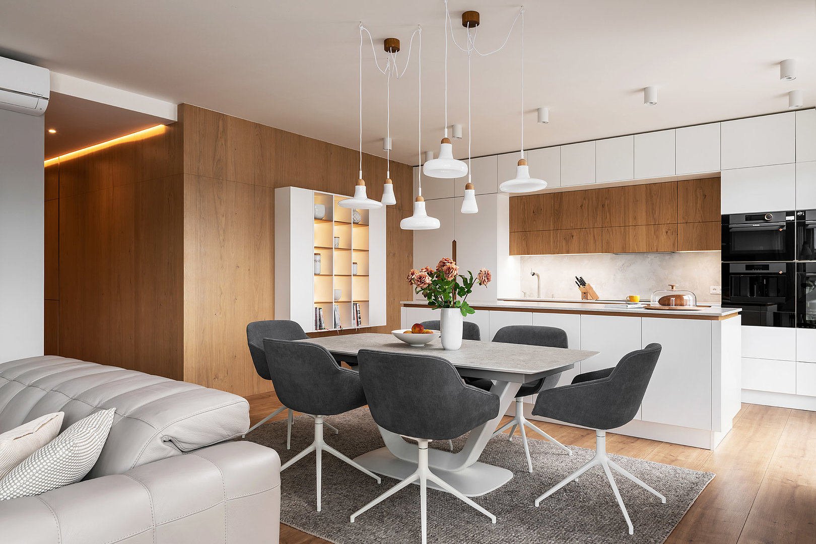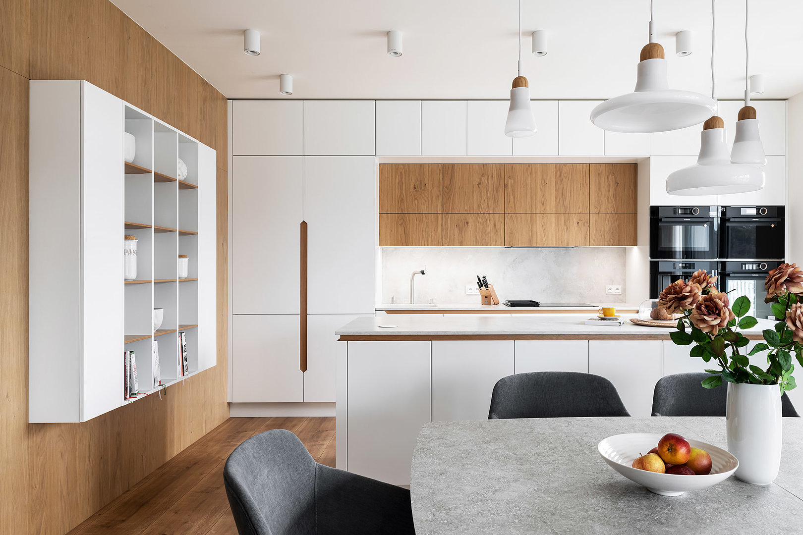 Nadčasová sestava kuchyně modelu SOLID/LINE v bílém matné laku v kombinaci s přírodní dýhou. Bez povšimnutí nezůstane detail otevírání vysokých skříní, který dává vyniknout dýze.