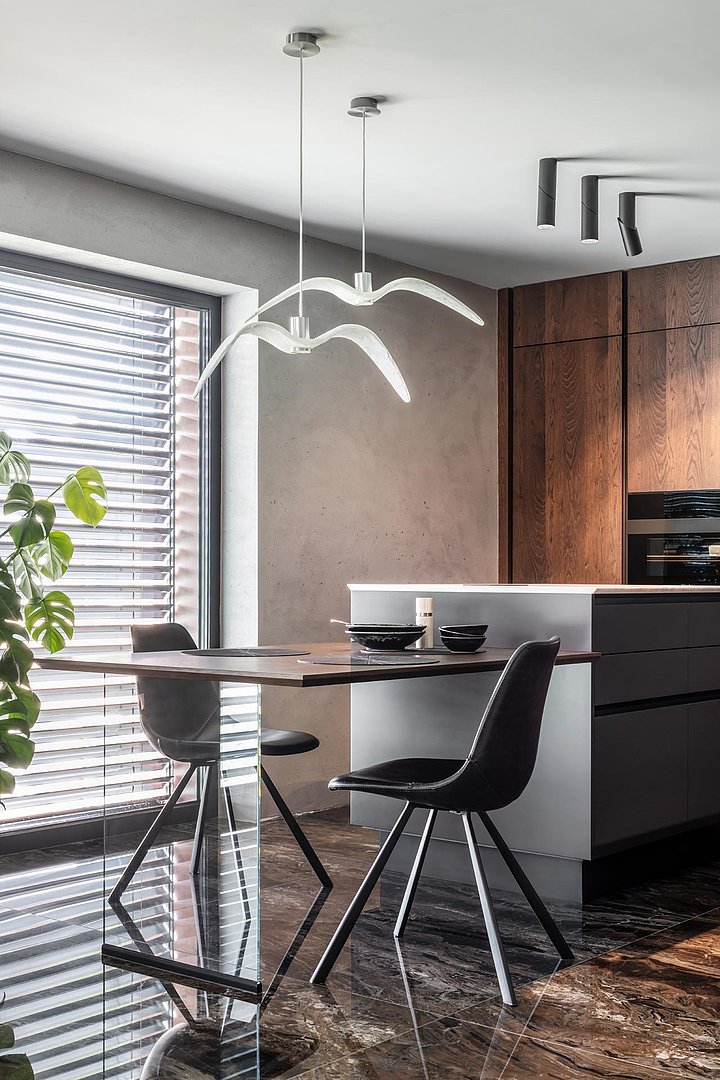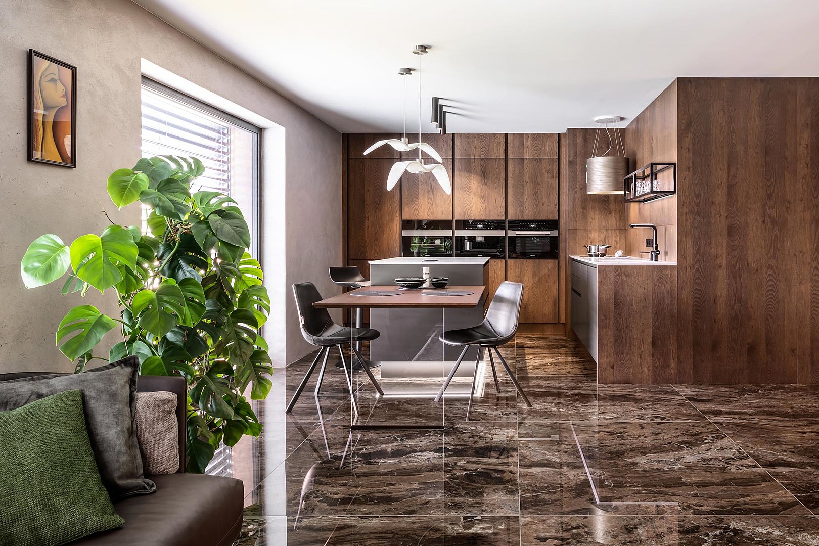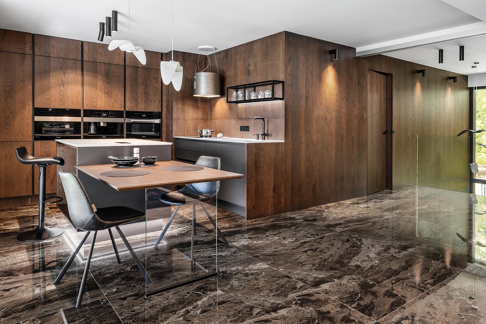Kuchyně v osobitém interiéru s tmavou rustikální dýhou