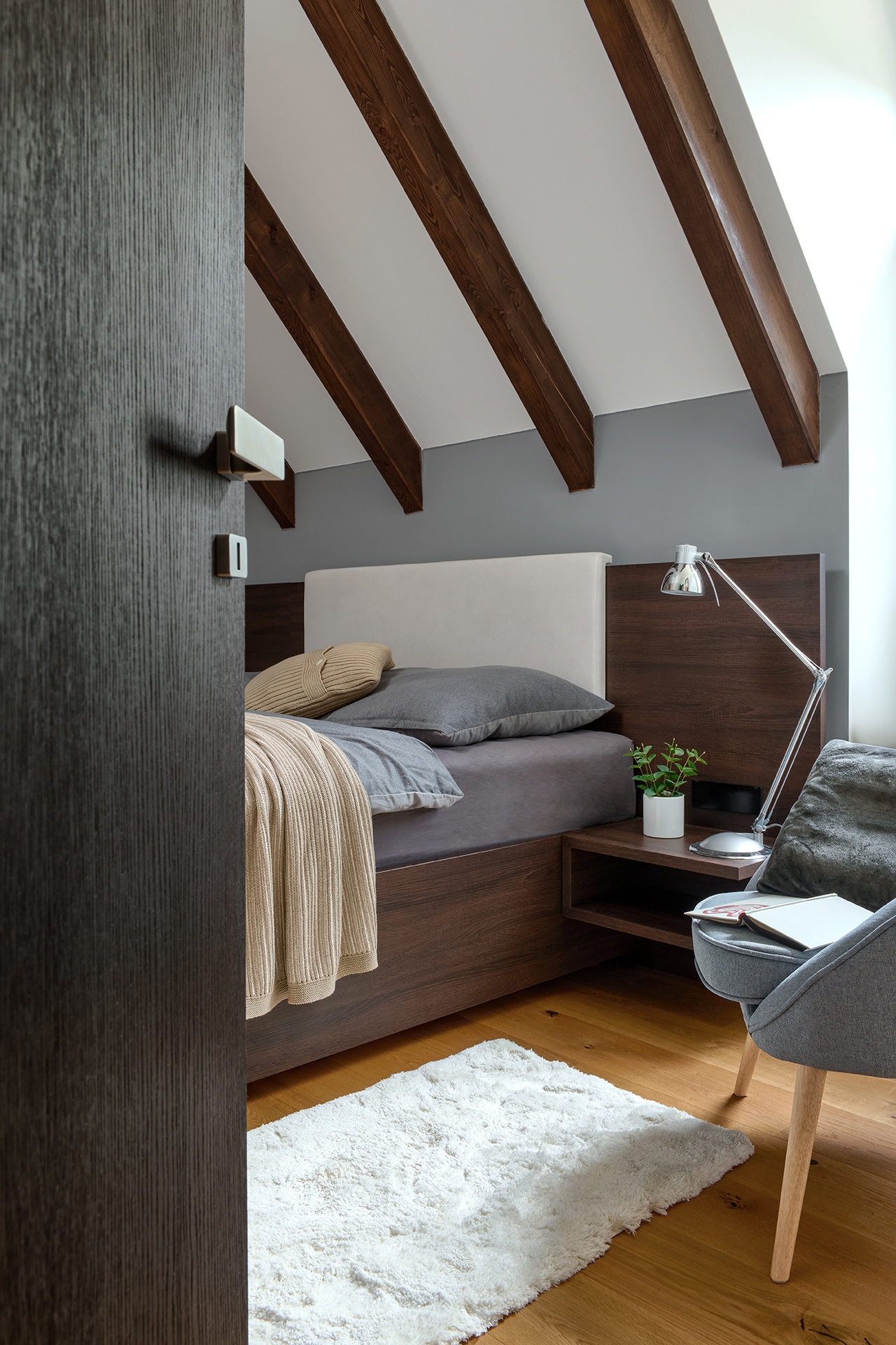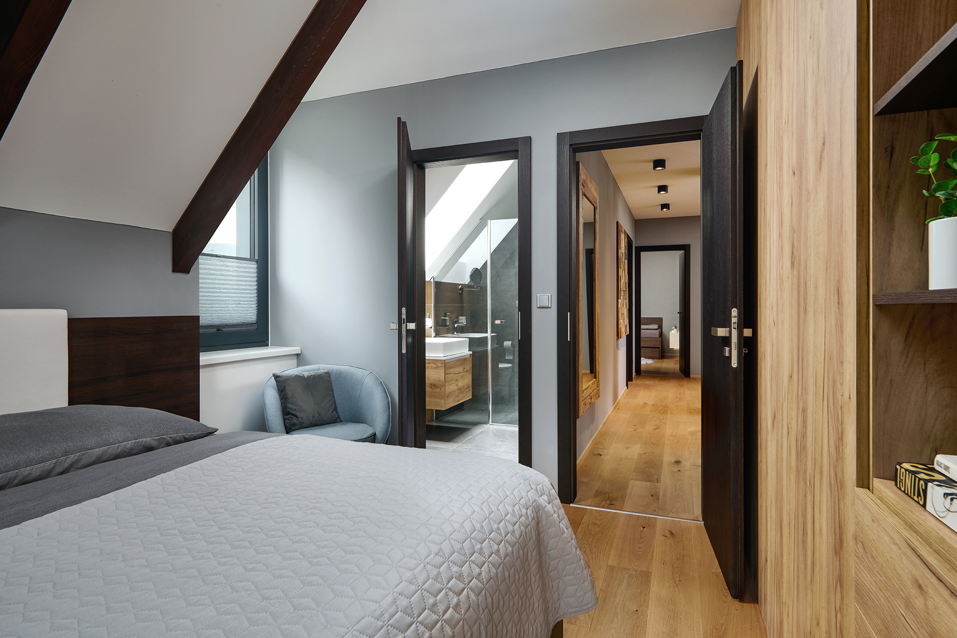 Prostor pro spánek musí působit uklidňujícím dojmem. Tyto ložnice v podkroví staví na promyšleném kontrastu - klidné šedé tóny stěn a šikmých ploch zjemňuje přirozené teplo dřeva.