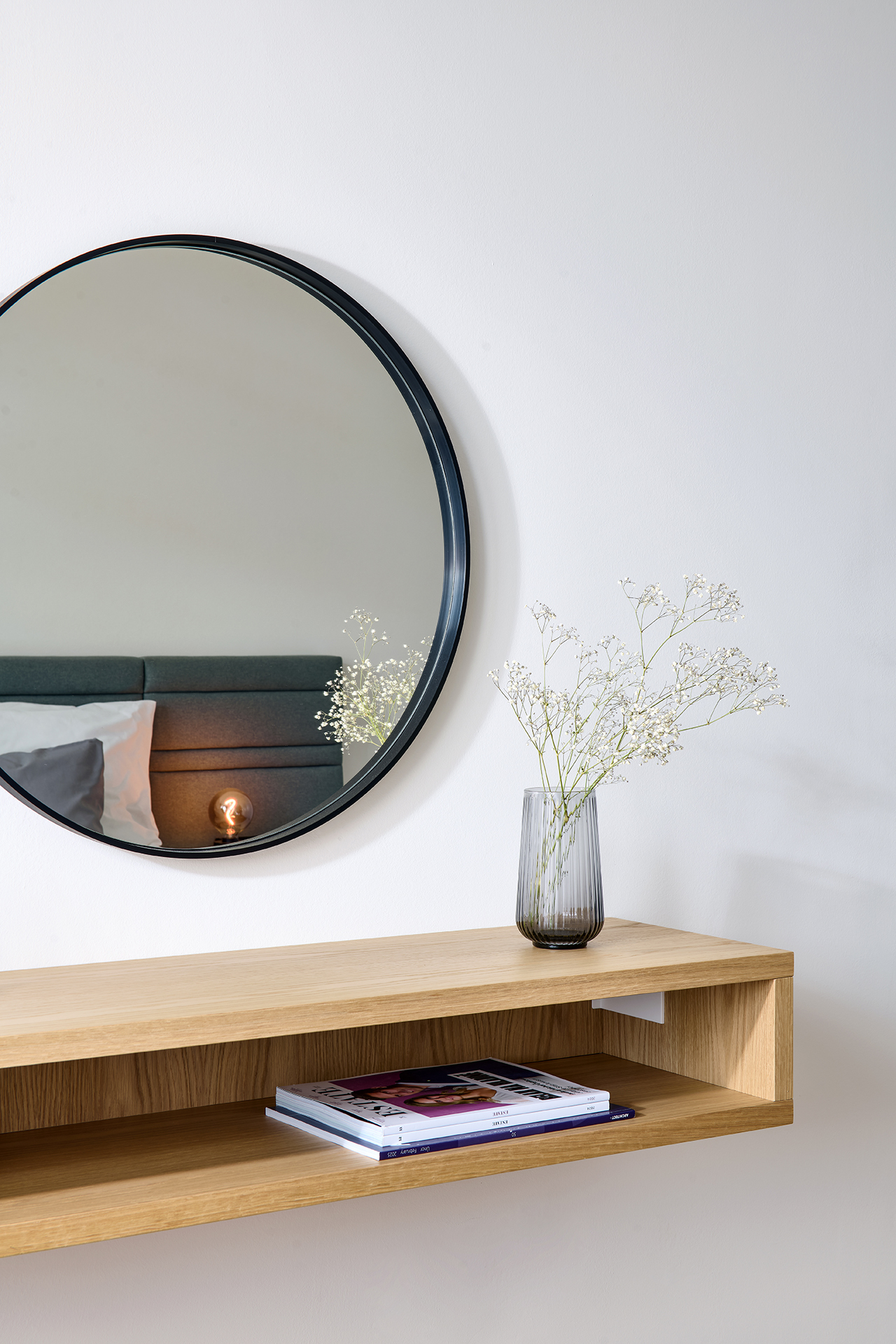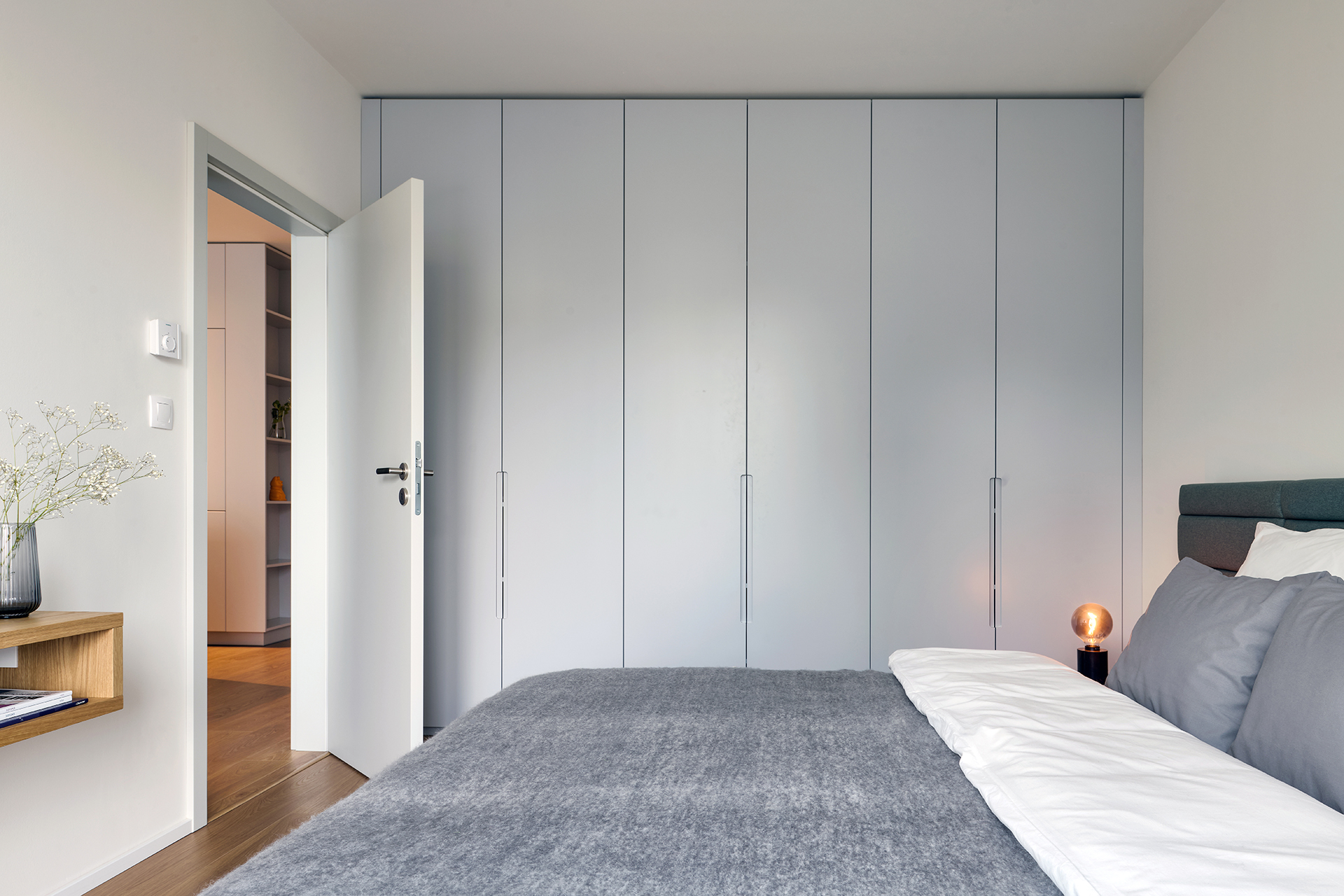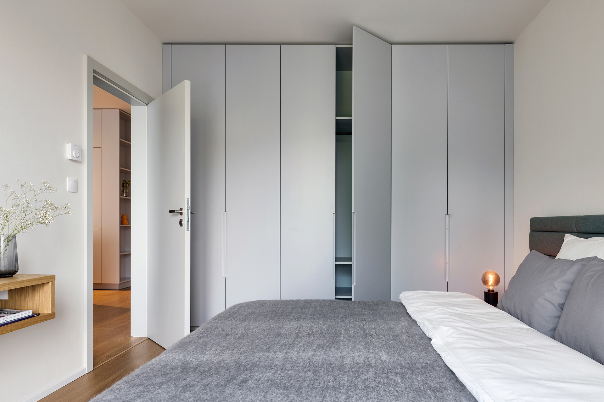 Ložnice je místem klidu a odpočinku, kde jednoduchost potkává pohodlí. Šatní skříň LINE v jemném šedém odstínu light grey mat se zajímavou frézovanou úchytkou Vienna a postel CHARLOTTE z přírodní dýhy dub americký ladí s celkovým konceptem interiéru. Prostor doplňuje toaletní stolek se zrcadlem a měkký čalouněný taburet TABU, které dodávají pokoji osobitost a příjemnou útulnost.