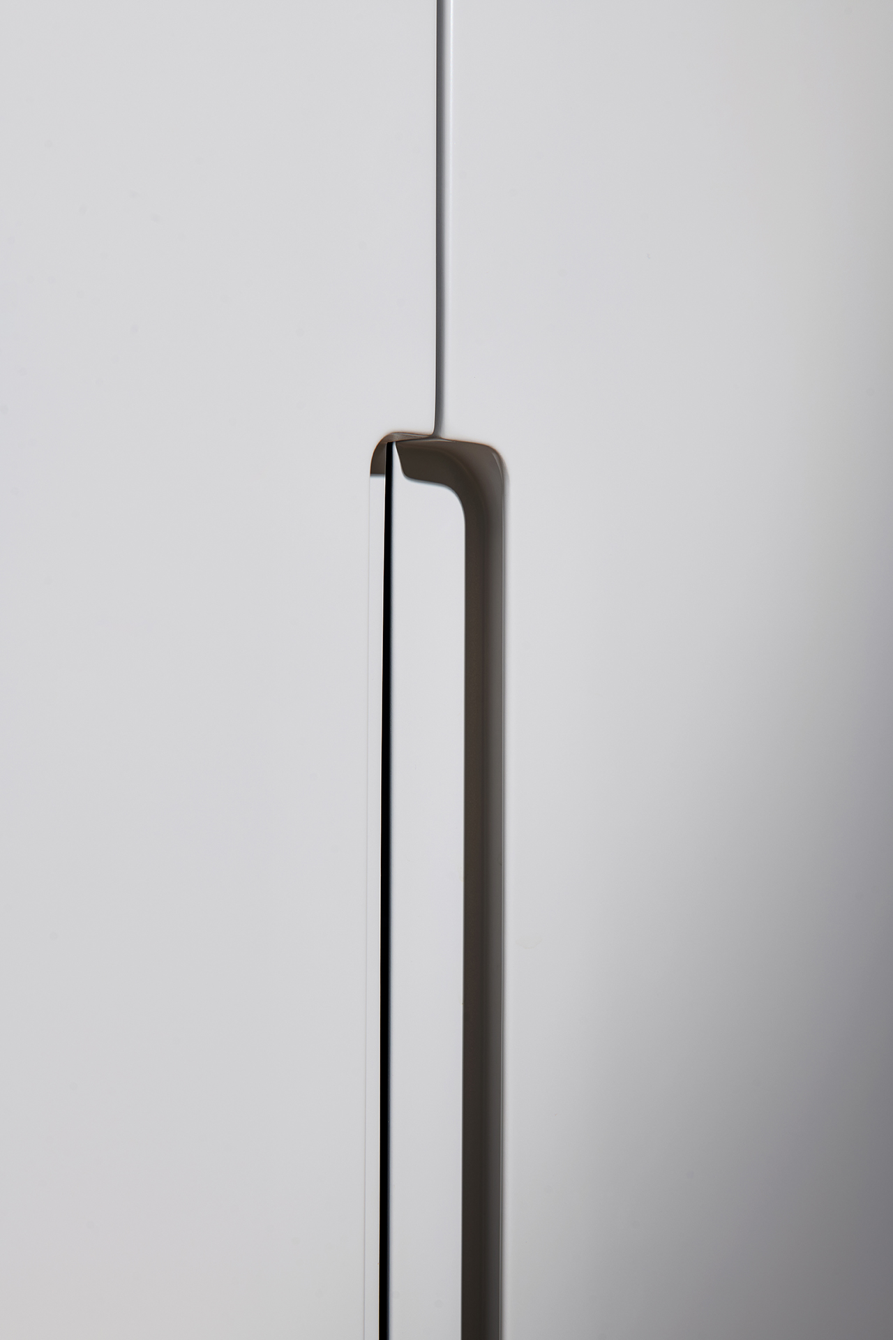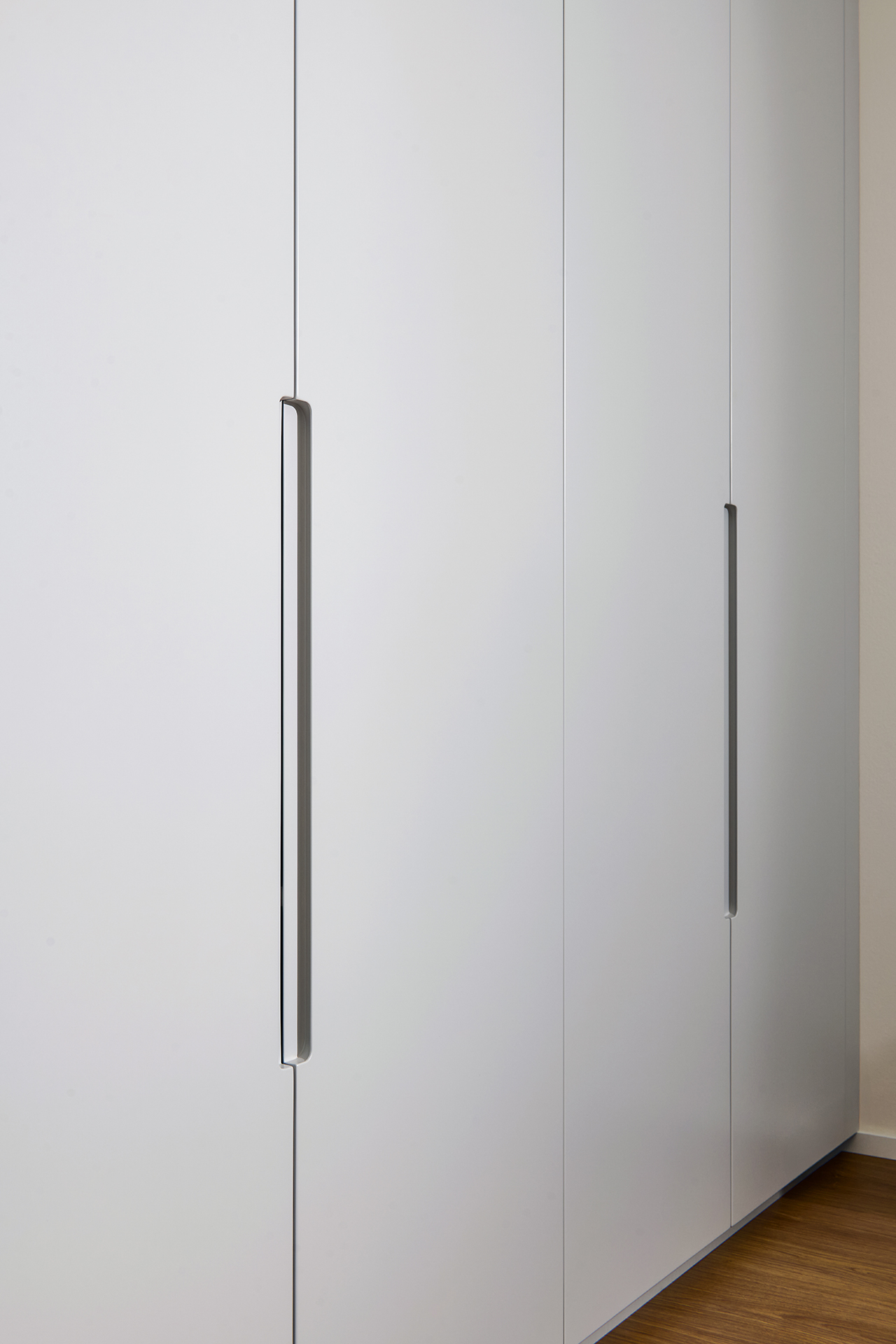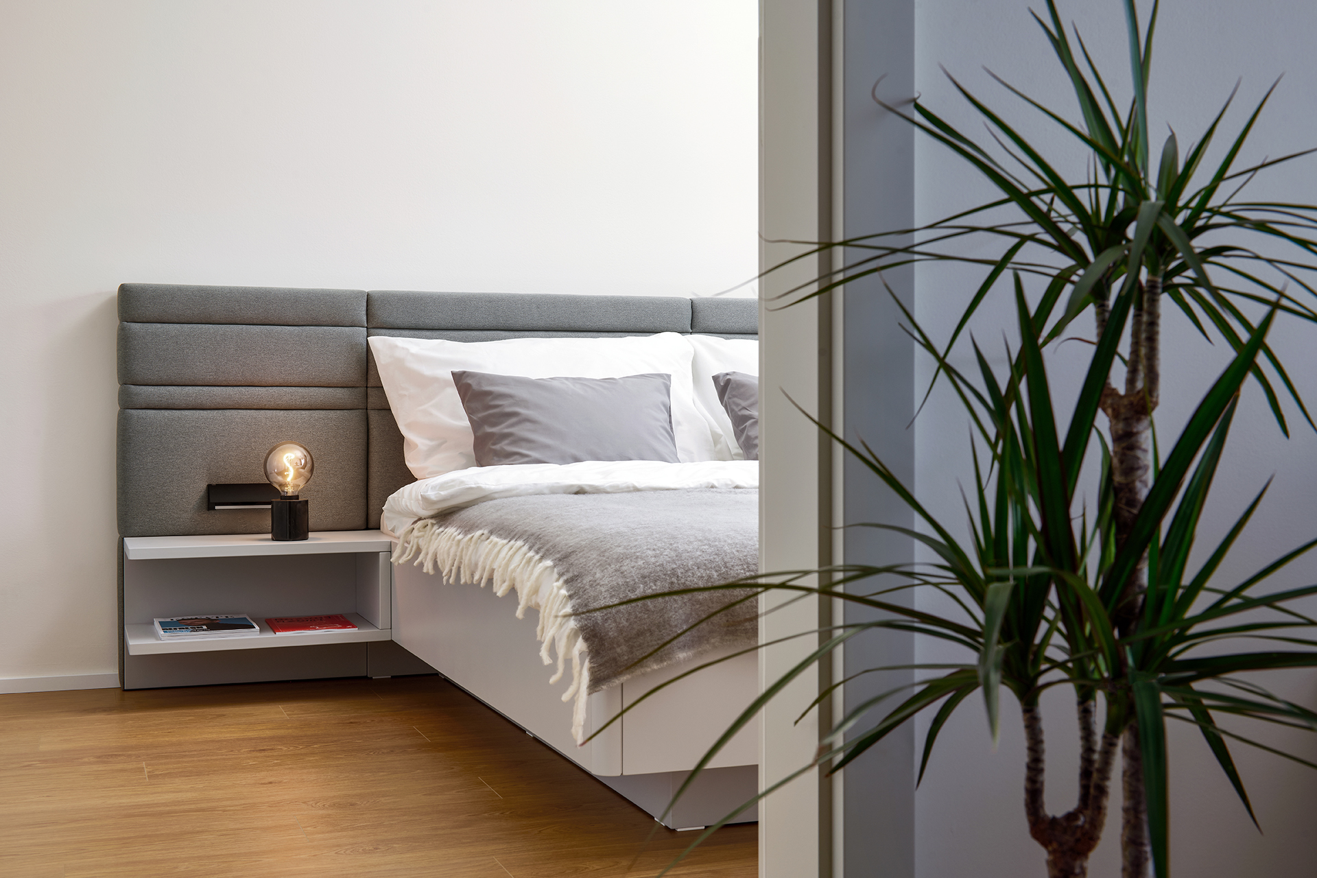 Ložnice je místem klidu a odpočinku, kde jednoduchost potkává pohodlí. Šatní skříň LINE v jemném šedém odstínu light grey mat se zajímavou frézovanou úchytkou Vienna a postel CHARLOTTE z přírodní dýhy dub americký ladí s celkovým konceptem interiéru. Prostor doplňuje toaletní stolek se zrcadlem a měkký čalouněný taburet TABU, které dodávají pokoji osobitost a příjemnou útulnost.