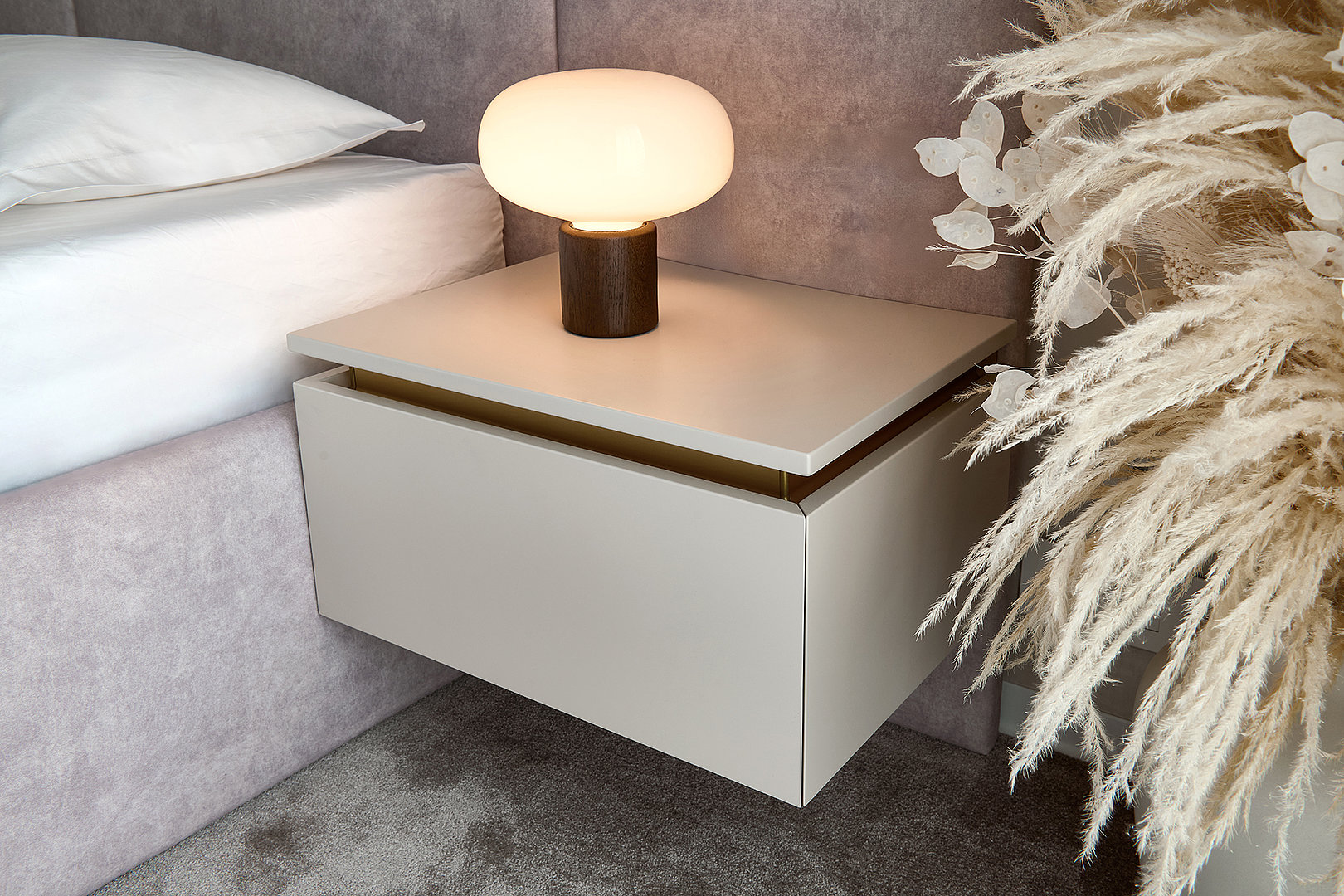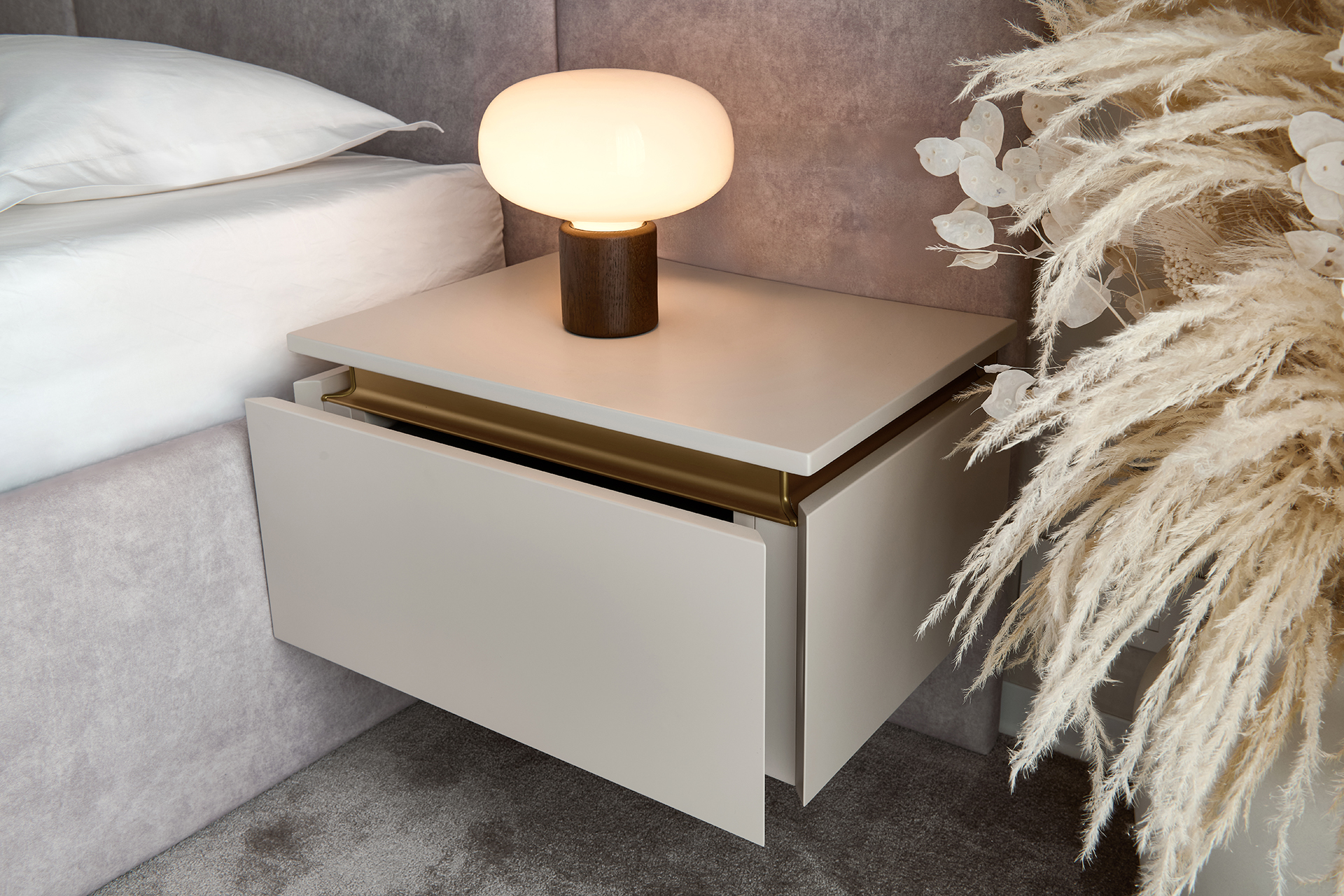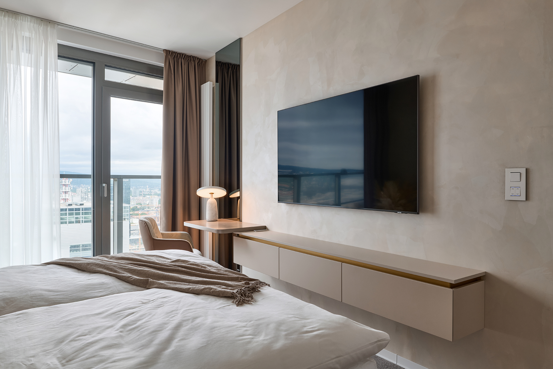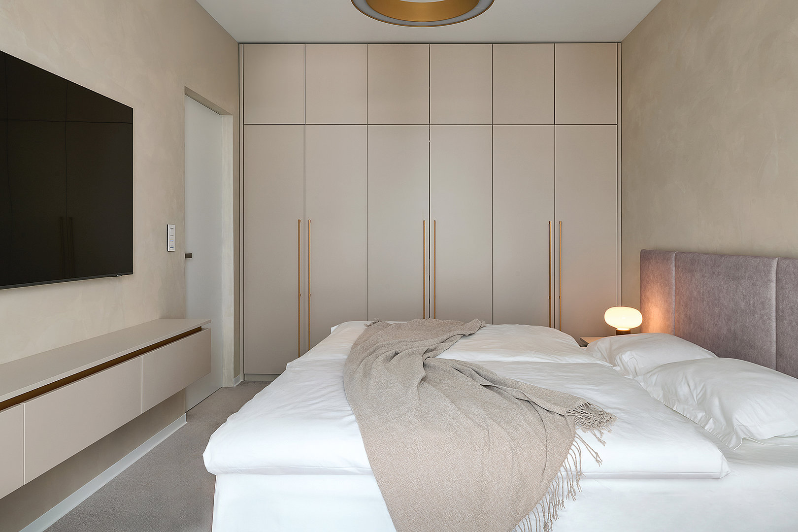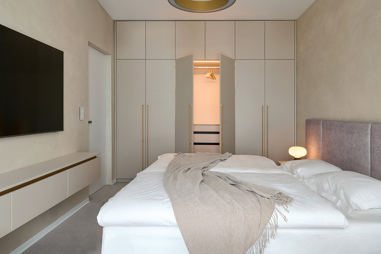 Ložnice je navržena s důrazem na funkčnost i elegantní jednoduchost. Prostorná šatní skříň LINE v dekoru Cashmere se zlatými úchytkami nabízí dostatek úložného místa pro perfektní pořádek. Součástí sestavy jsou také stylové noční stolky a praktická skříňka pod televizí, na kterou navazuje odkládací stolek, čímž vzniká harmonický a funkční celek. Celý interiér je laděný do jemných světlých tónů, které prostor vizuálně otevírají a přinášejí klidnou, relaxační atmosféru.