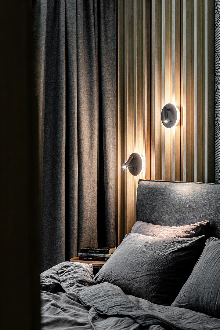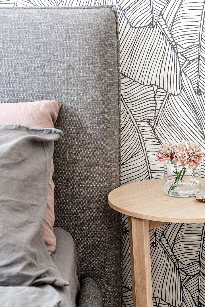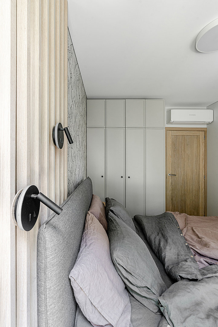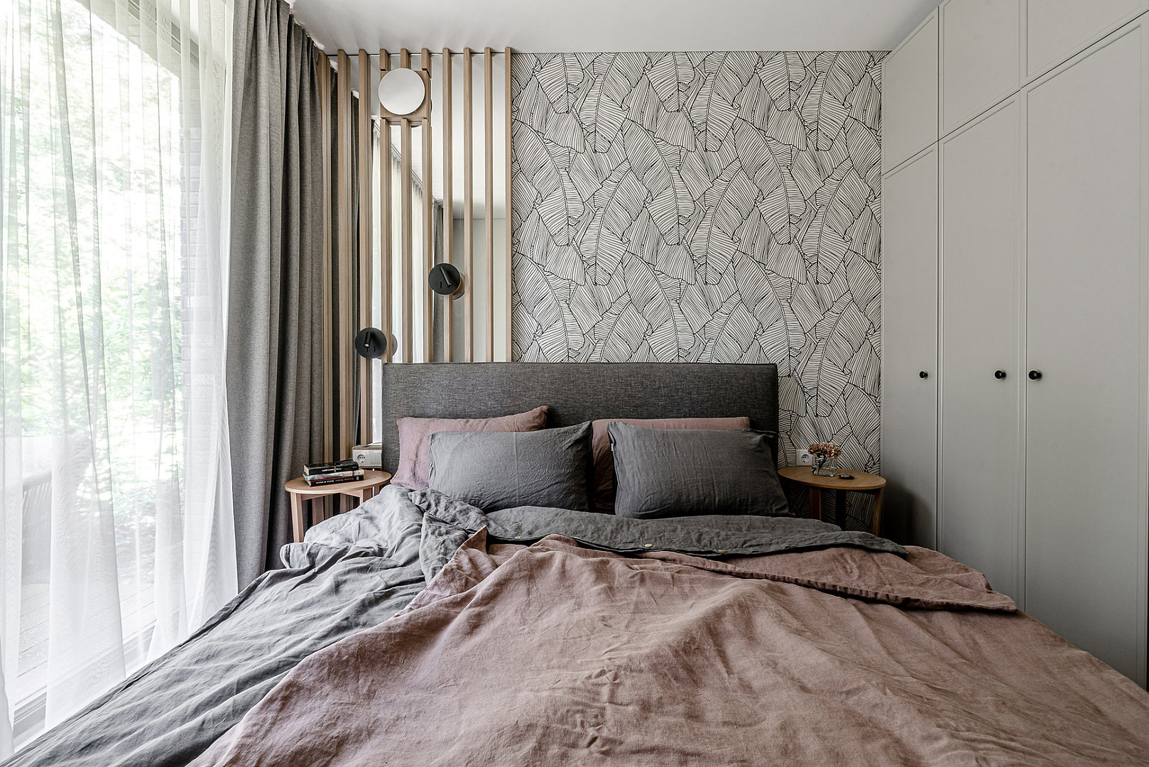 Ložnice s šatní skříní v interiéru s přírodními odstíny