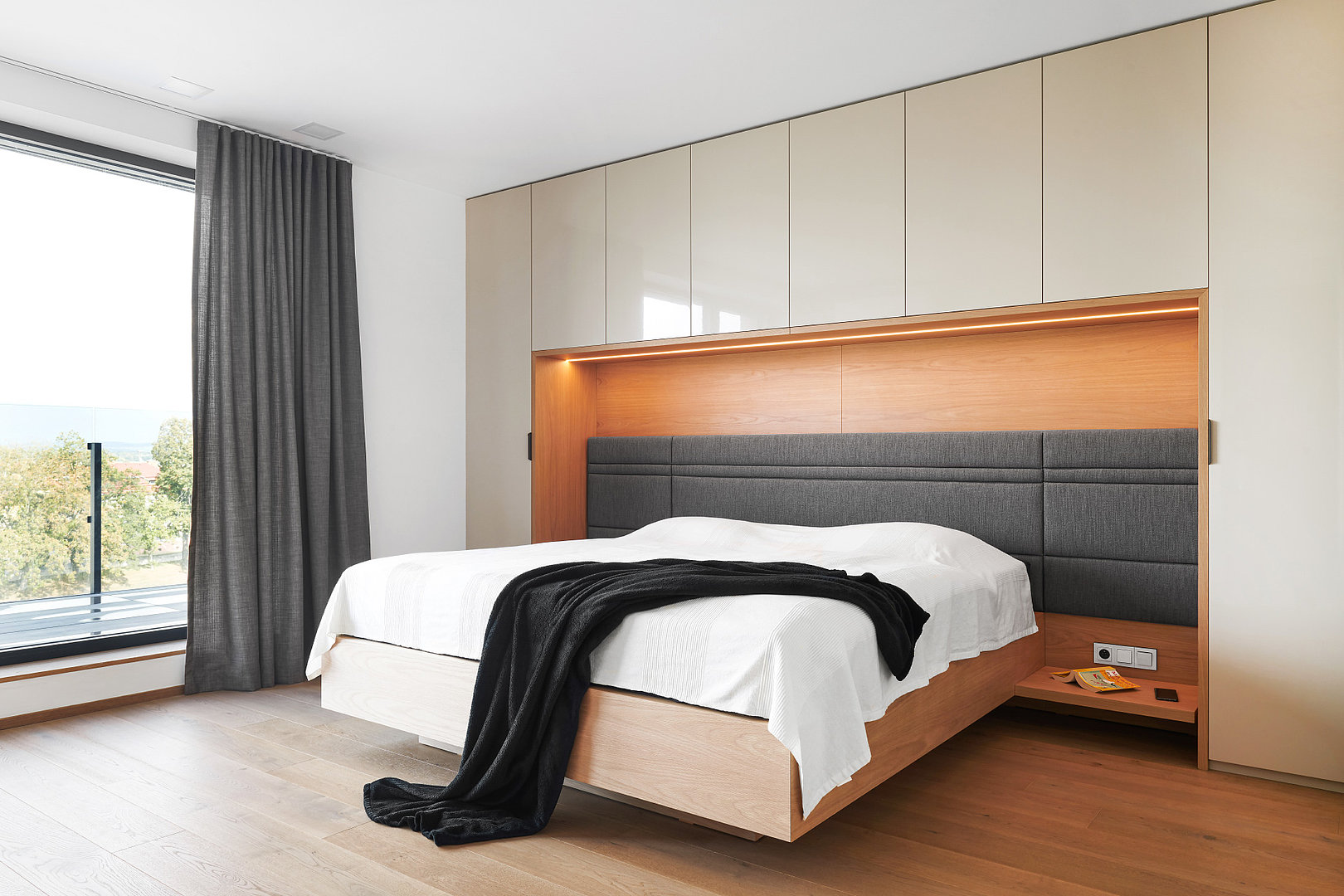 Ložnice s šatními skříněmi v prosluněném luxusním bytě s terasou