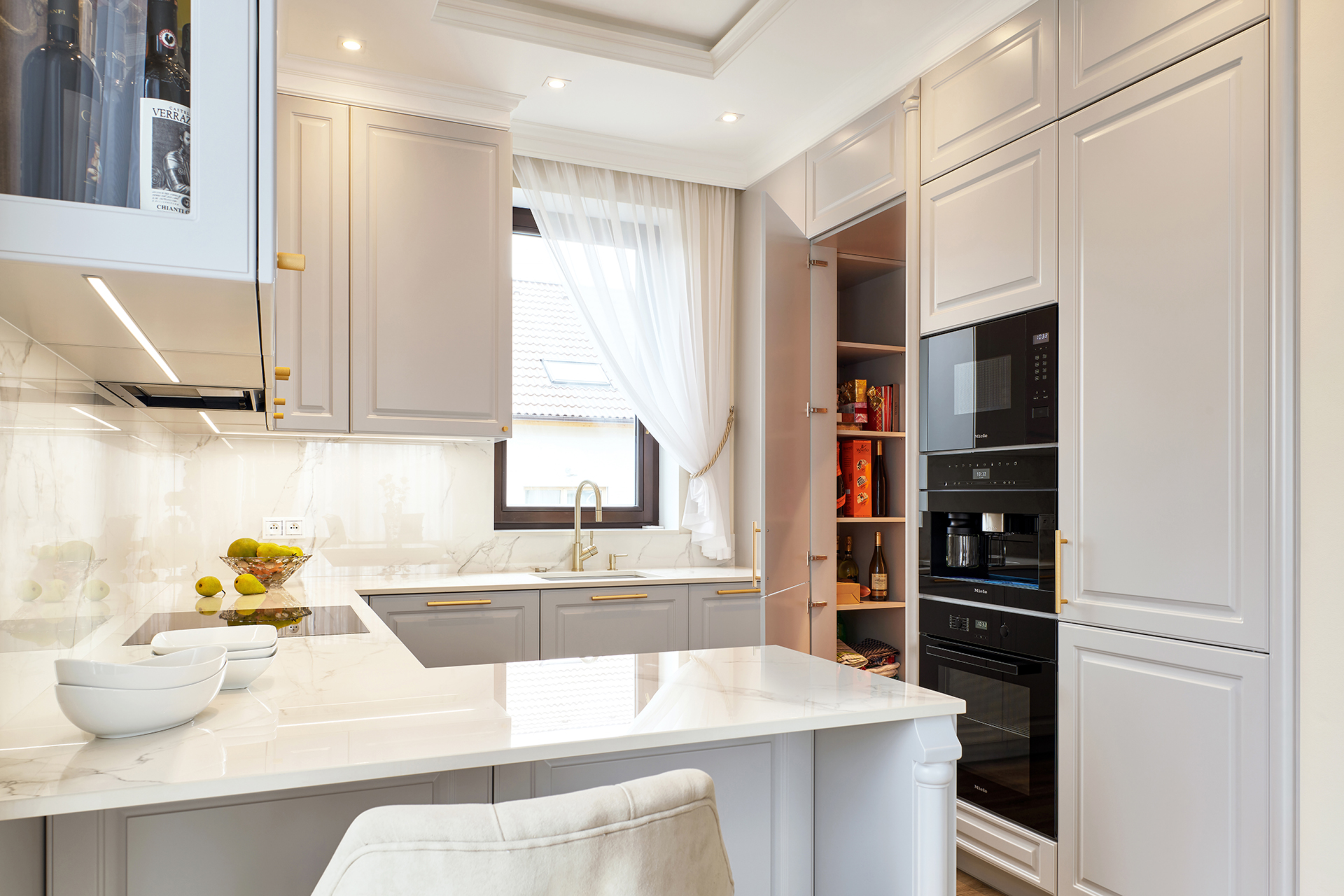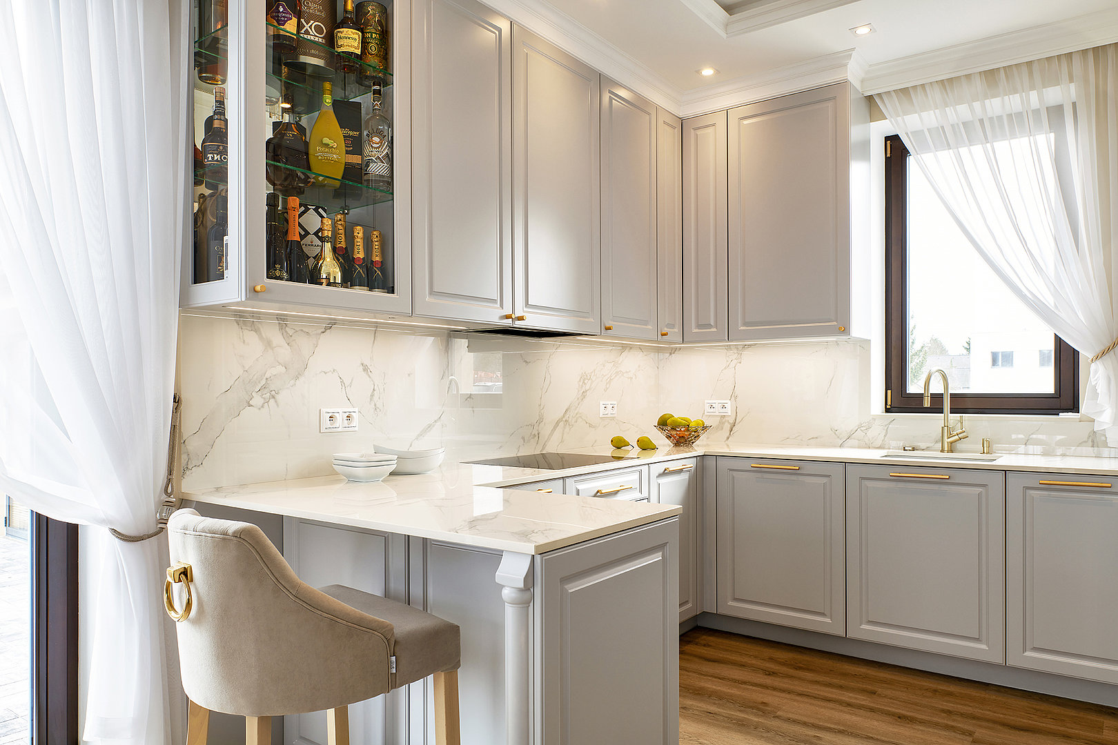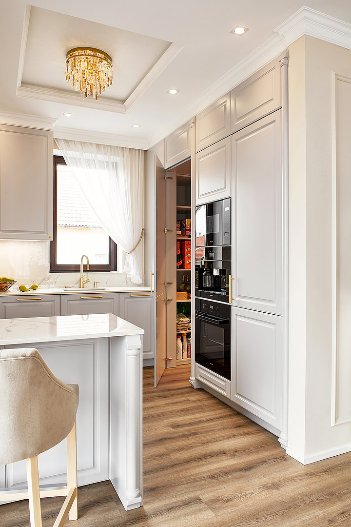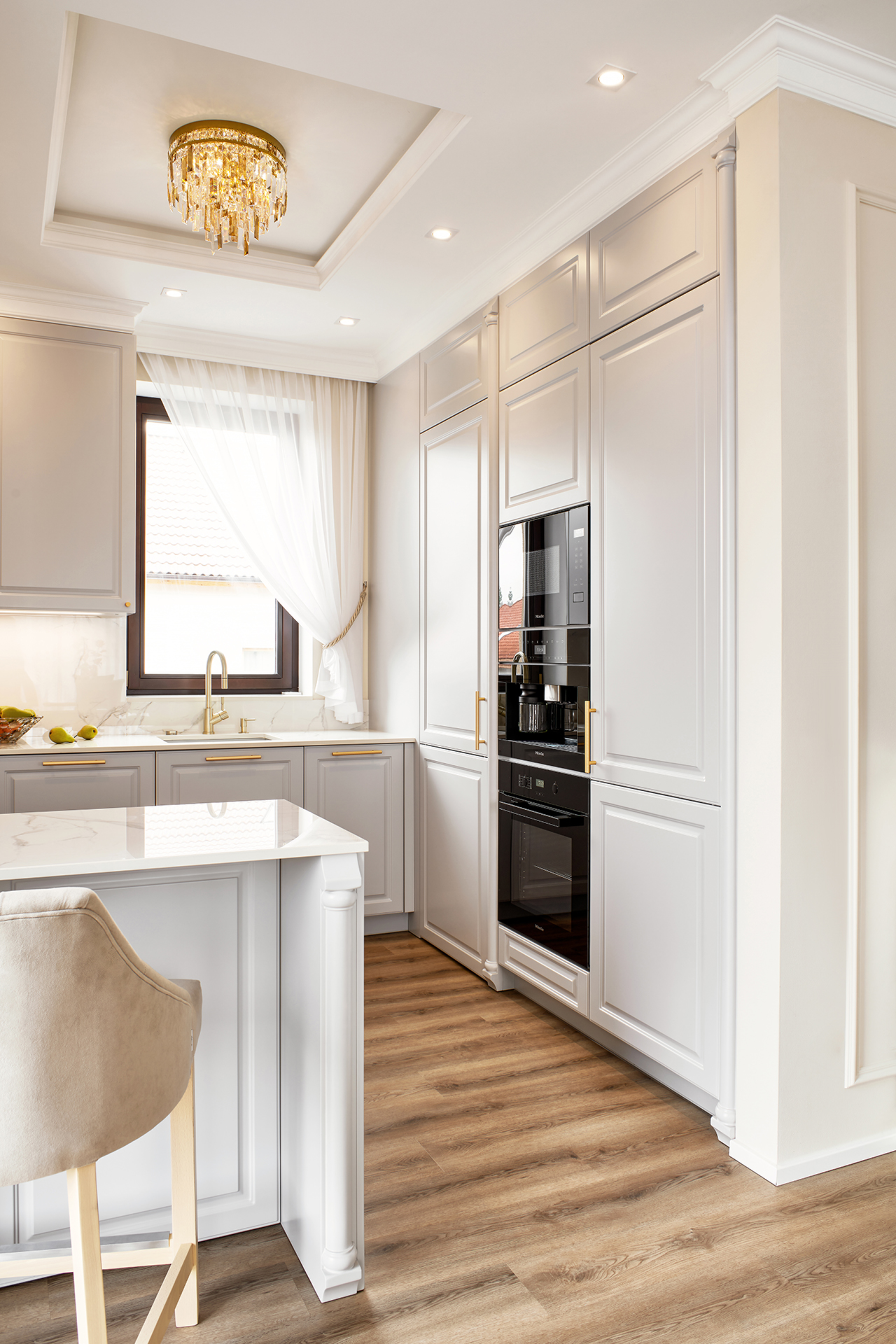 Jedná se o realizaci v novém rodinném domě v obci Zdiby. V domě se realizovala kuchyň v provedení VERONA v barvě světle šedý lak mat, doplněná krásnou pracovní deskou a obkladem Dekton v barvě Natural lesk a zlatými doplňky. Je zde rovněž důmyslně řešený vstup do spíže. V realizaci jsou také použity rustikální doplňky – ozdobné sloupky.