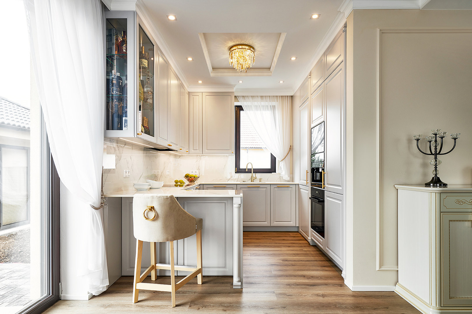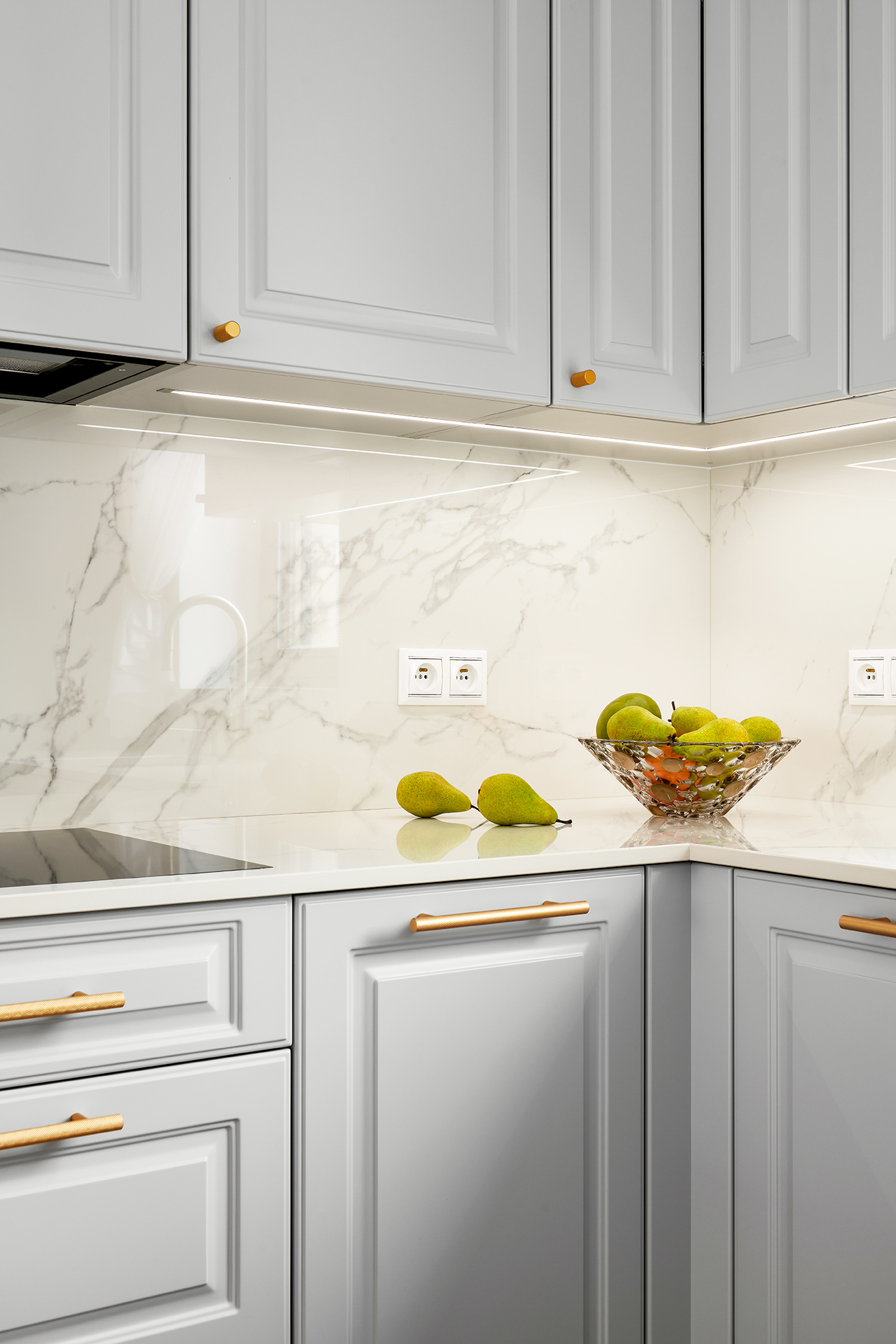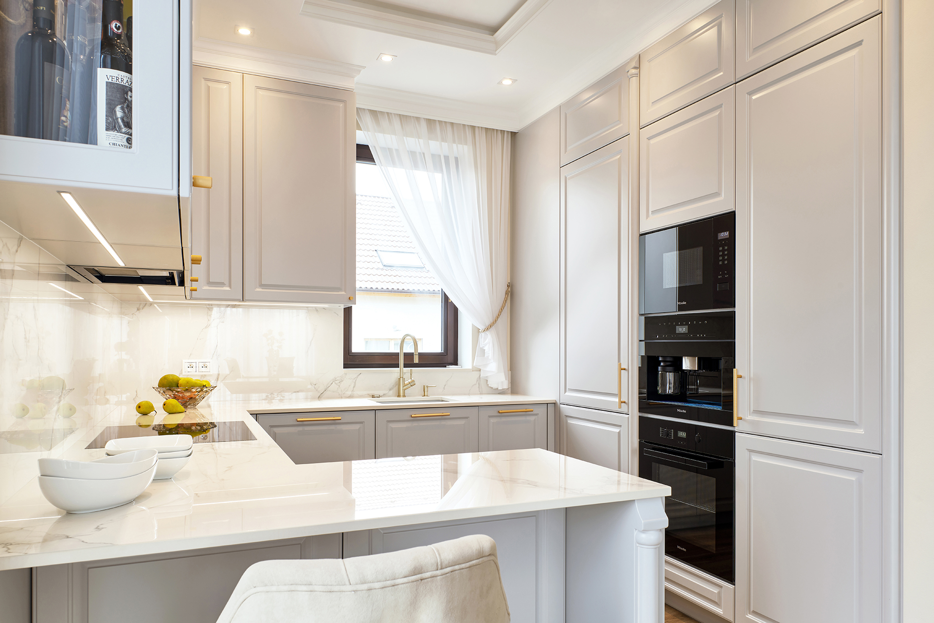 Jedná se o realizaci v novém rodinném domě v obci Zdiby. V domě se realizovala kuchyň v provedení VERONA v barvě světle šedý lak mat, doplněná krásnou pracovní deskou a obkladem Dekton v barvě Natural lesk a zlatými doplňky. Je zde rovněž důmyslně řešený vstup do spíže. V realizaci jsou také použity rustikální doplňky – ozdobné sloupky.