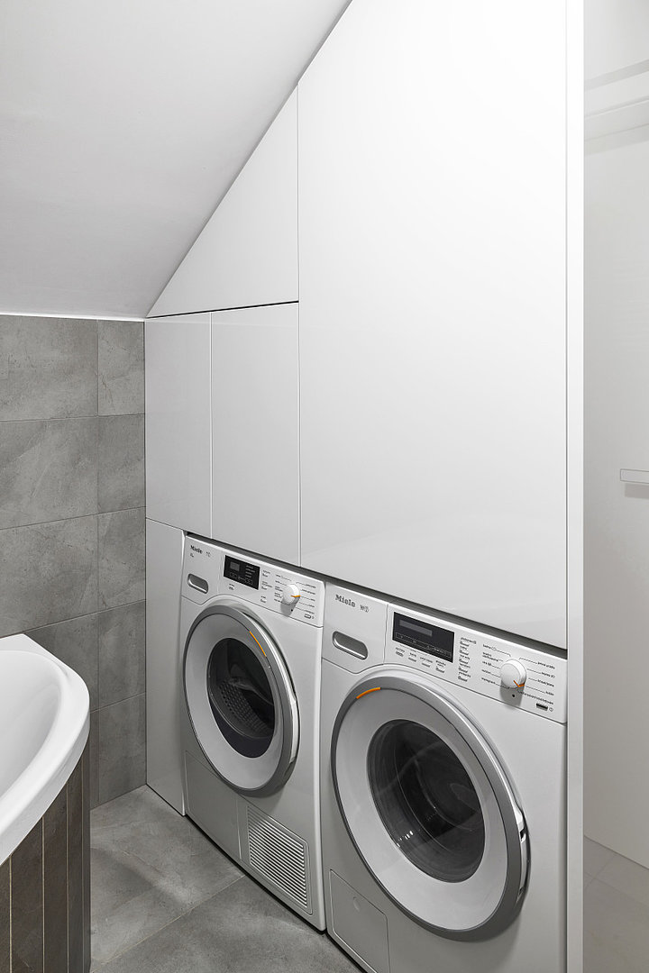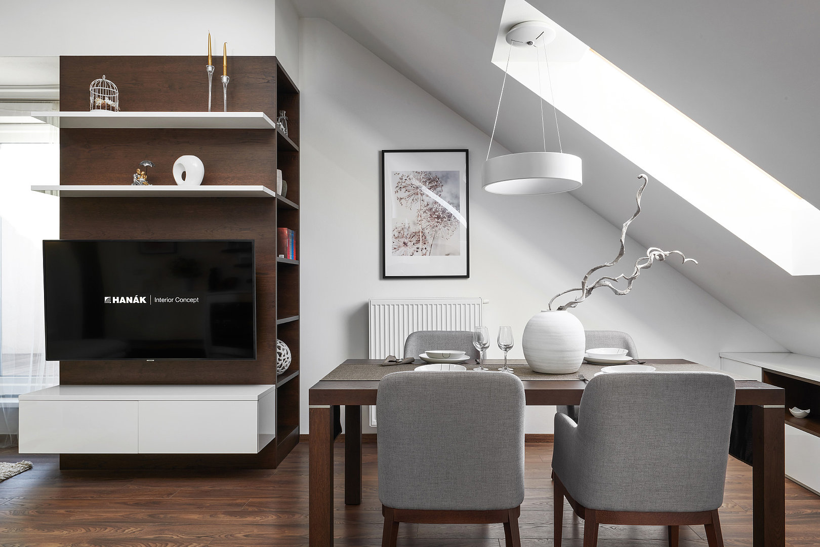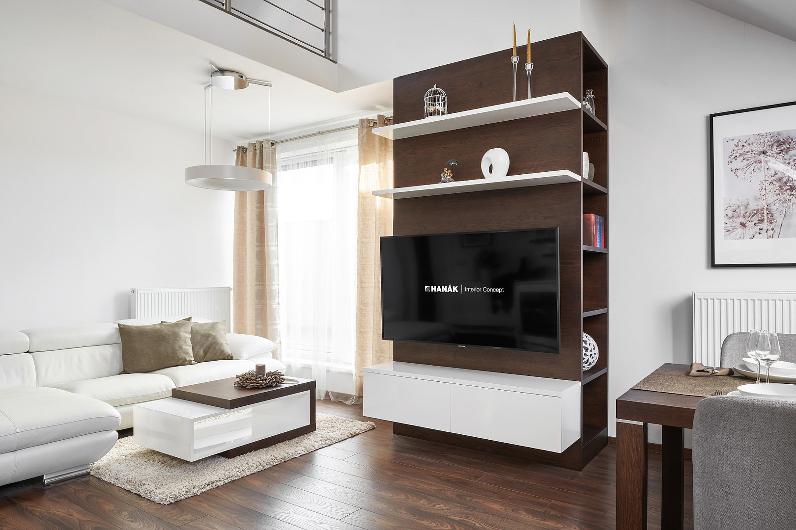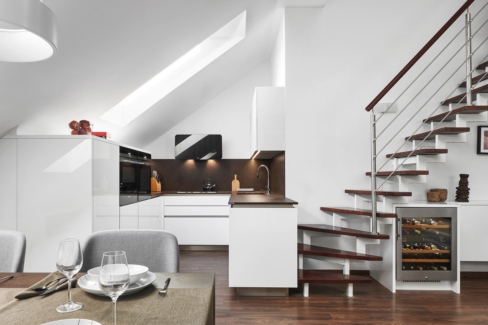 Mezonetové bydlení je populární pro svou vzdušnost. Nahlédněte do interiéru, kde si klienti zvolili kombinaci bílého laku a rustikální hnědé dubové dýhy. Celý interiér působí elegantně a nadčasově.
