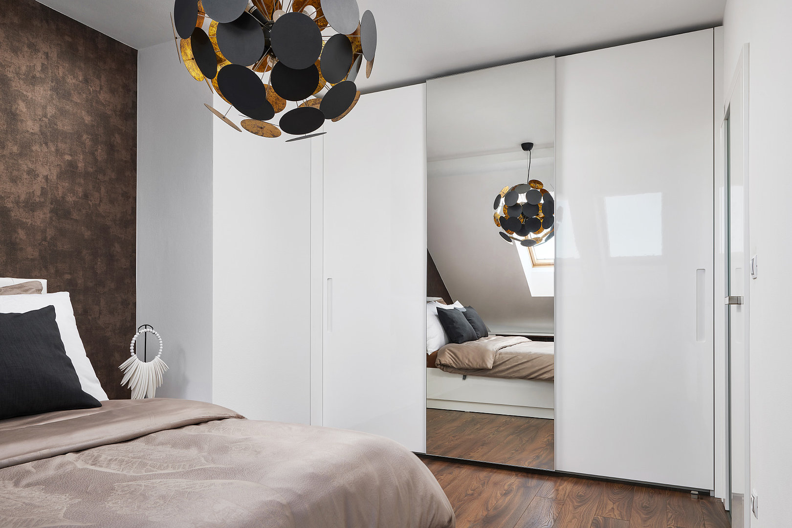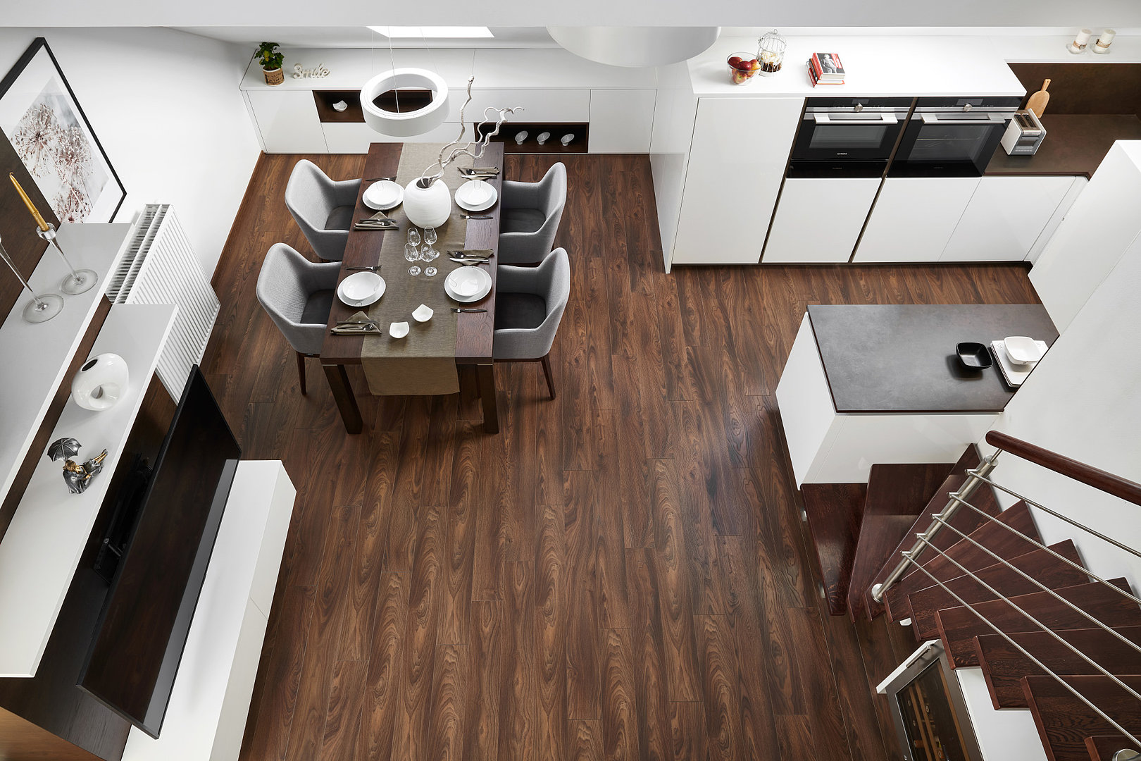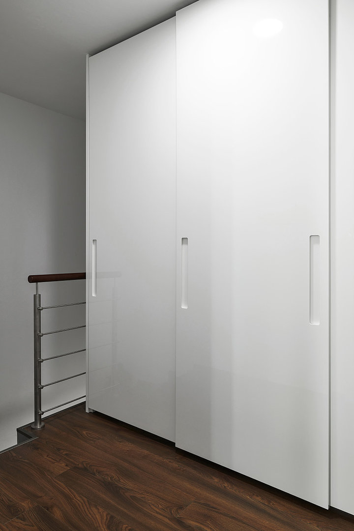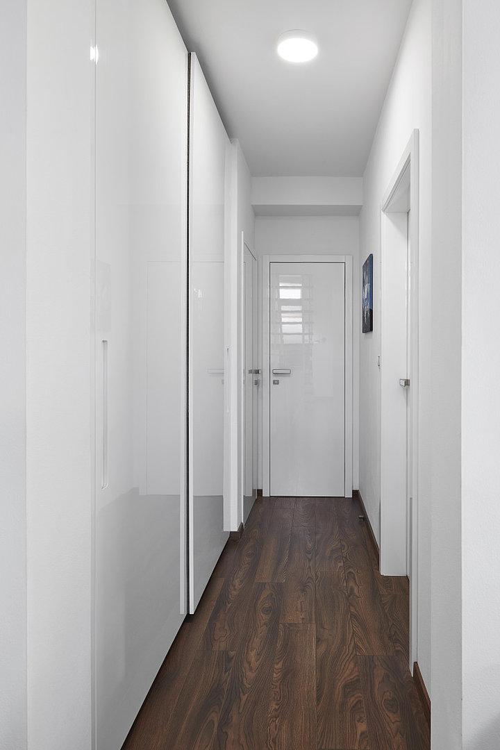 Mezonetové bydlení je populární pro svou vzdušnost. Nahlédněte do interiéru, kde si klienti zvolili kombinaci bílého laku a rustikální hnědé dubové dýhy. Celý interiér působí elegantně a nadčasově.