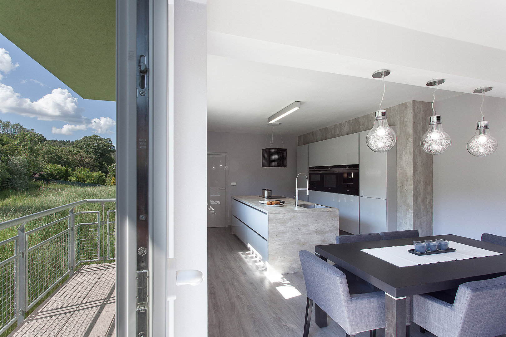 Moderně zařízený byt s kuchyní ELITE v šedém lesklém laku