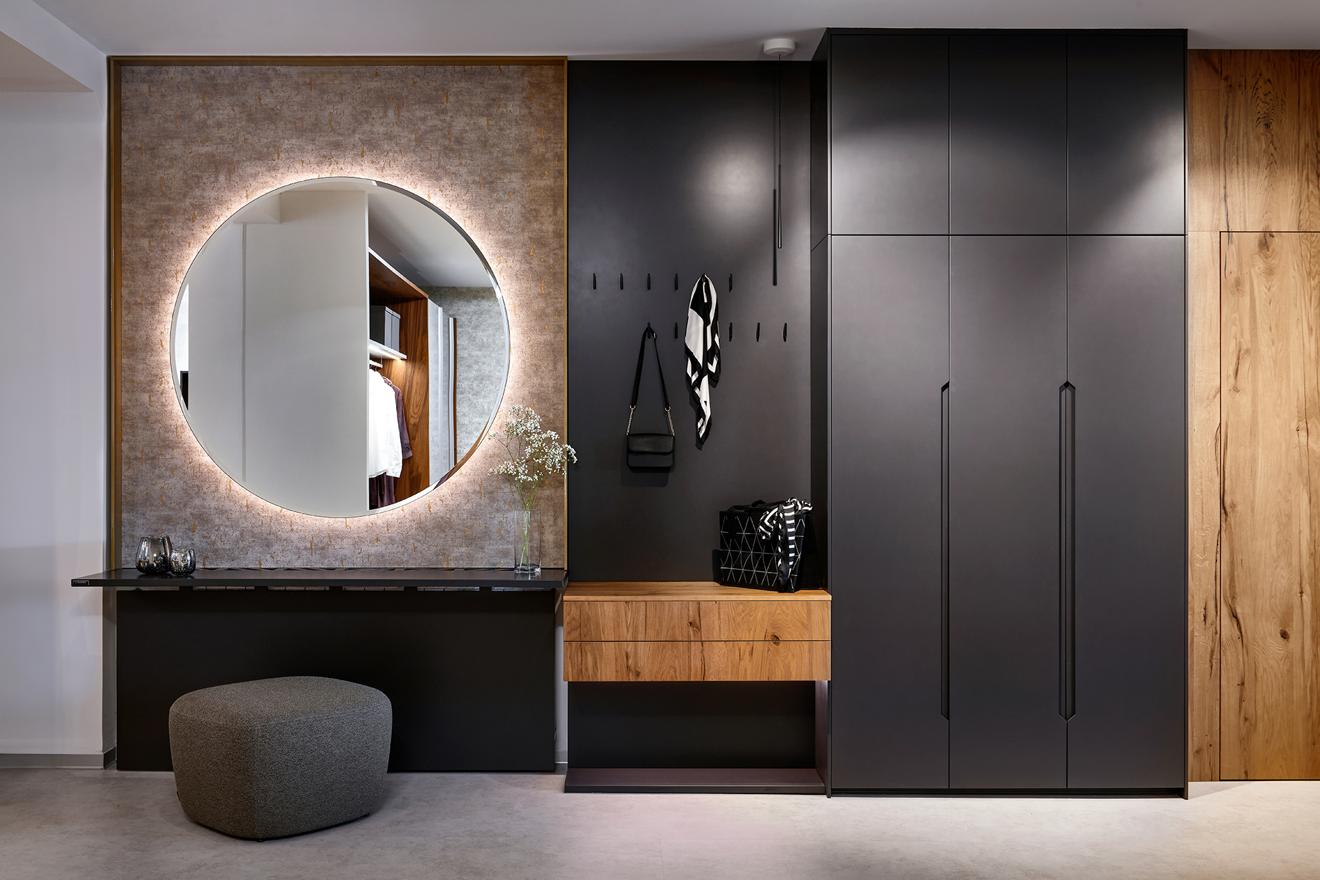 Vstupní prostor v dekoru dub selský a matném titanovém laku působí už na první pohled útulně a moderně. Dominantou celé sestavy je šatní skříň SOLID, která nabízí nejen praktický úložný prostor, ale i precizní zpracování v elegantním designu. Zrcadlo s ambientním podsvícením vytváří příjemnou atmosféru a dodává chodbě osobitý charakter. Každý detail – od závěsné komody až po jemné dekorace – byl pečlivě zvolen tak, aby prostor působil harmonicky, čistě a reprezentativně.
