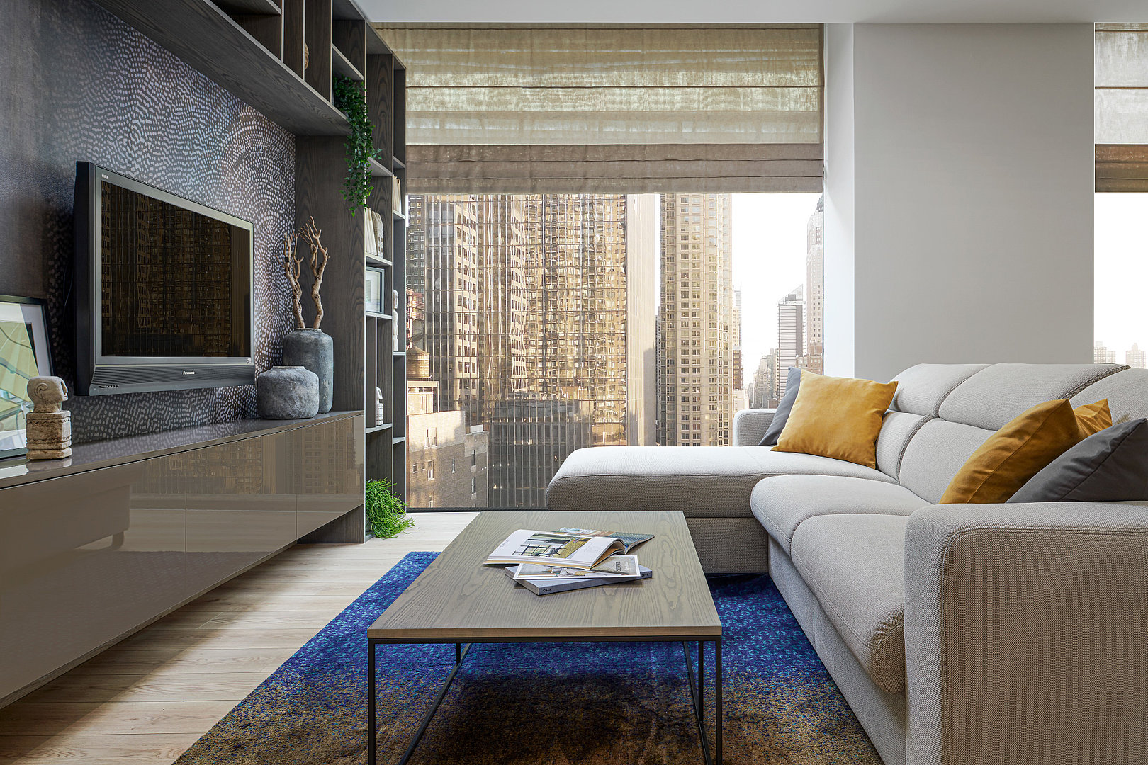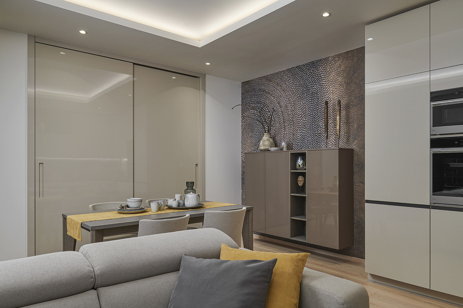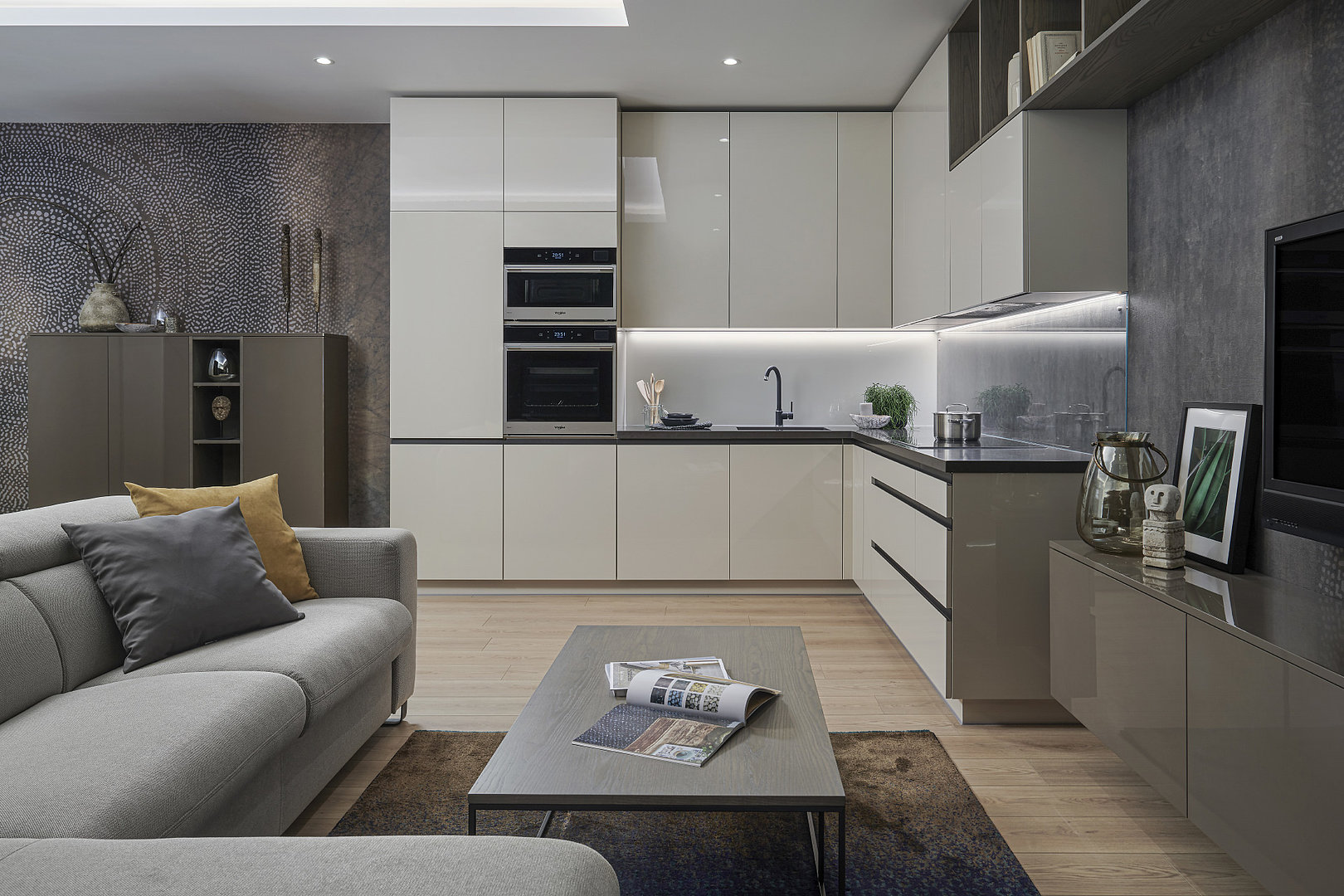 Moderní jednoduchá sestava SIMPLE s elegantní kontrastní hranovou úchytkou v menším interiéru.