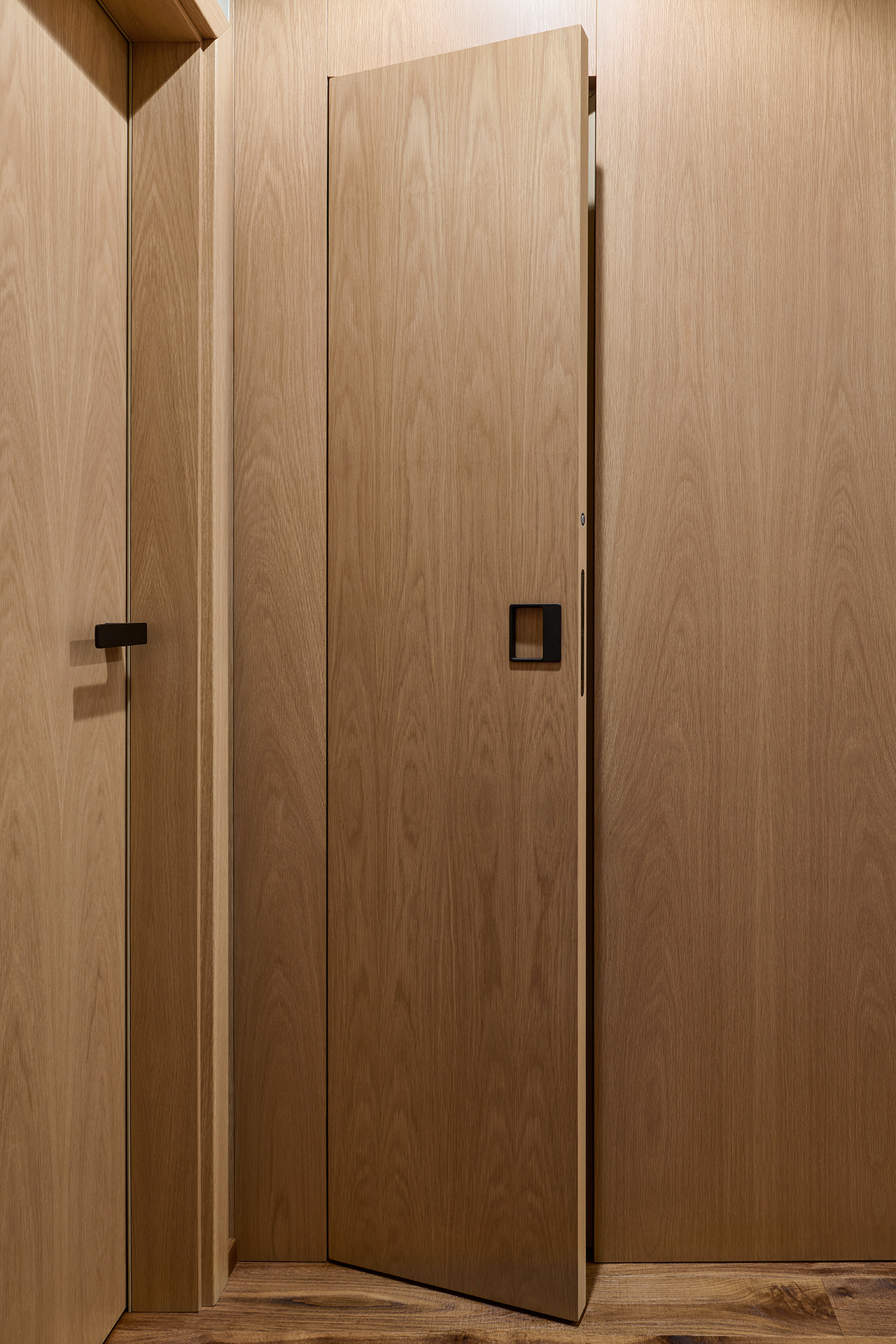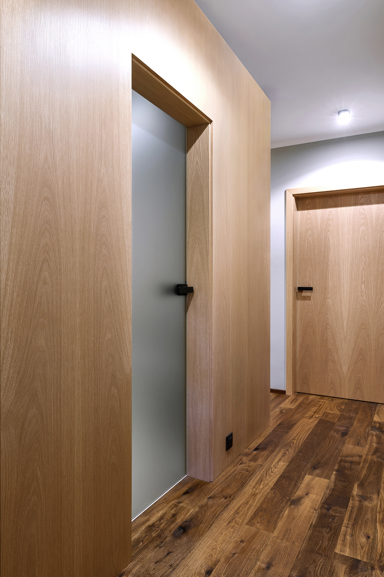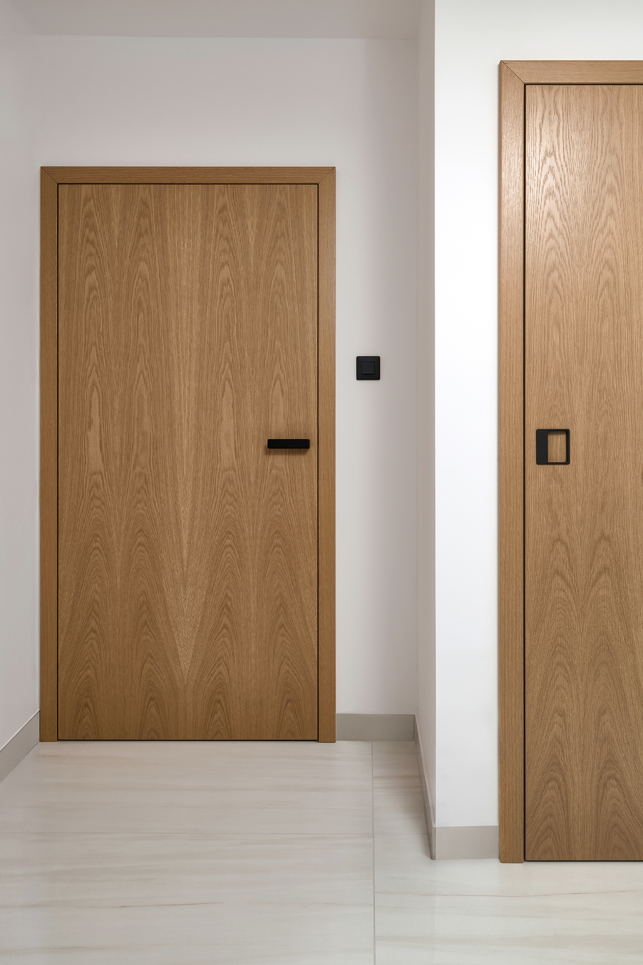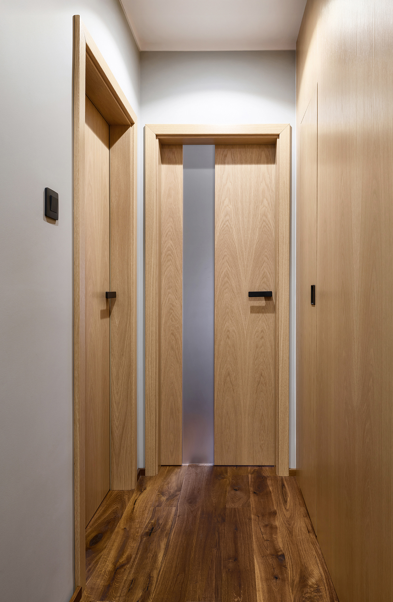 Jednotný rukopis se promítá i do interiérových dveří v modelech SPACE a SPIRIT, které navazují stejným materiálovým řešením. Černé matné kování MINIMAL TIN-K, madla JOO MAGNETIC, skryté panty a magnetické zámky tvoří minimalistický, ale funkční detail.