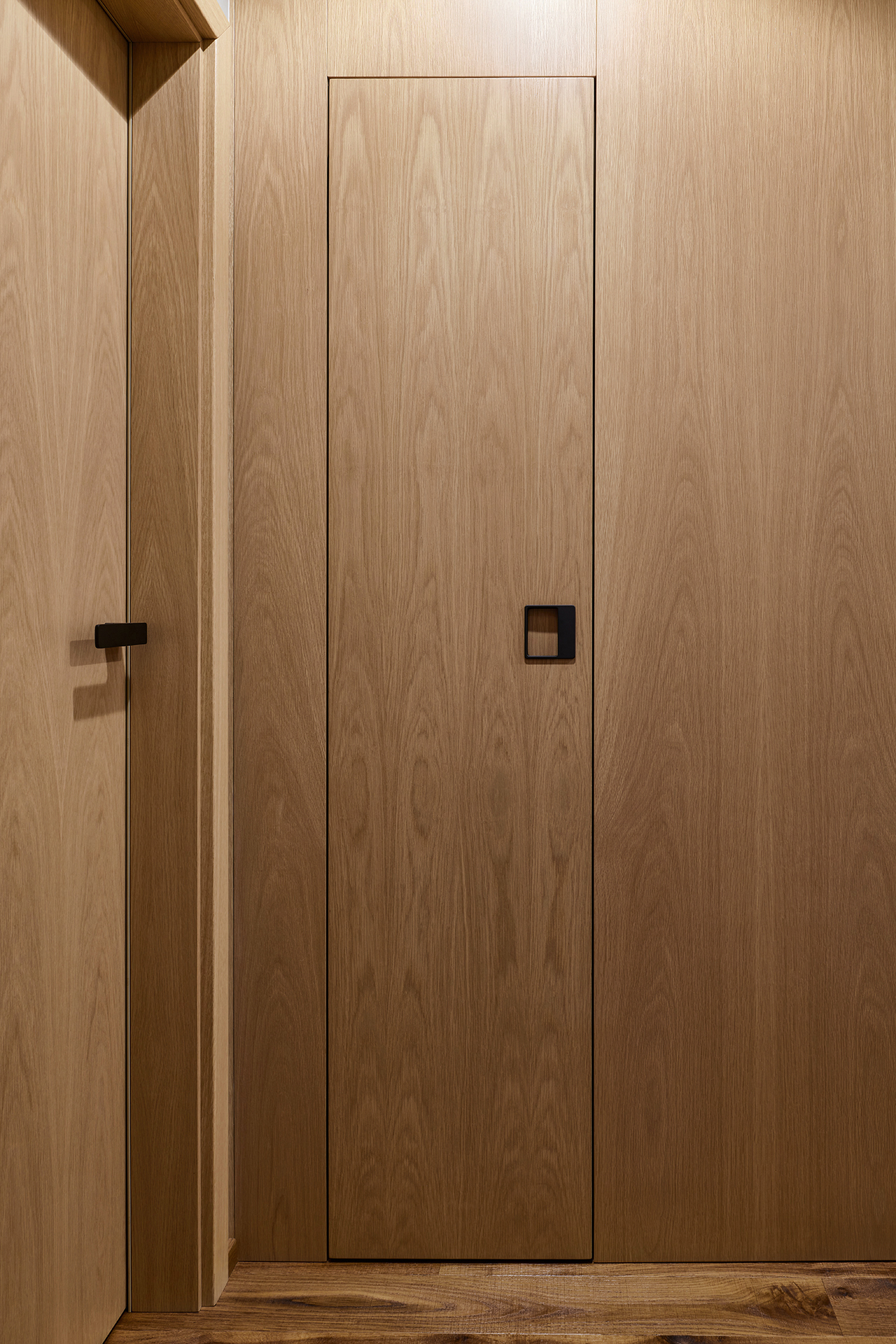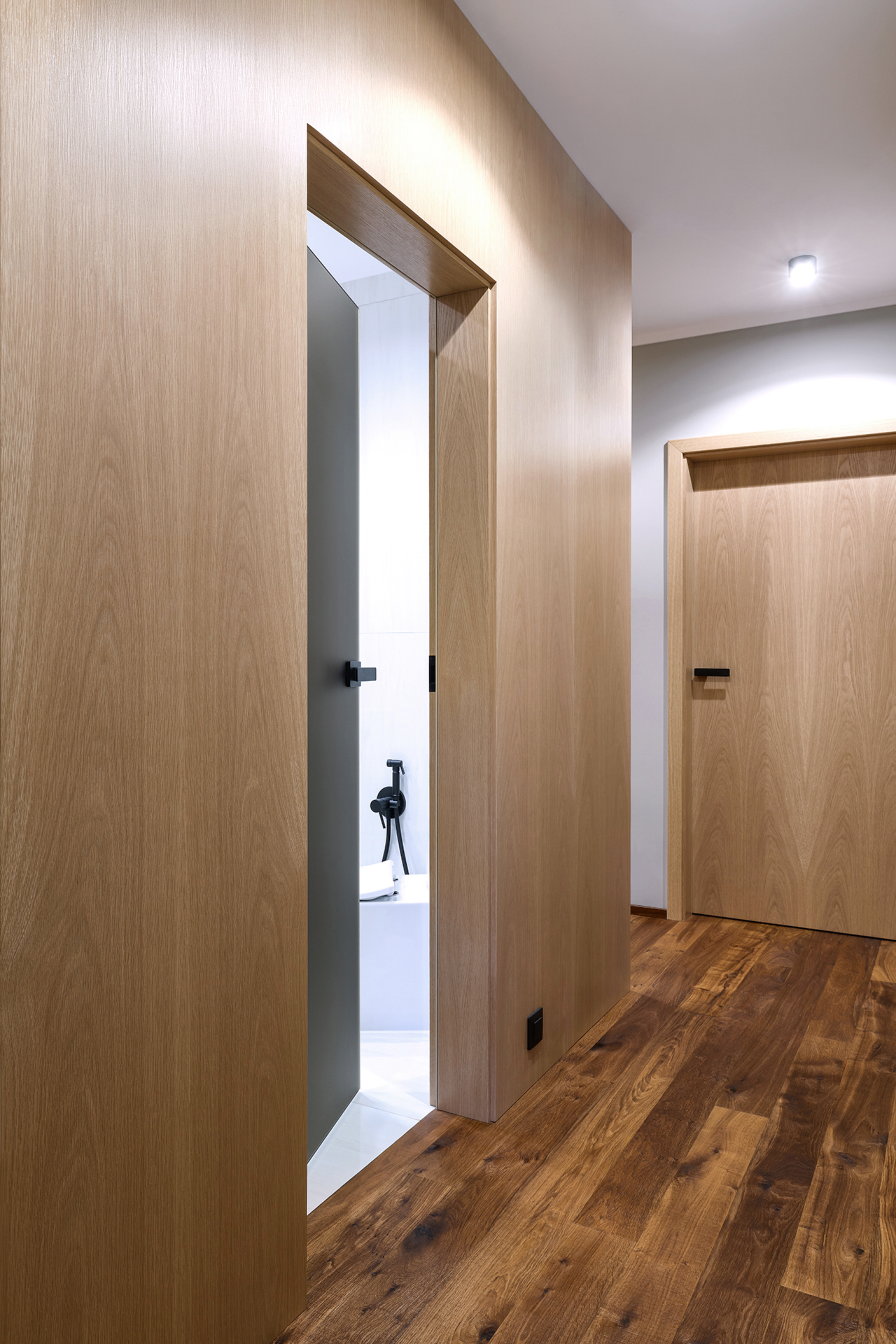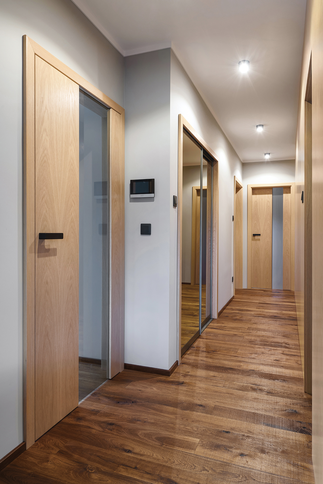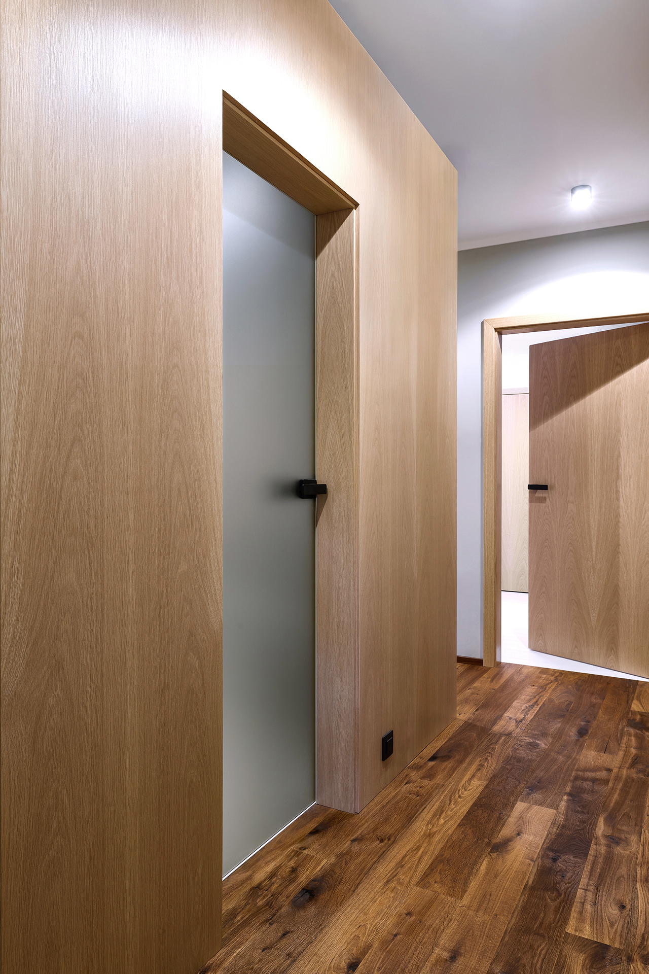 Jednotný rukopis se promítá i do interiérových dveří v modelech SPACE a SPIRIT, které navazují stejným materiálovým řešením. Černé matné kování MINIMAL TIN-K, madla JOO MAGNETIC, skryté panty a magnetické zámky tvoří minimalistický, ale funkční detail.