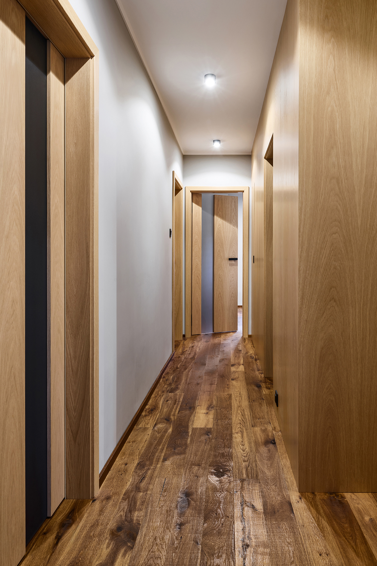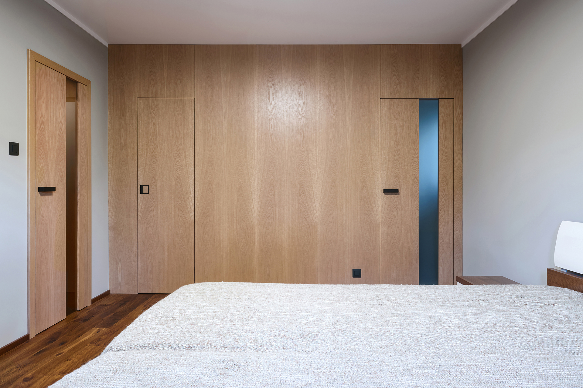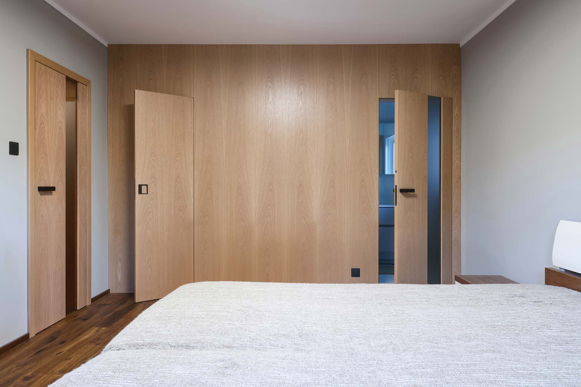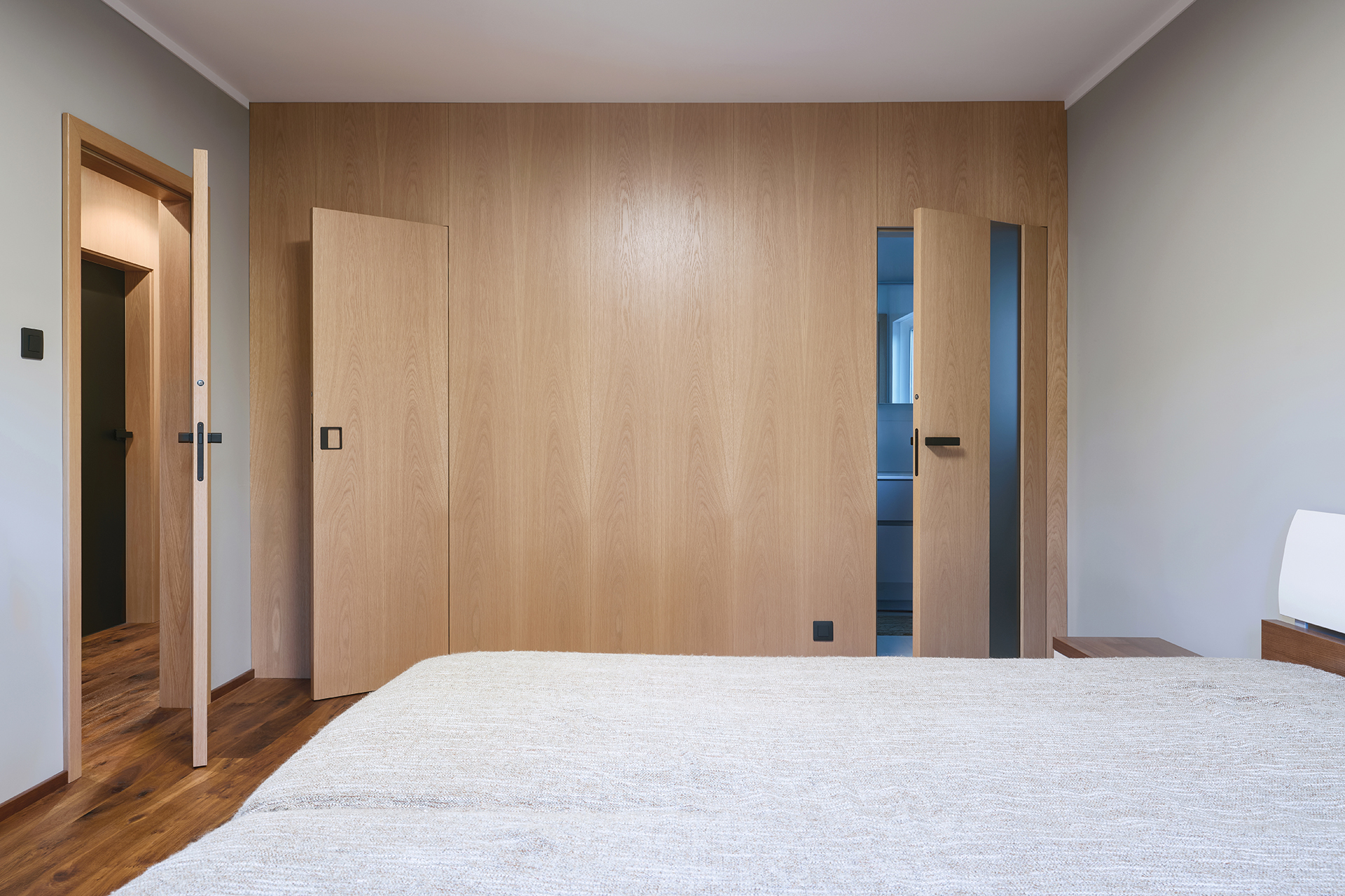 Jednotný rukopis se promítá i do interiérových dveří v modelech SPACE a SPIRIT, které navazují stejným materiálovým řešením. Černé matné kování MINIMAL TIN-K, madla JOO MAGNETIC, skryté panty a magnetické zámky tvoří minimalistický, ale funkční detail.