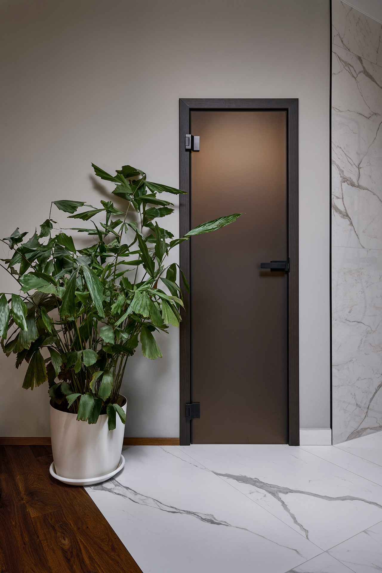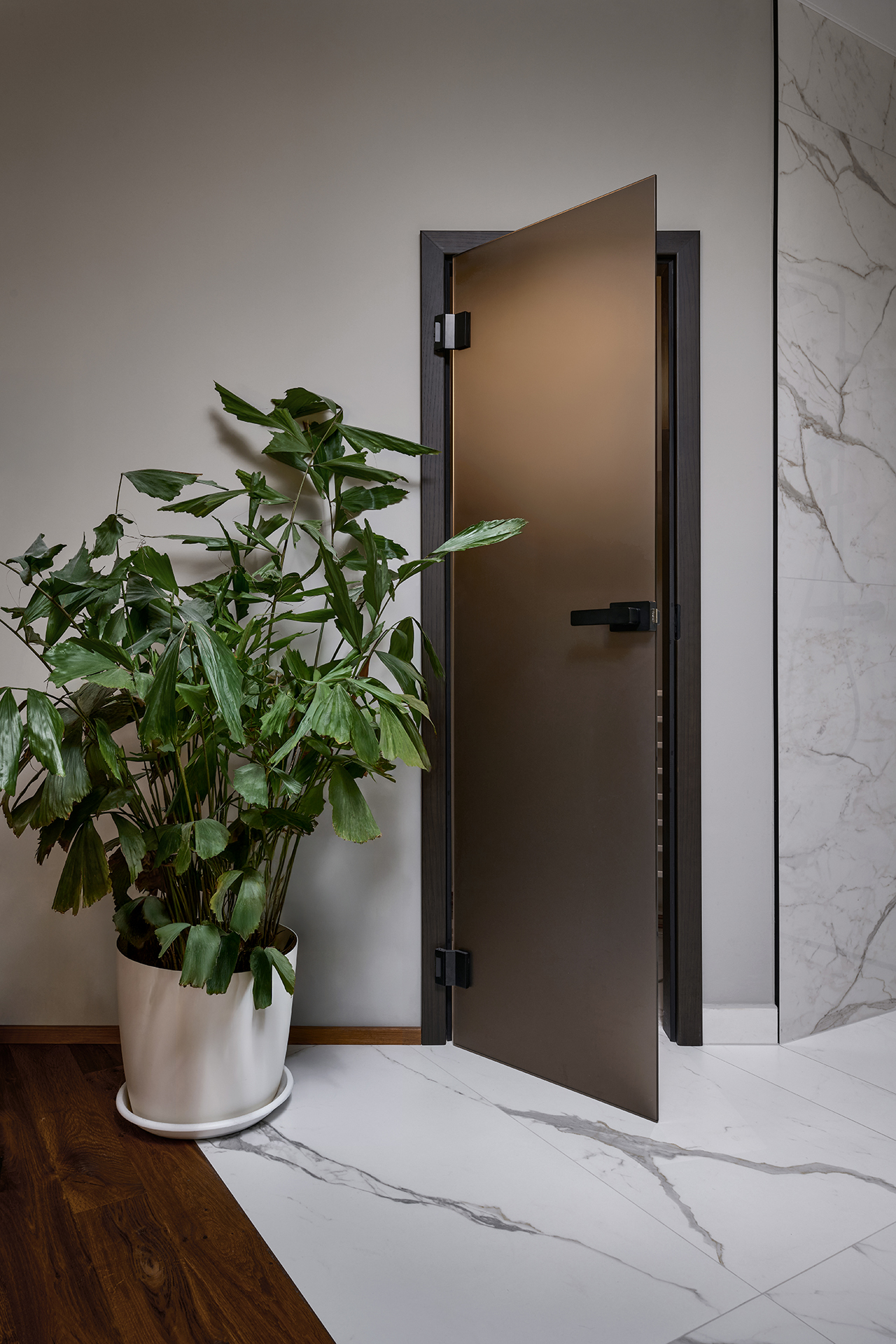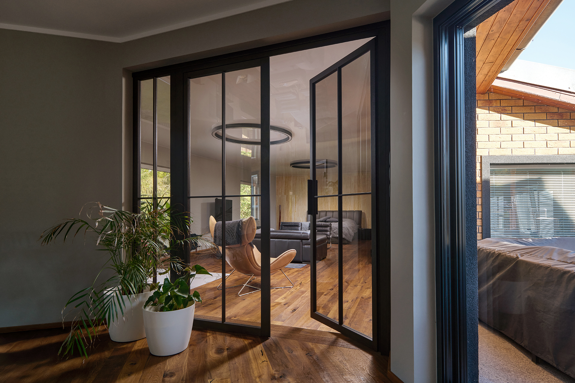 Prostor vizuálně odlehčují bronzová skla Planibel v matném i čirém provedení a velkoformátové celoskleněné plochy, které dodávají hloubku a lehkost. Propojovací dveře FRAME přirozeně završují celkový dojem – propouštějí světlo, opticky otevírají místnost a podtrhují její nadčasovou eleganci.