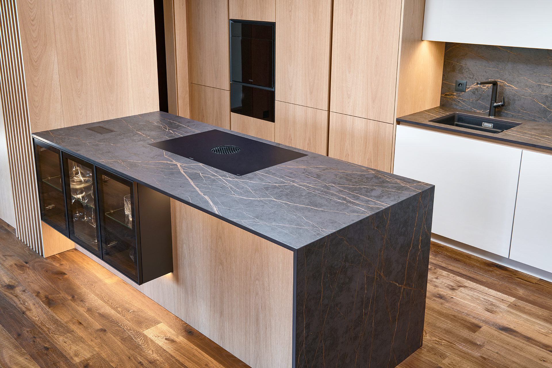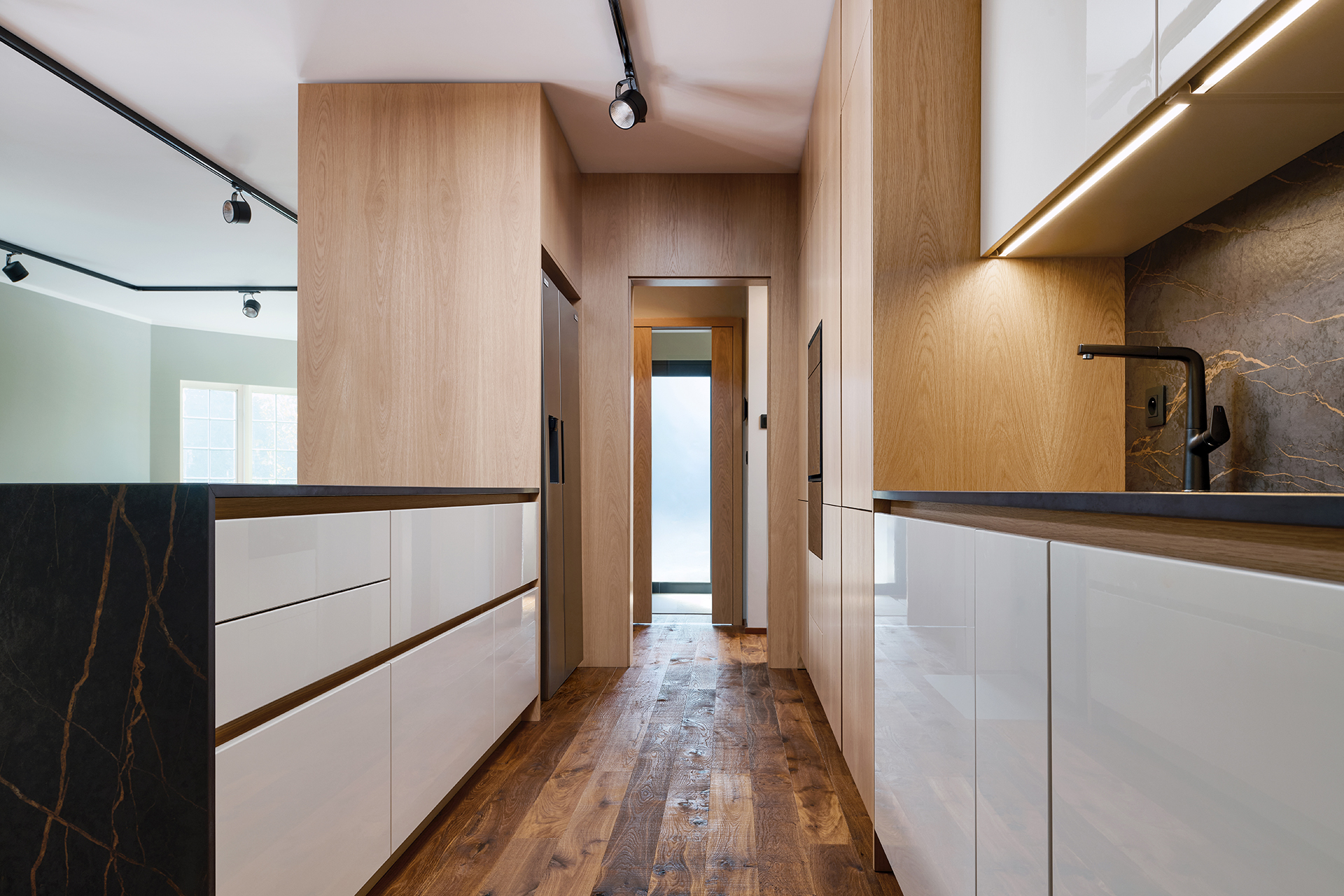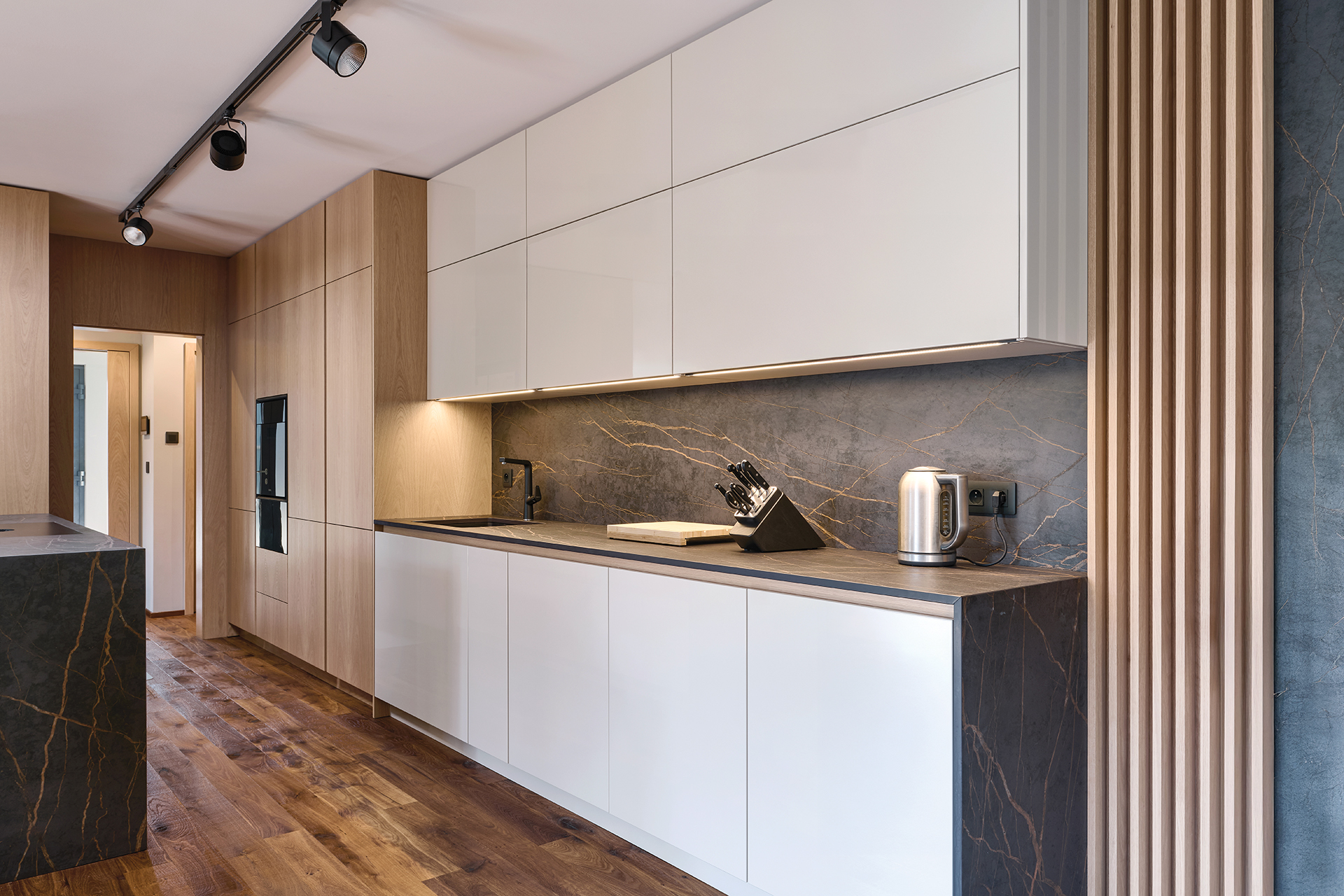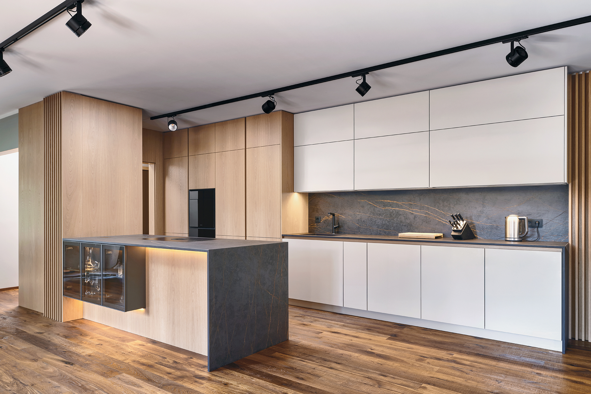 Otevřenému prostoru dominuje kuchyně na míru, která citlivě kombinuje modely ELITE a LINE. Pracovní plocha a zástěna z materiálu DEKTON LAURENT s výraznou kresbou plynule navazují na dýhované panely a spojují odolnost s nadčasovým výrazem interiéru. Promyšlené podsvícení jemně zvýrazňuje plochy stolu, sokly, vitríny i úložné prostory nábytku. Technickou dokonalost podtrhují špičkové spotřebiče BORA.