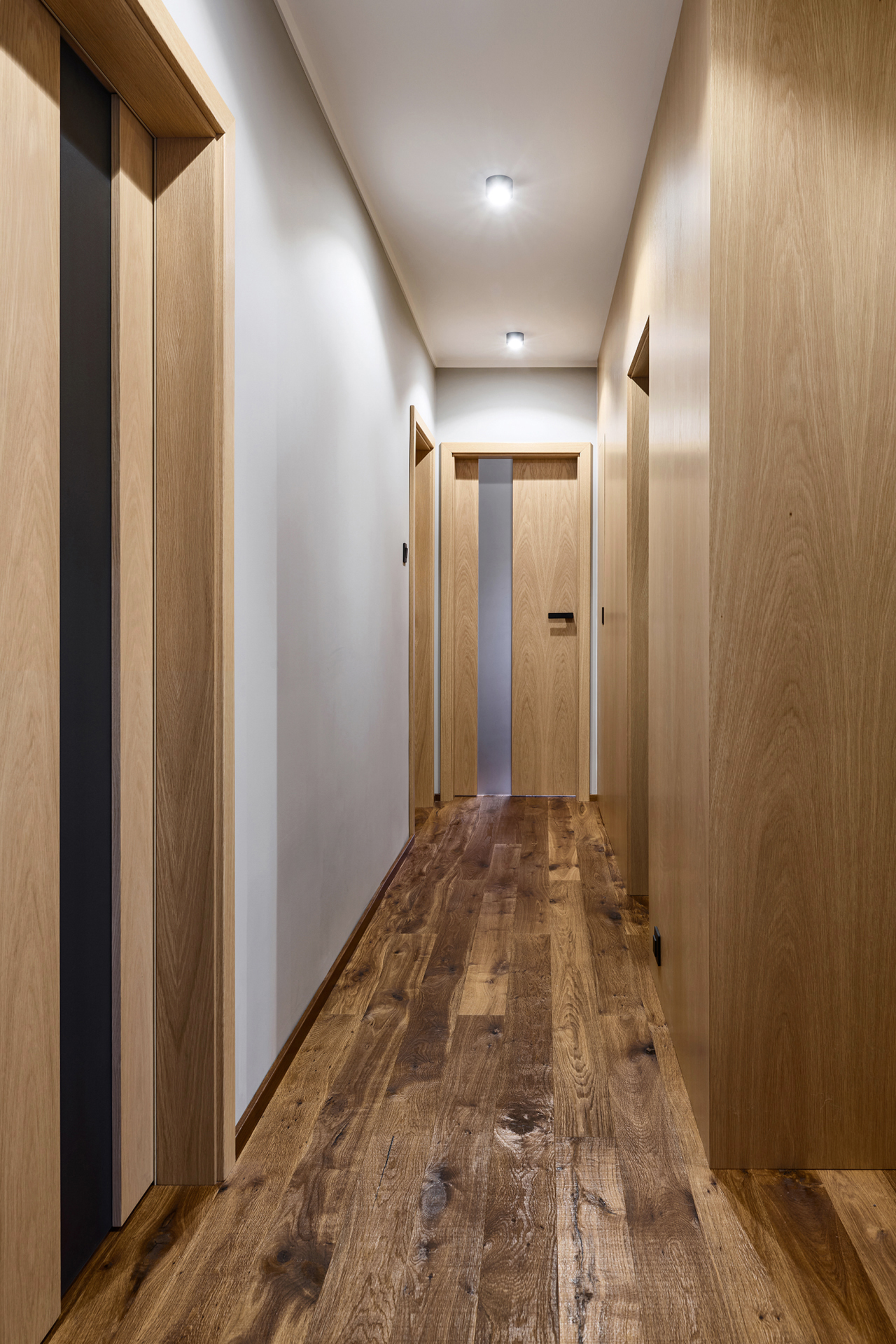 Interiér tohoto domu staví na precizním řemesle a čistých liniích moderního designu. Dubová dýha v kontrastu s lesklým lakem Champagne vytváří jasný a osobitý charakter.