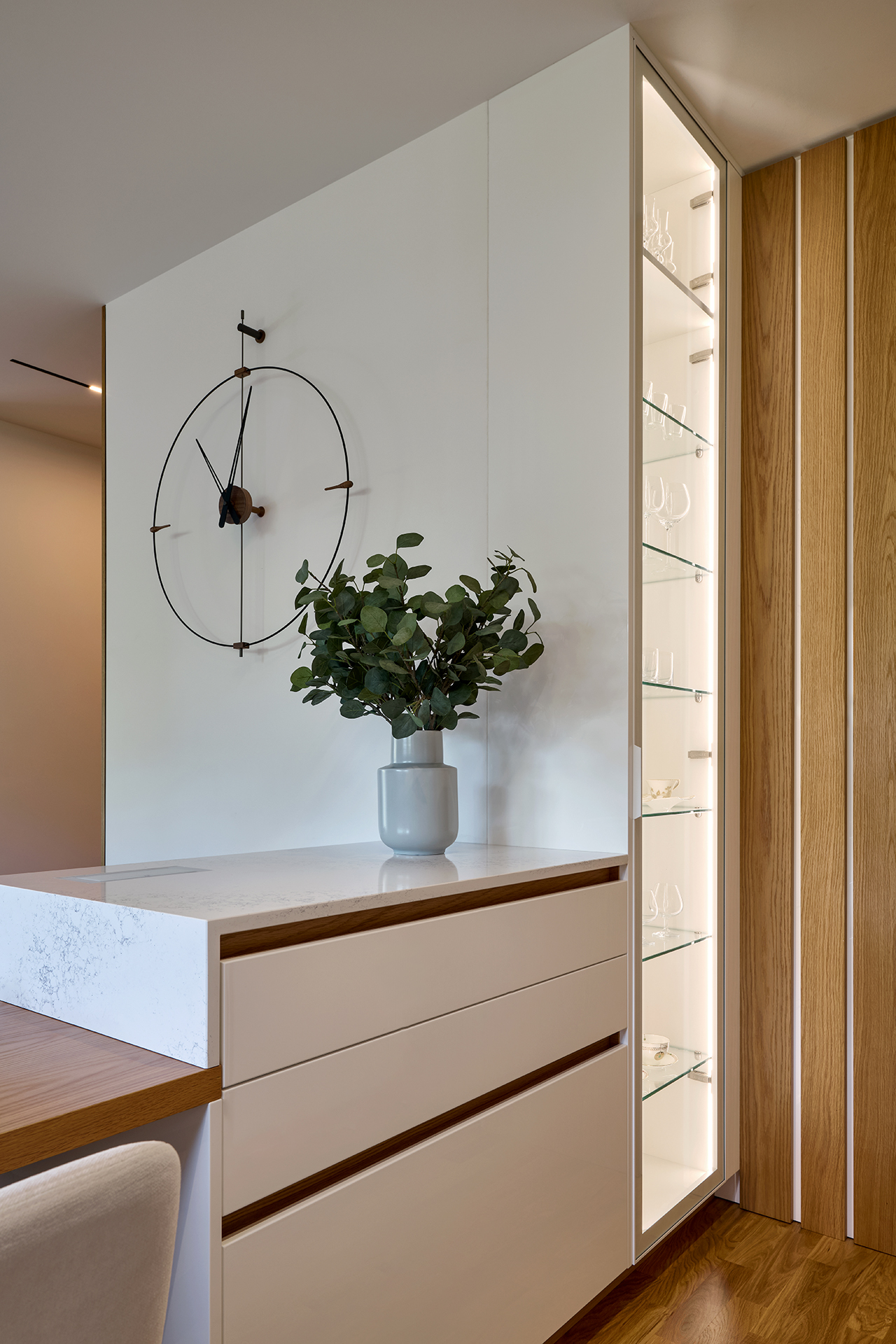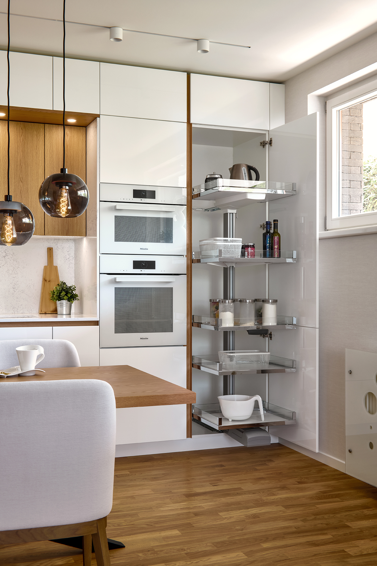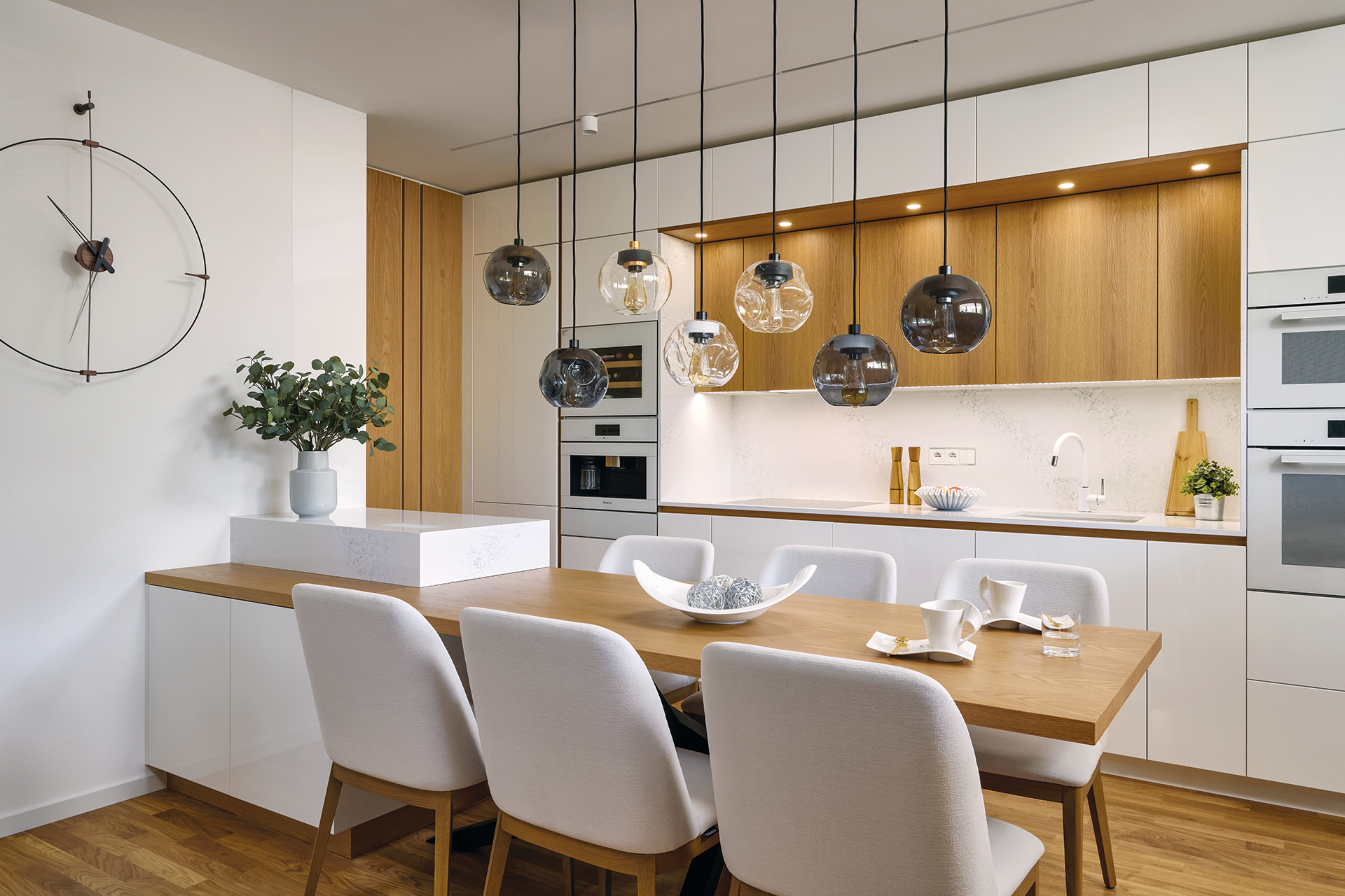 Kuchyně ELITE není jen místem pro vaření. Je to pulzující srdce celého domova. Kontrast lesklého bílého laku a výrazné kresby amerického dubu přináší svěžest i eleganci. Pracovní deska a obklad z Technistone podtrhují moderní charakter, zatímco spotřebiče Miele zajišťují maximální komfort. Jídelní stůl se židlemi NORMAN přirozeně doplňuje prostor a stává se tak místem pro společné chvíle s rodinou.