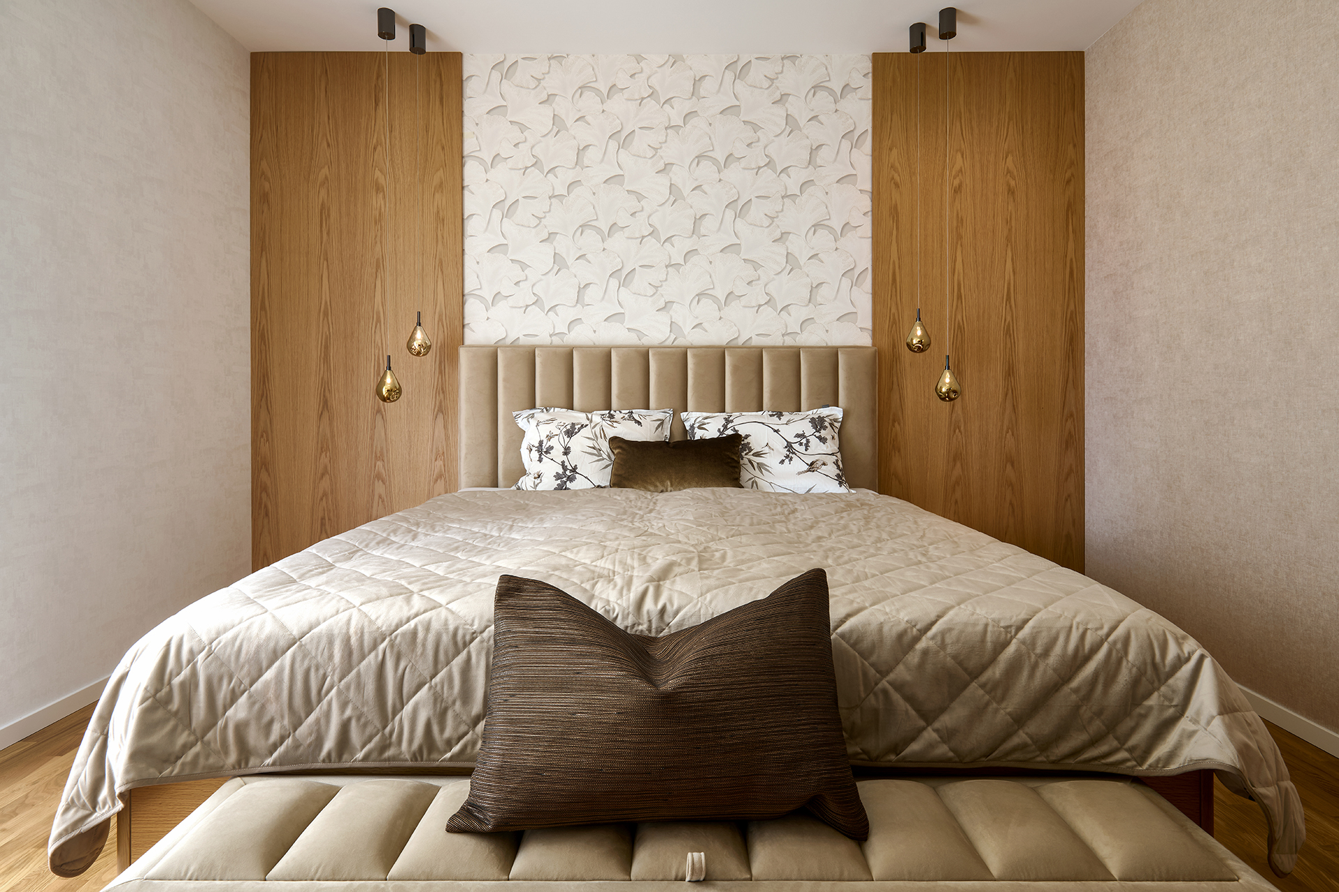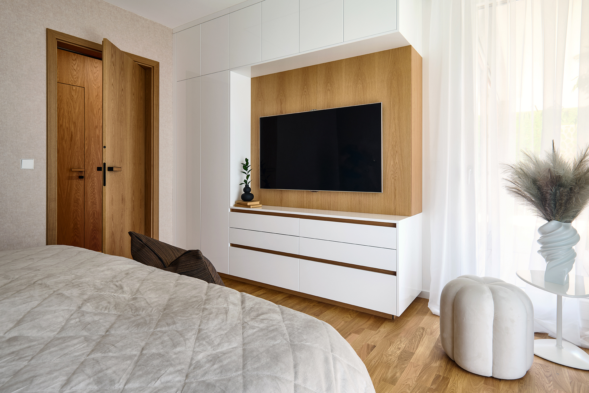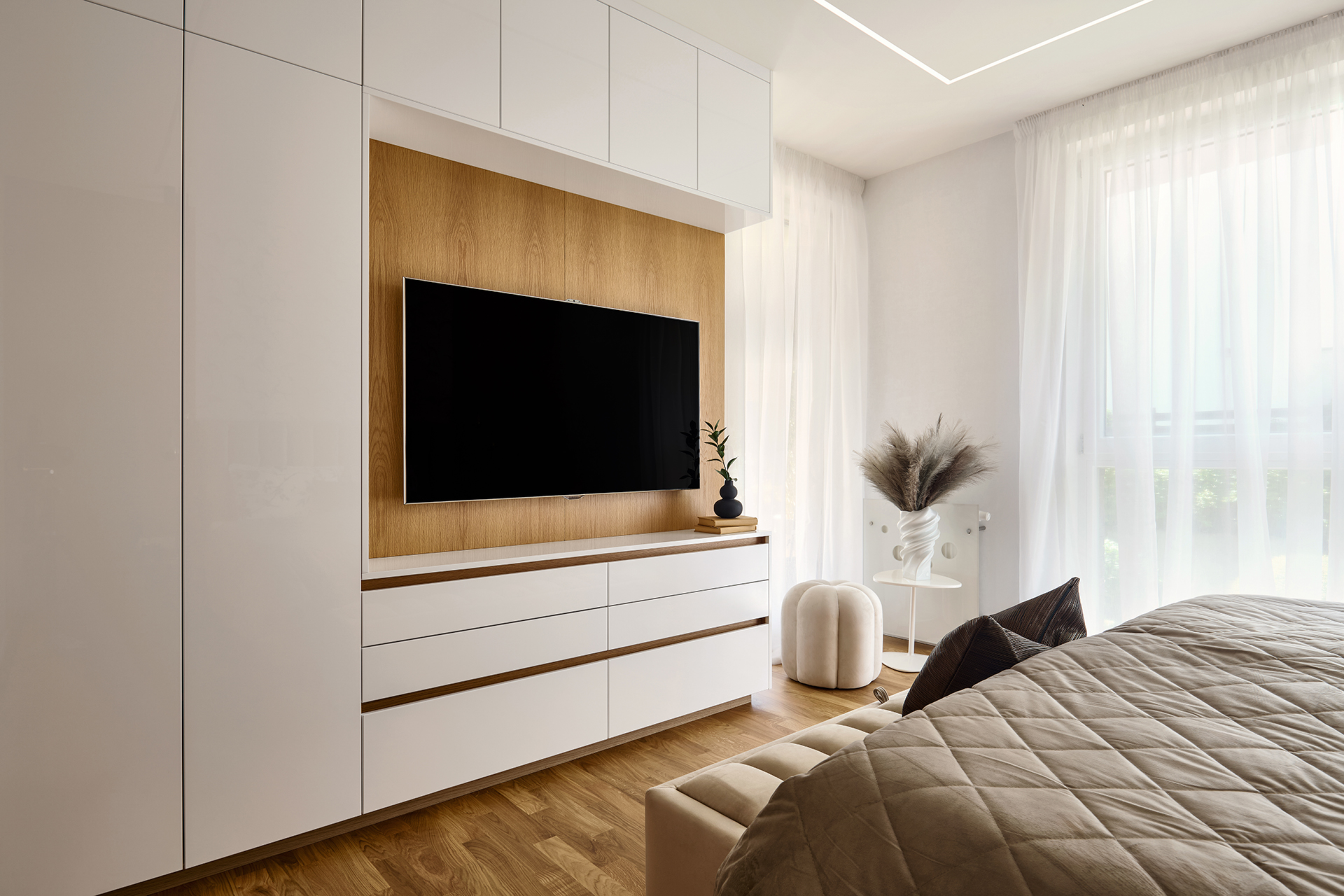 První ložnice byla navržena jako soukromá oáza klidu. Postel ALEXA doplněná nočními stolky a taburetem na míru tvoří elegantní celek. Tlumené tóny zde působí hřejivě a vytvářejí prostředí, kde se snadno odpočívá i načerpává nová energie.