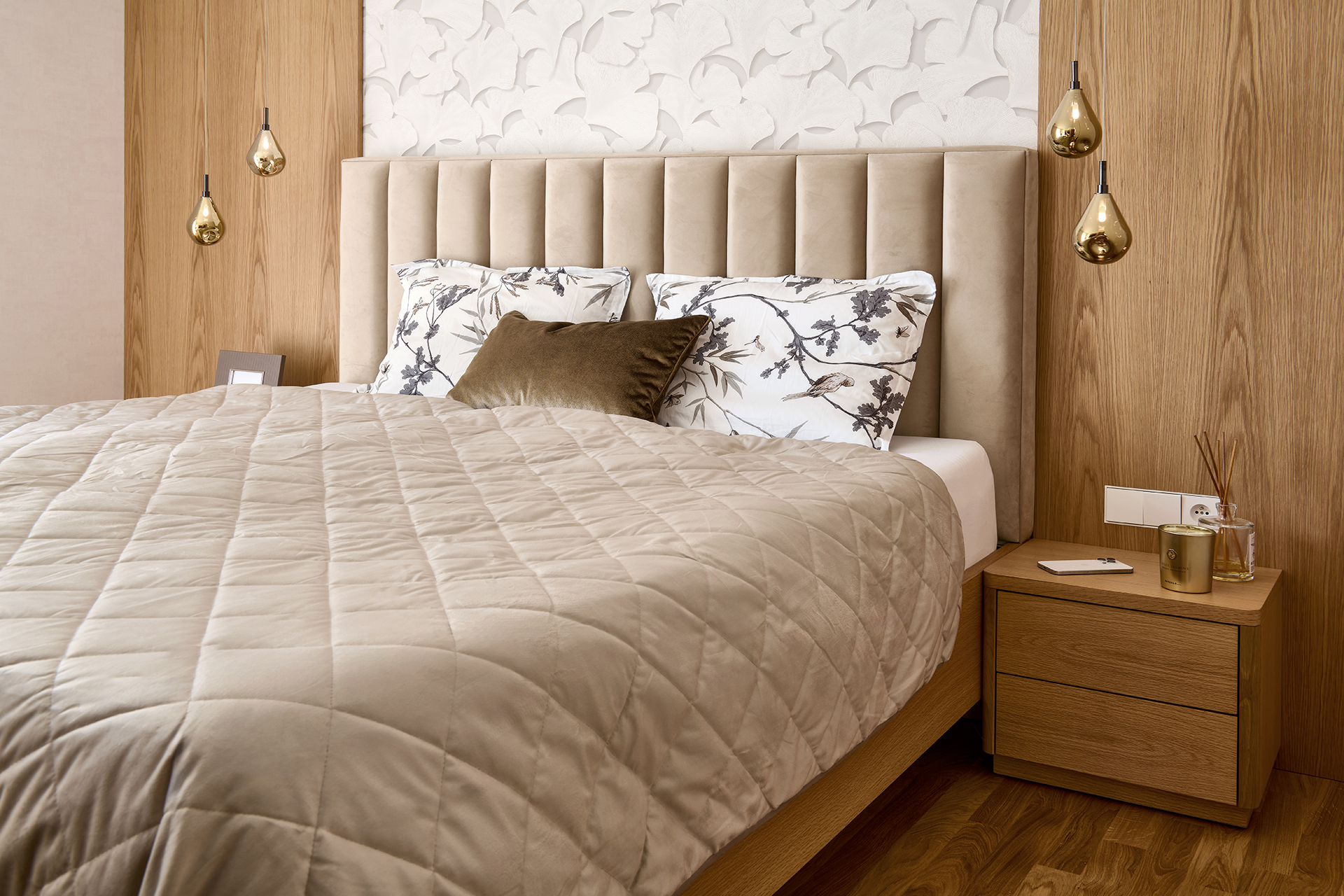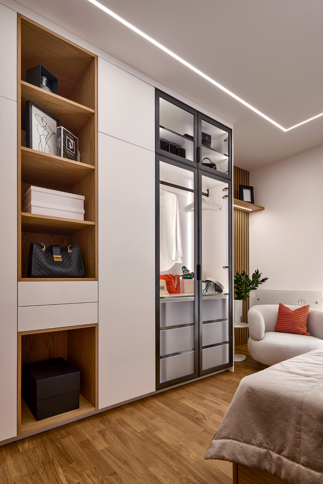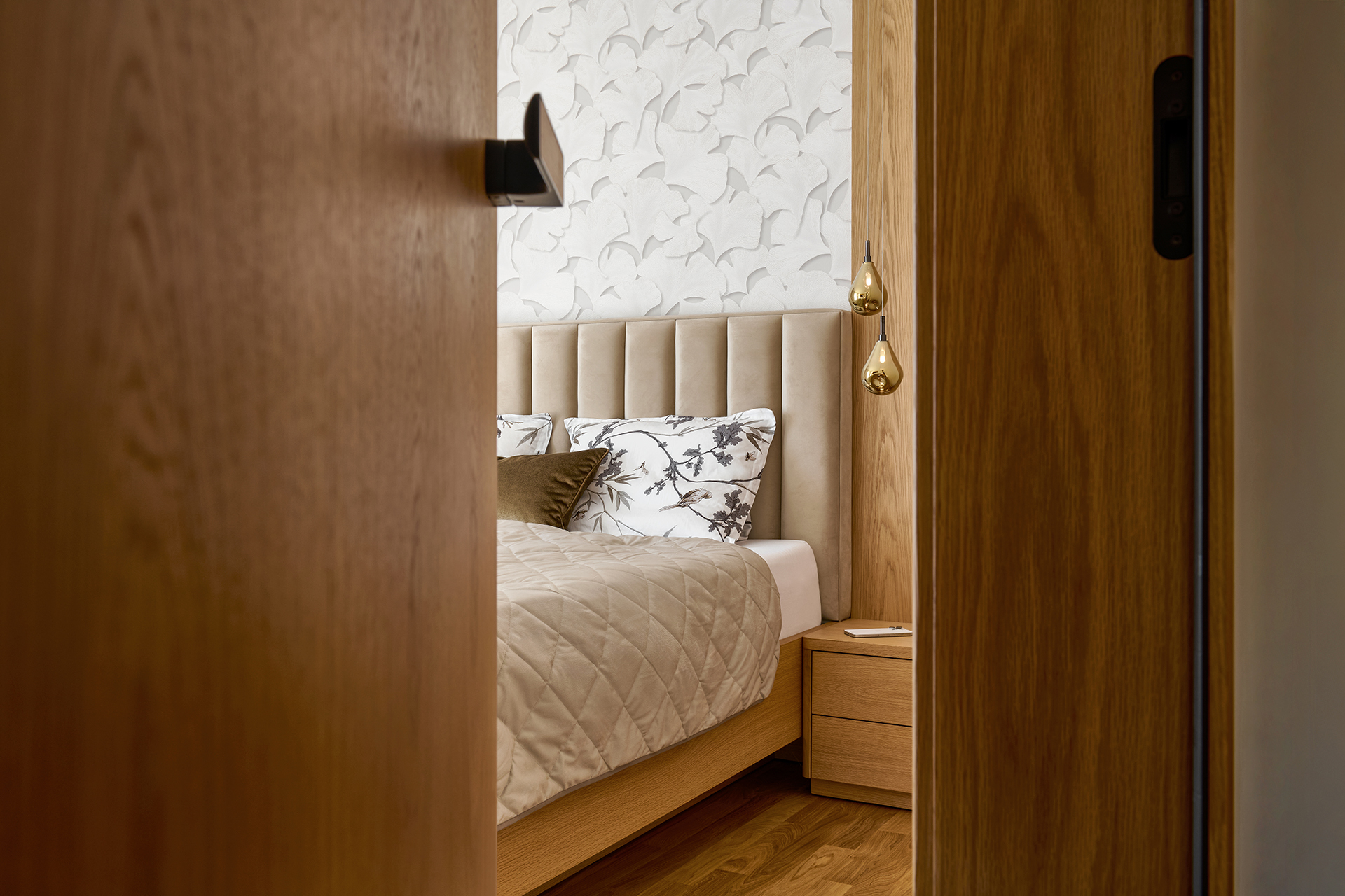 První ložnice byla navržena jako soukromá oáza klidu. Postel ALEXA doplněná nočními stolky a taburetem na míru tvoří elegantní celek. Tlumené tóny zde působí hřejivě a vytvářejí prostředí, kde se snadno odpočívá i načerpává nová energie.
