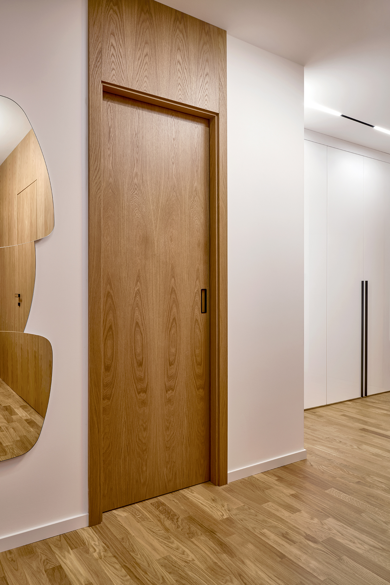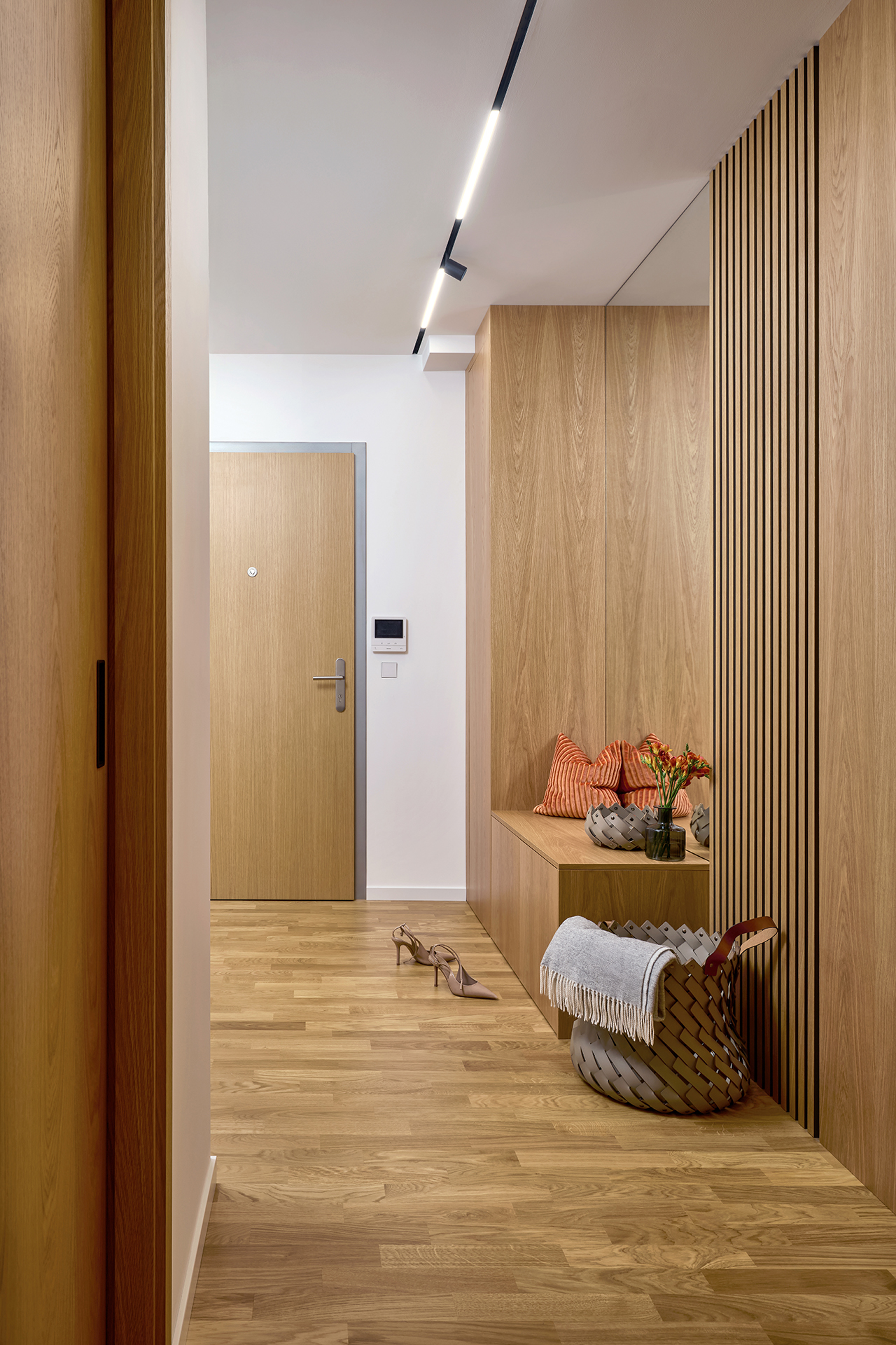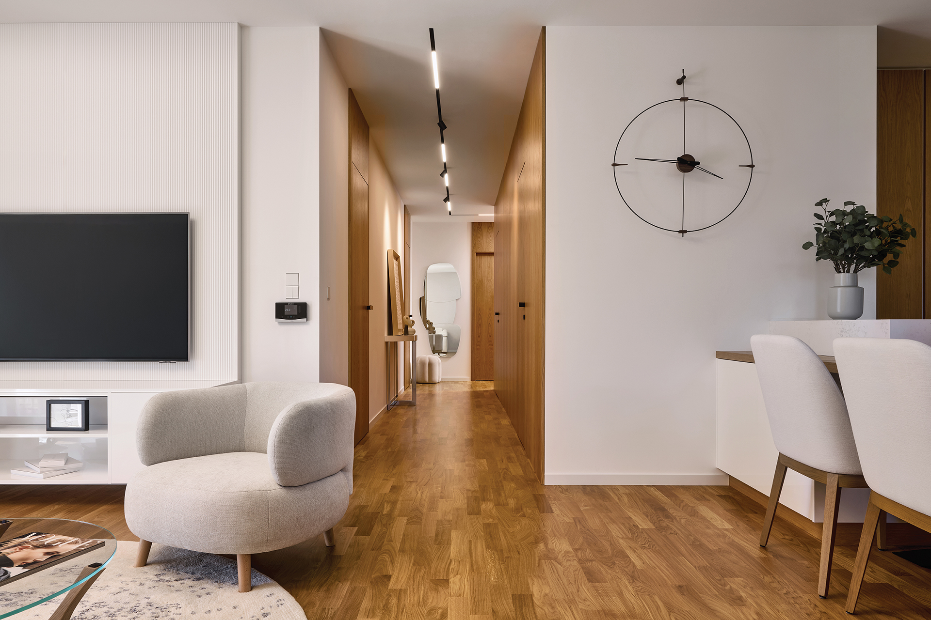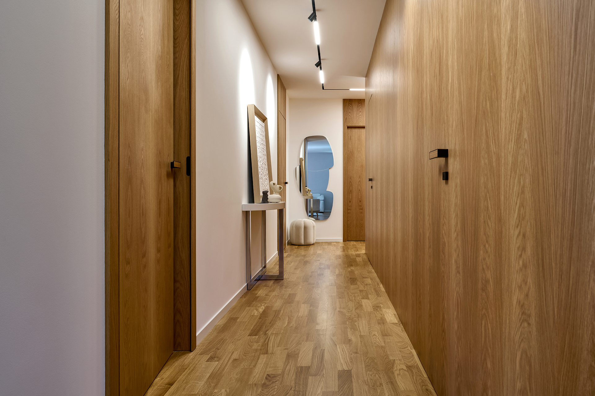 Ani chodba nezůstává bez povšimnutí. Objevuje se zde opět stejná barevná kombinace jako ve zbytku interiéru, tentokrát však v čistém a minimalistickém pojetí. Dveře SPACE chytře propojují celý byt a umocňují pocit harmonického a stylového bydlení.