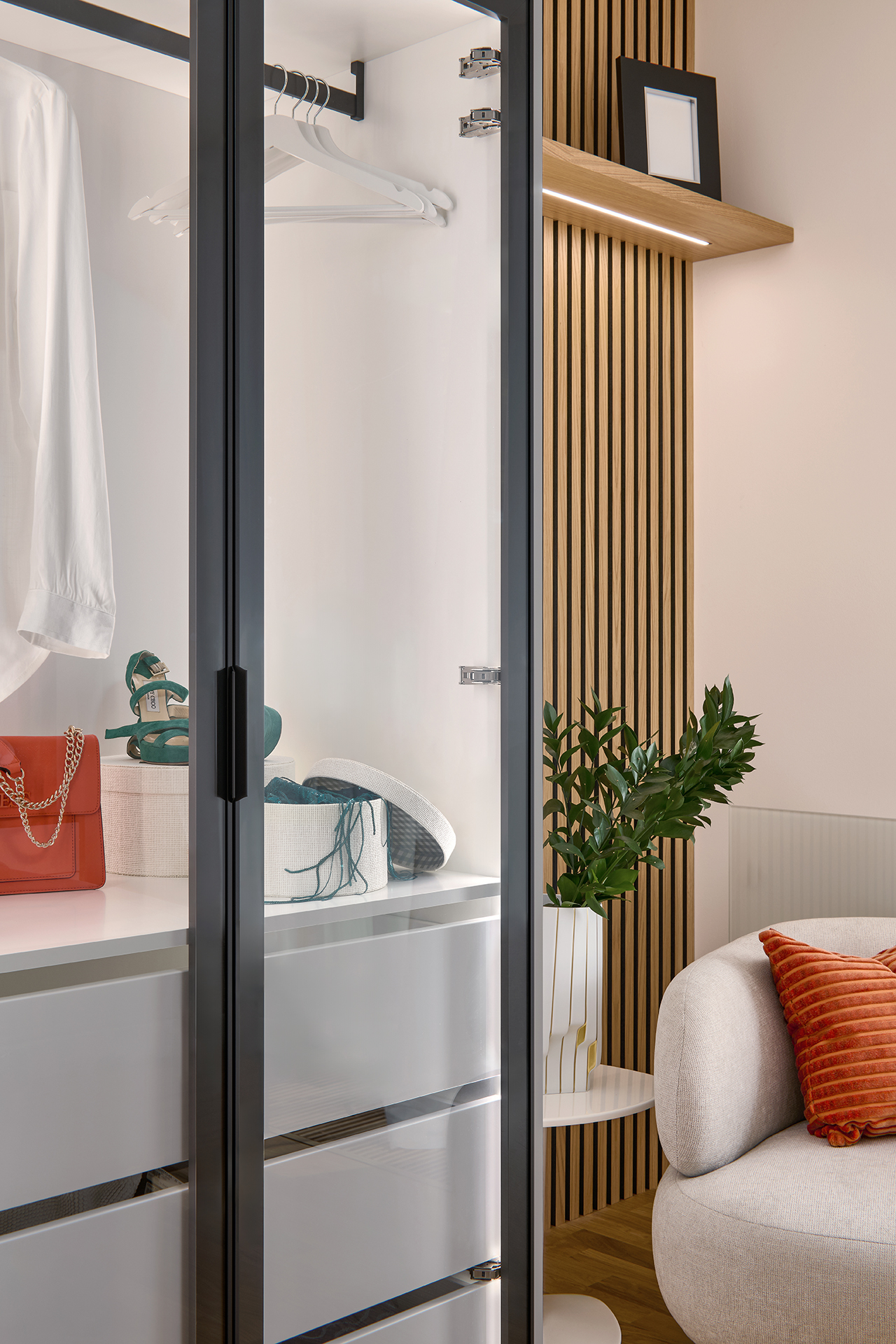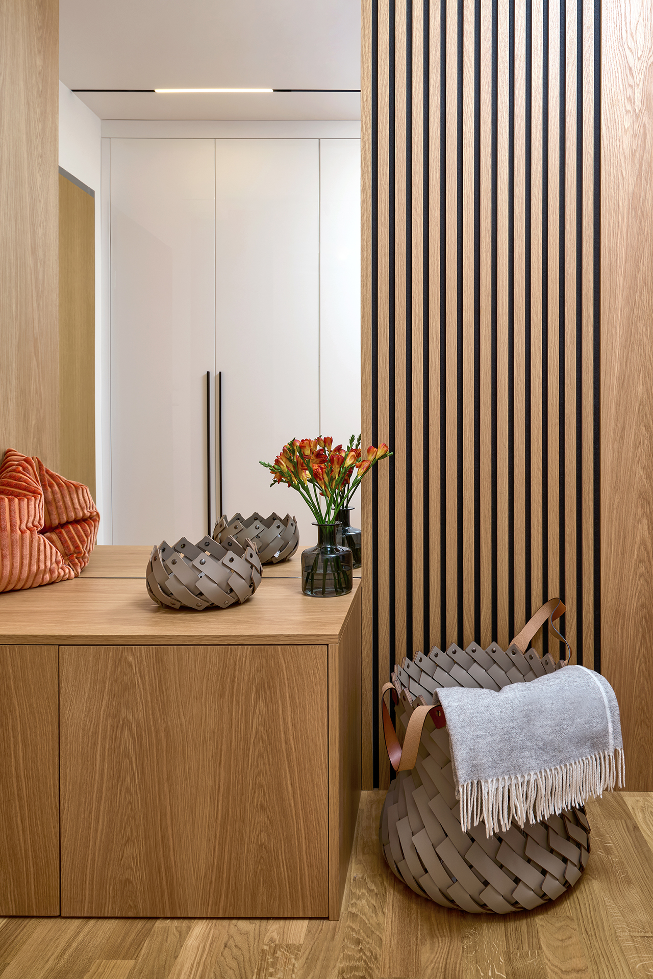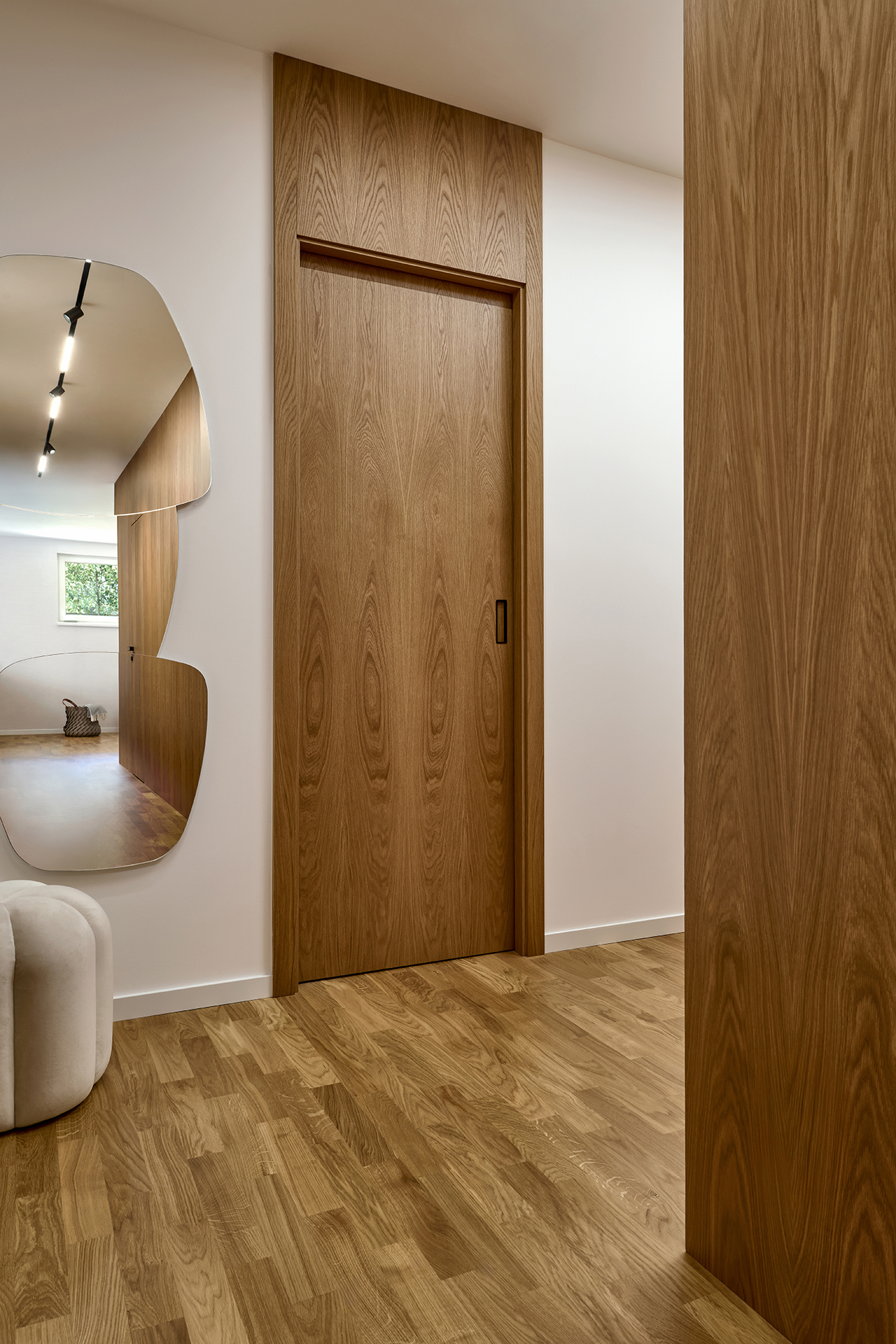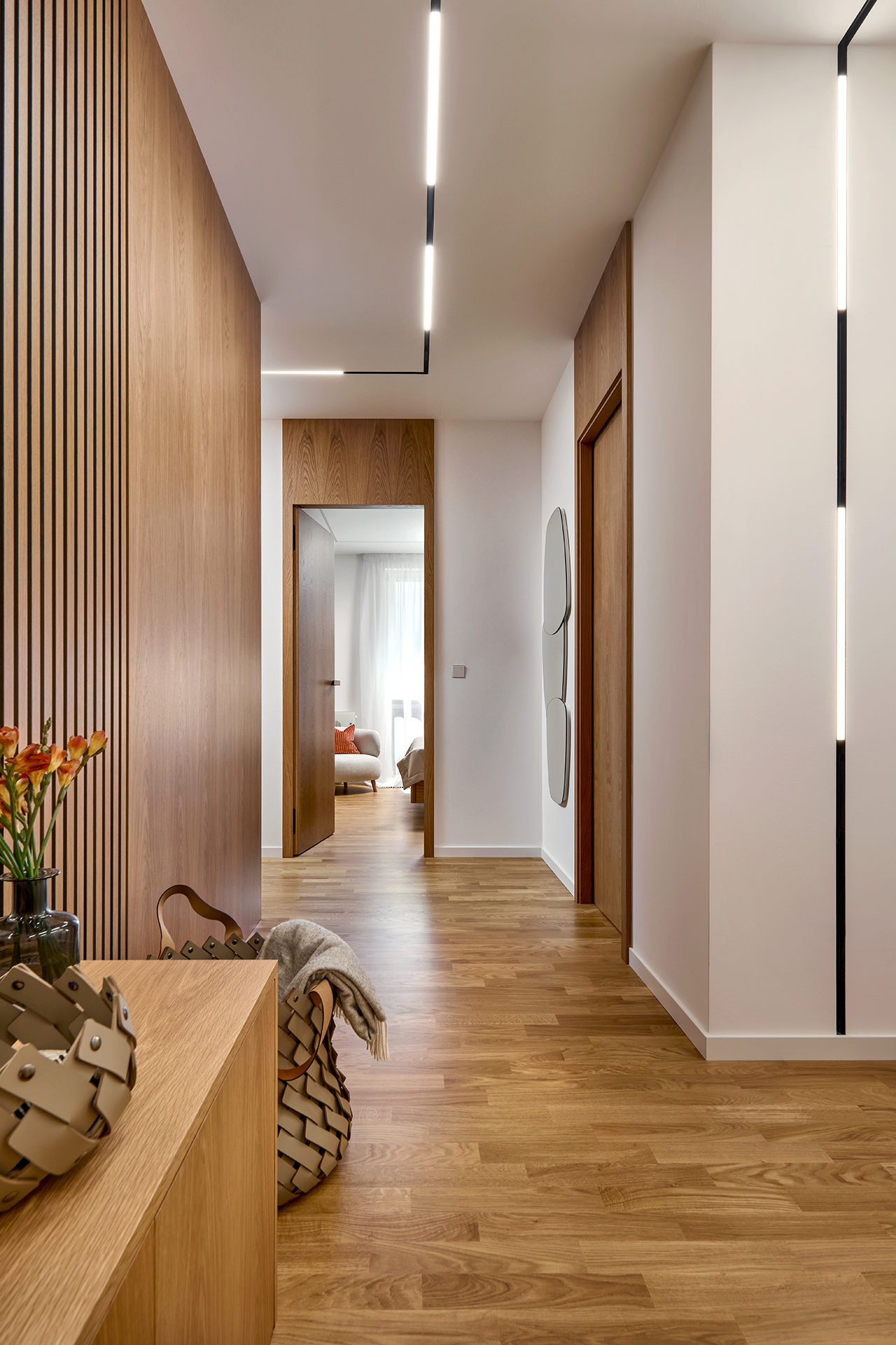 Ani chodba nezůstává bez povšimnutí. Objevuje se zde opět stejná barevná kombinace jako ve zbytku interiéru, tentokrát však v čistém a minimalistickém pojetí. Dveře SPACE chytře propojují celý byt a umocňují pocit harmonického a stylového bydlení.