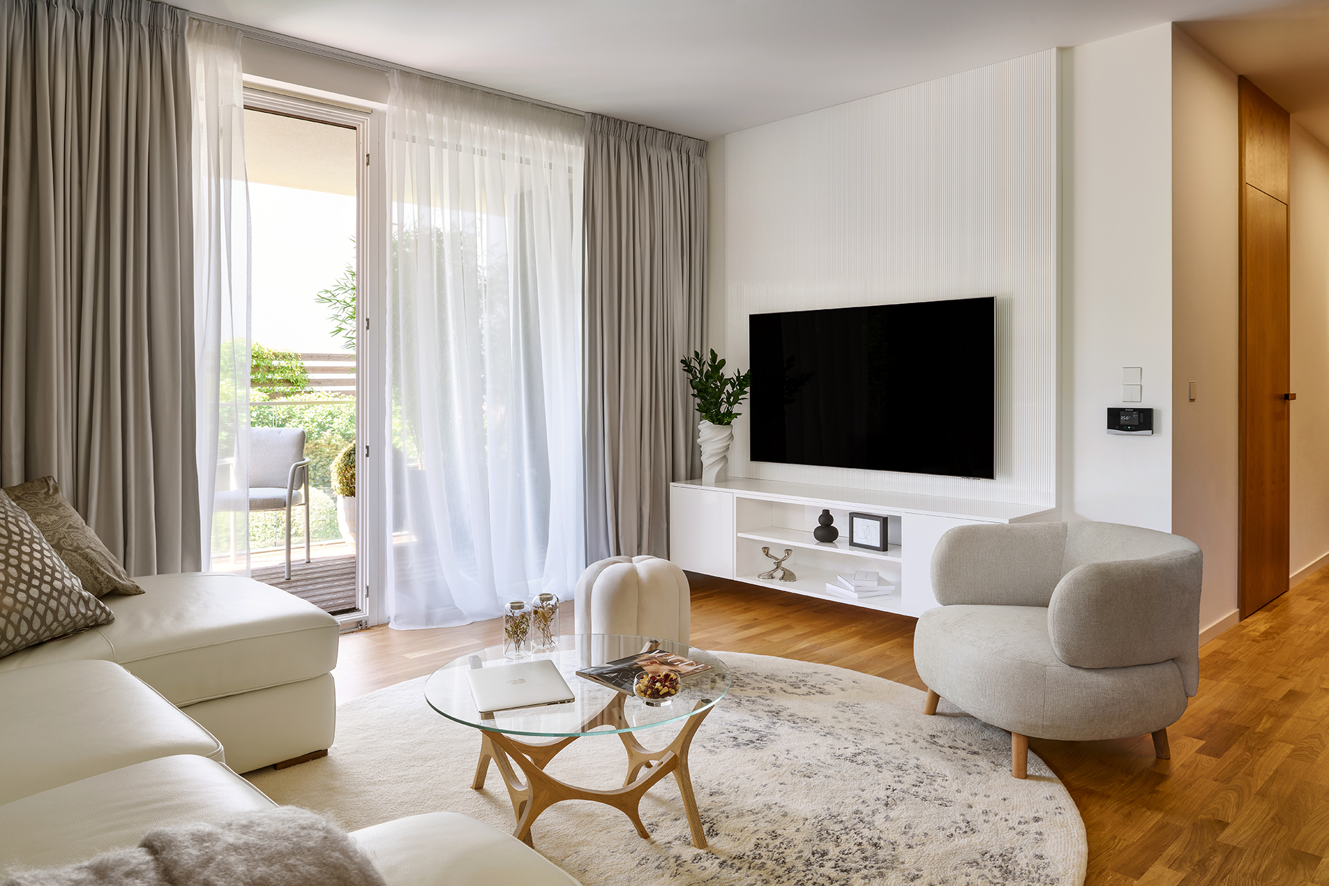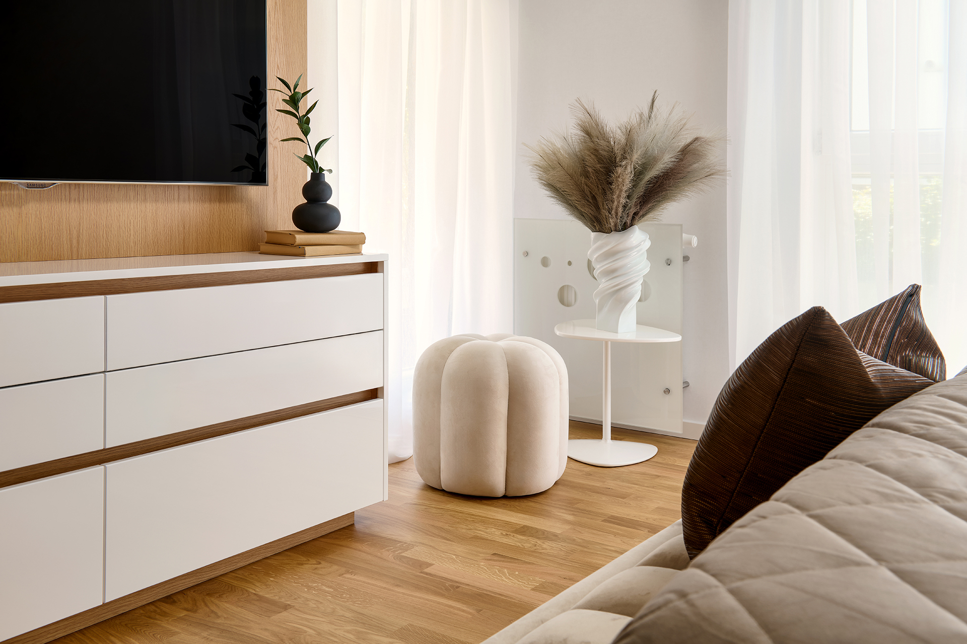 Na kuchyň plynule navazuje obývací pokoj, kde TV sestava v provedení polar white lesk se strukturou WAVE vnáší jemnou dynamiku a lehkost. Je to místo, kde se noblesa potkává s uvolněnou atmosférou – ideální pro odpočinek i setkávání s přáteli.