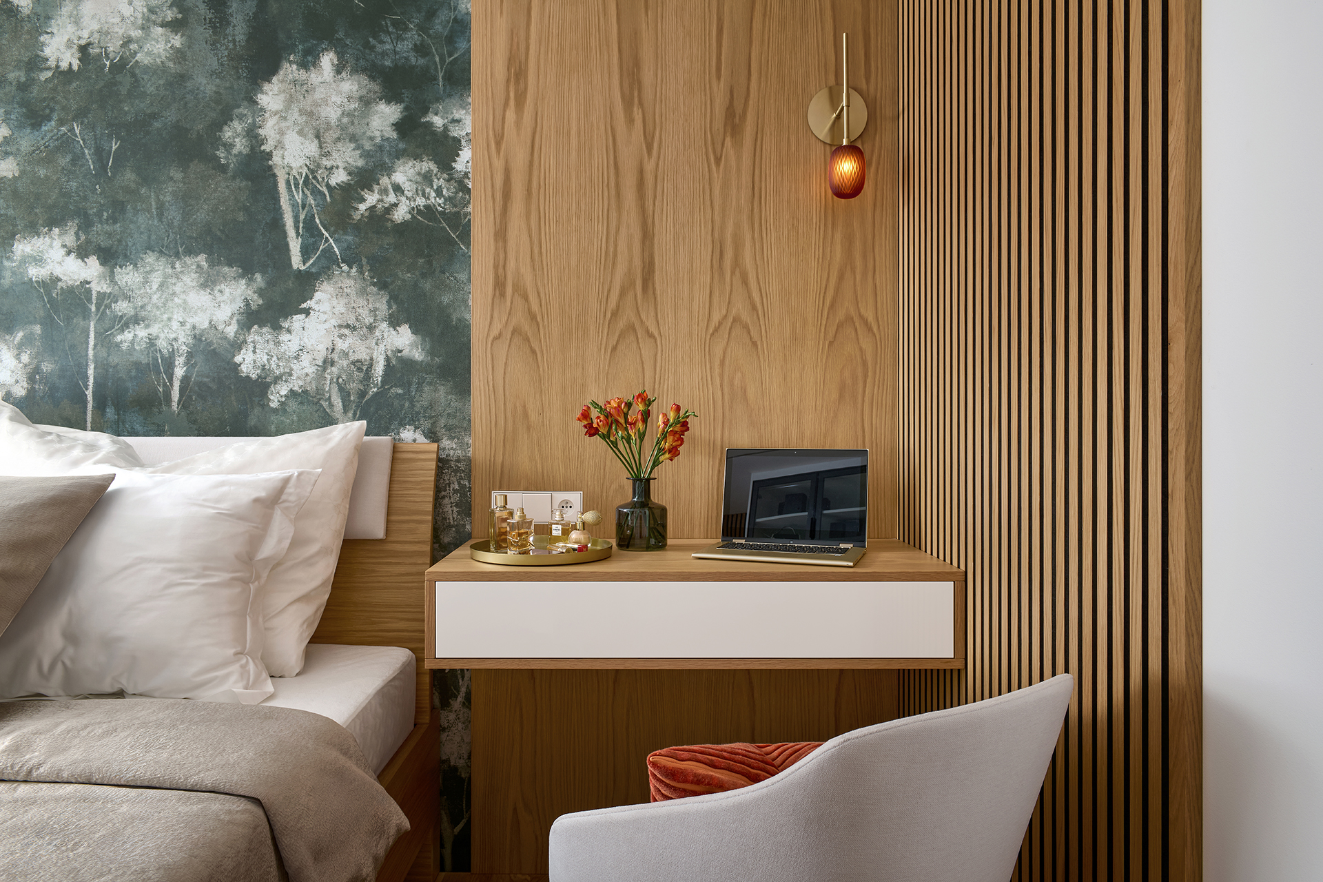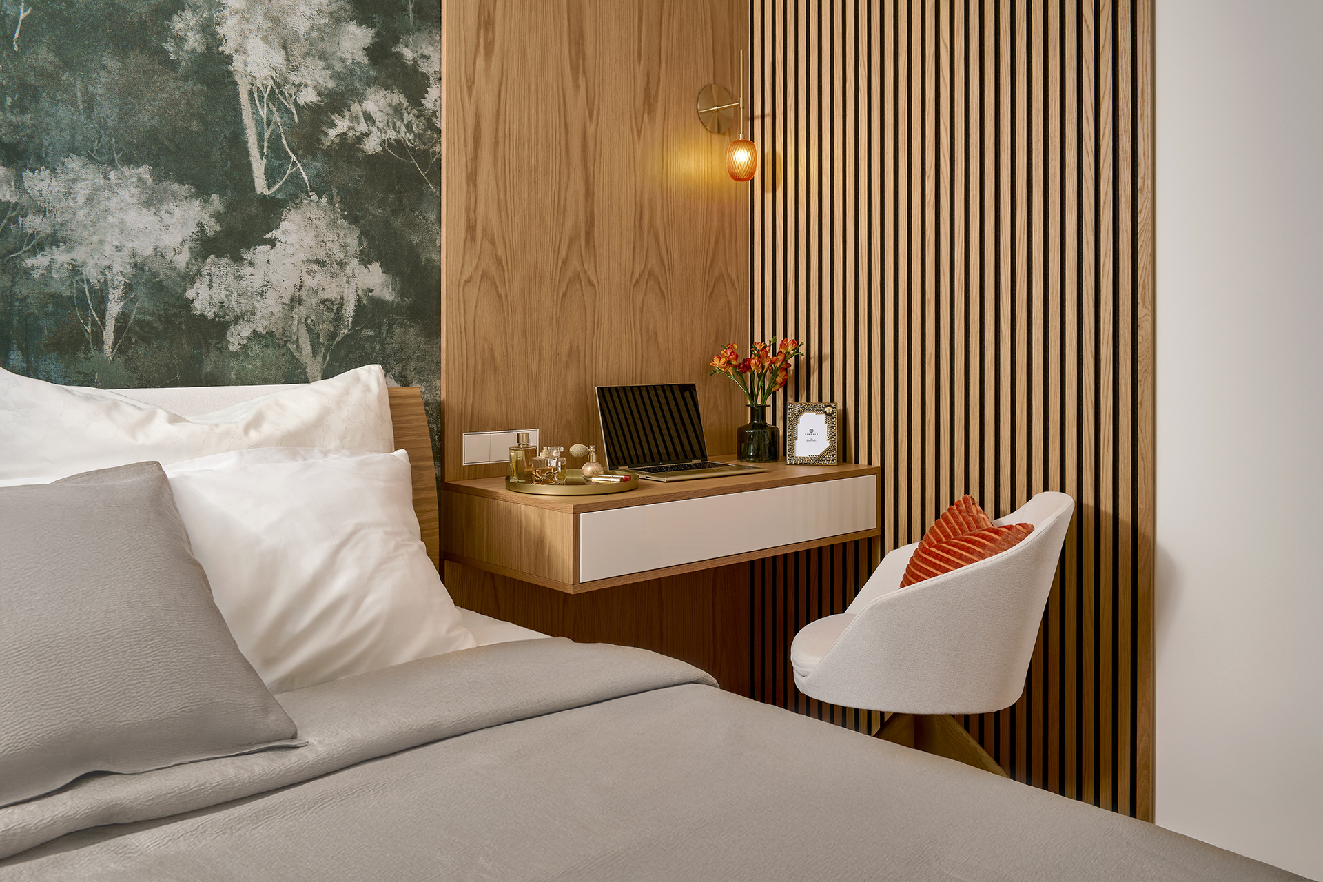 Rovněž druhá ložnice dokazuje, že praktičnost může mít šmrnc. Velkorysá skříň SKY spolu s akustickými panely působí nejen funkčně, ale i dekorativně. Postel KLAUDIE doplněná kosmetickým stolkem a křeslem ANETTE vytváří příjemné zákoutí pro odpočinek i každodenní rituály.