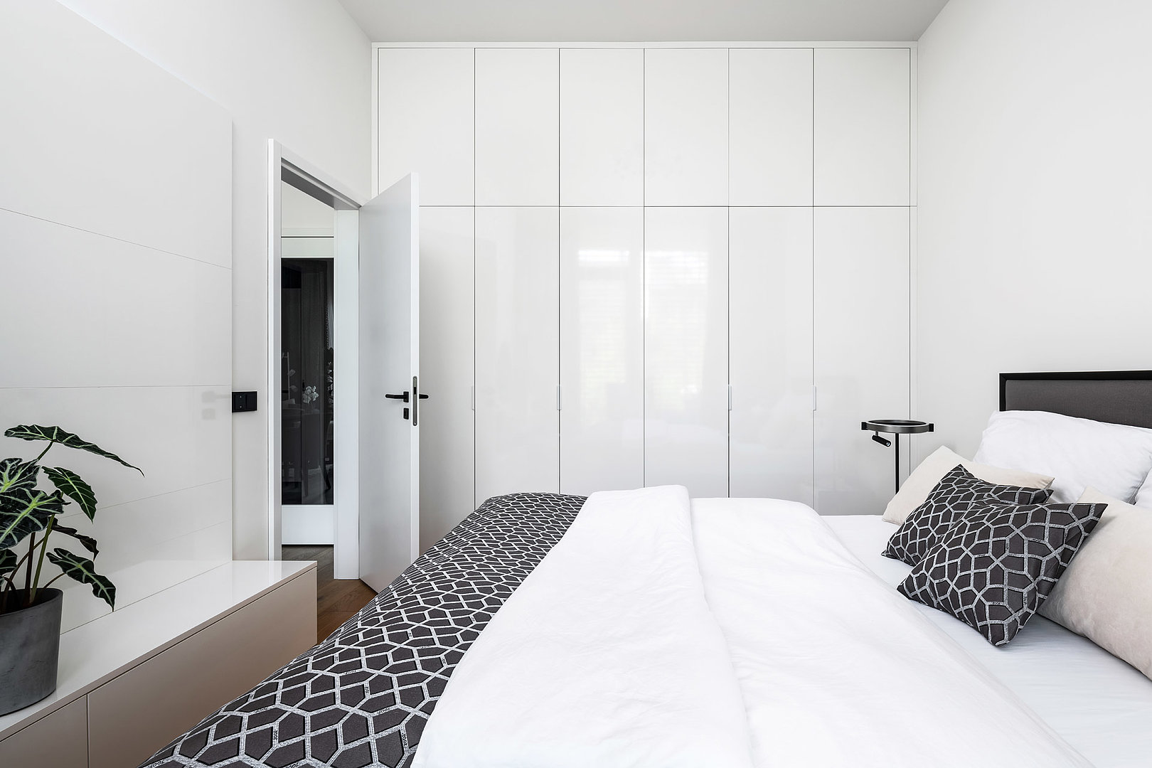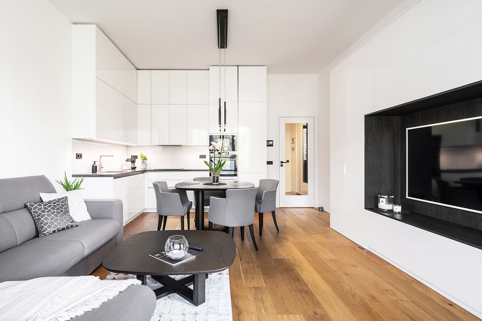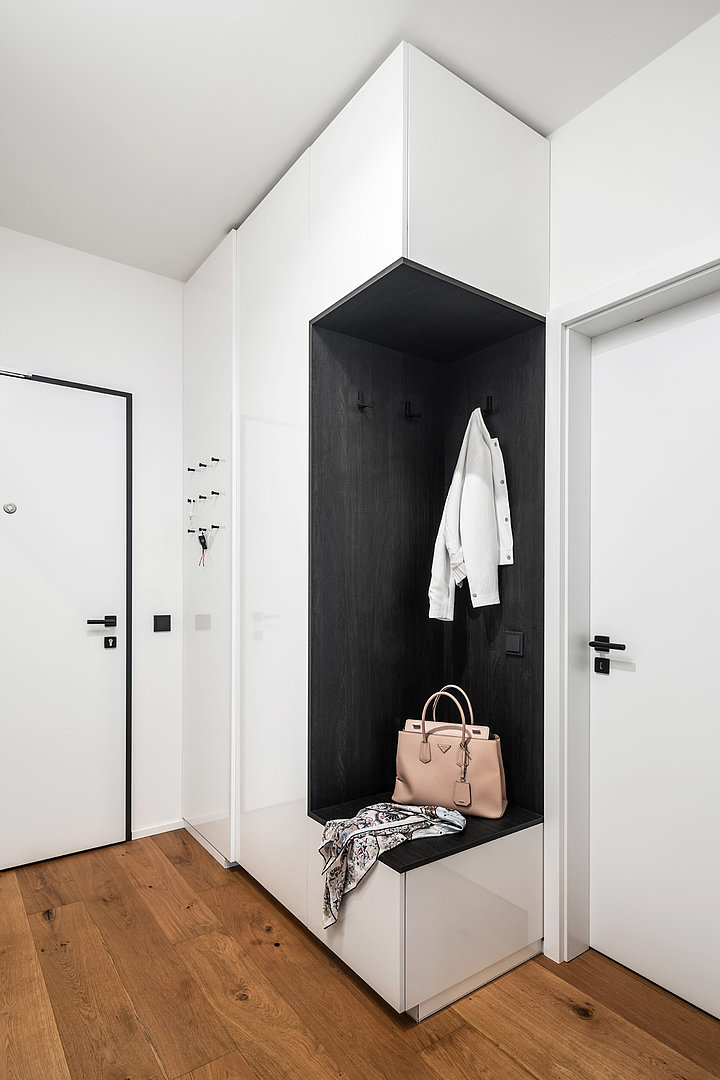 Interiér vybavený v jednotném materiálovém provedení, které se prolíná kuchyní, obývacím pokojem, ložnicí, koupelnu i chodbou. Nadčasový bílý lak ve vysokém lesku je nejlepší volbou v rámci menších interiérů. Přesvědčte se sami.