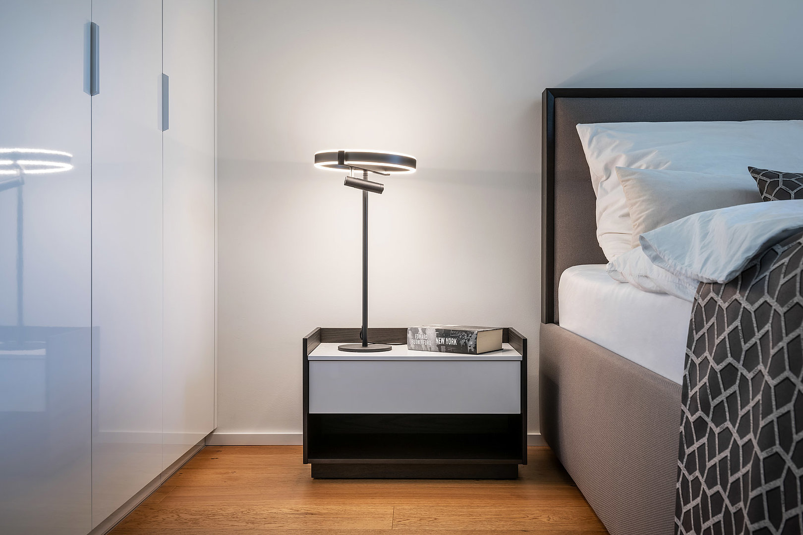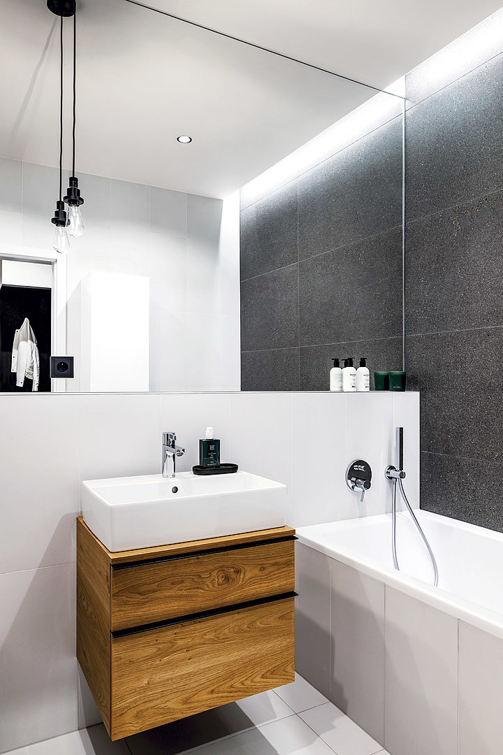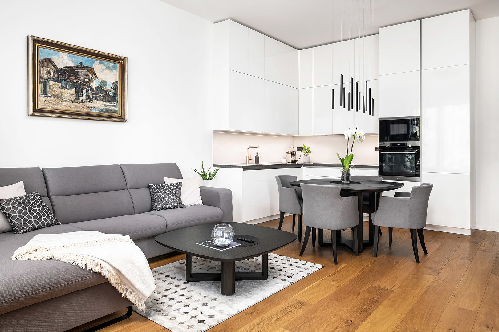 Interiér vybavený v jednotném materiálovém provedení, které se prolíná kuchyní, obývacím pokojem, ložnicí, koupelnu i chodbou. Nadčasový bílý lak ve vysokém lesku je nejlepší volbou v rámci menších interiérů. Přesvědčte se sami.