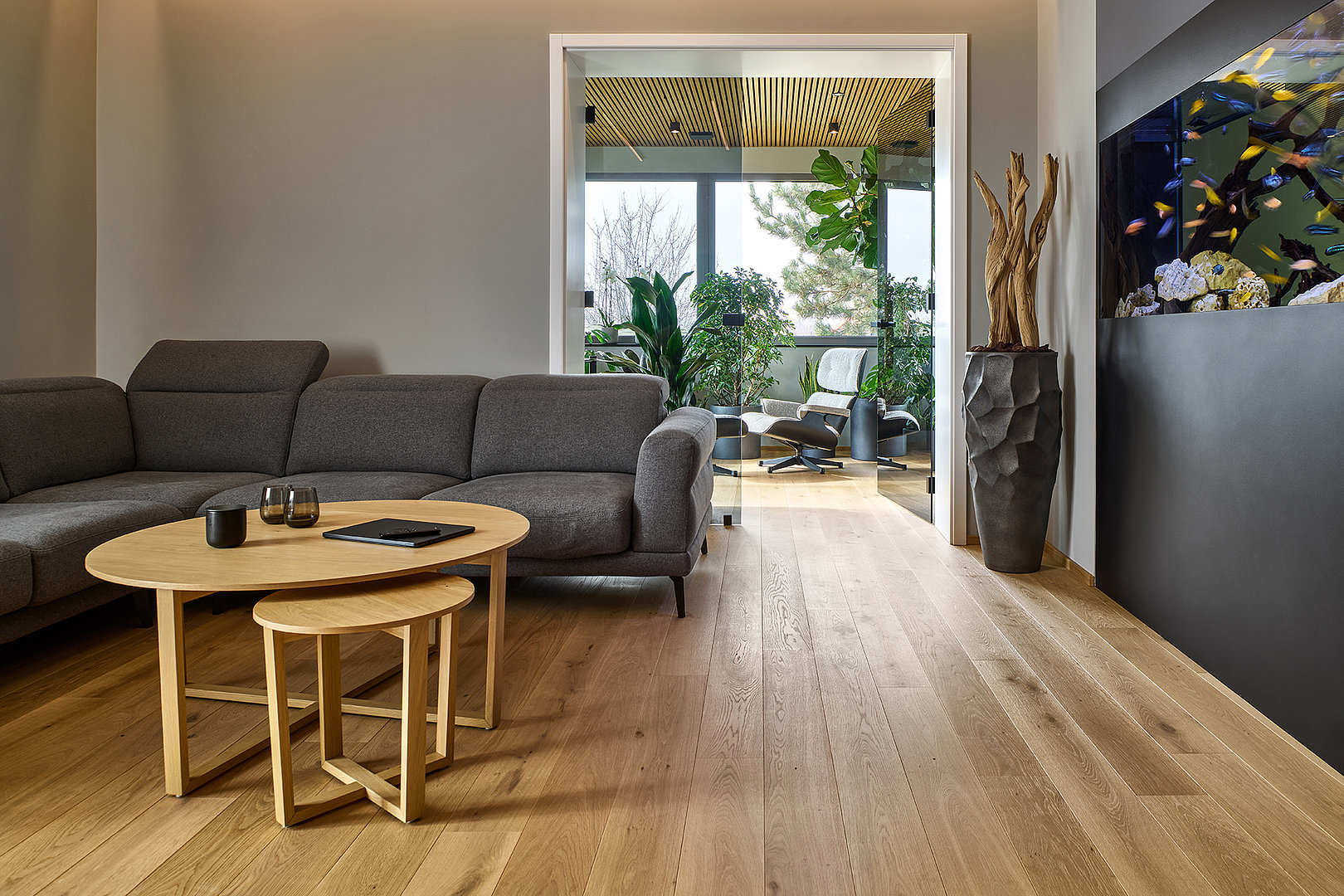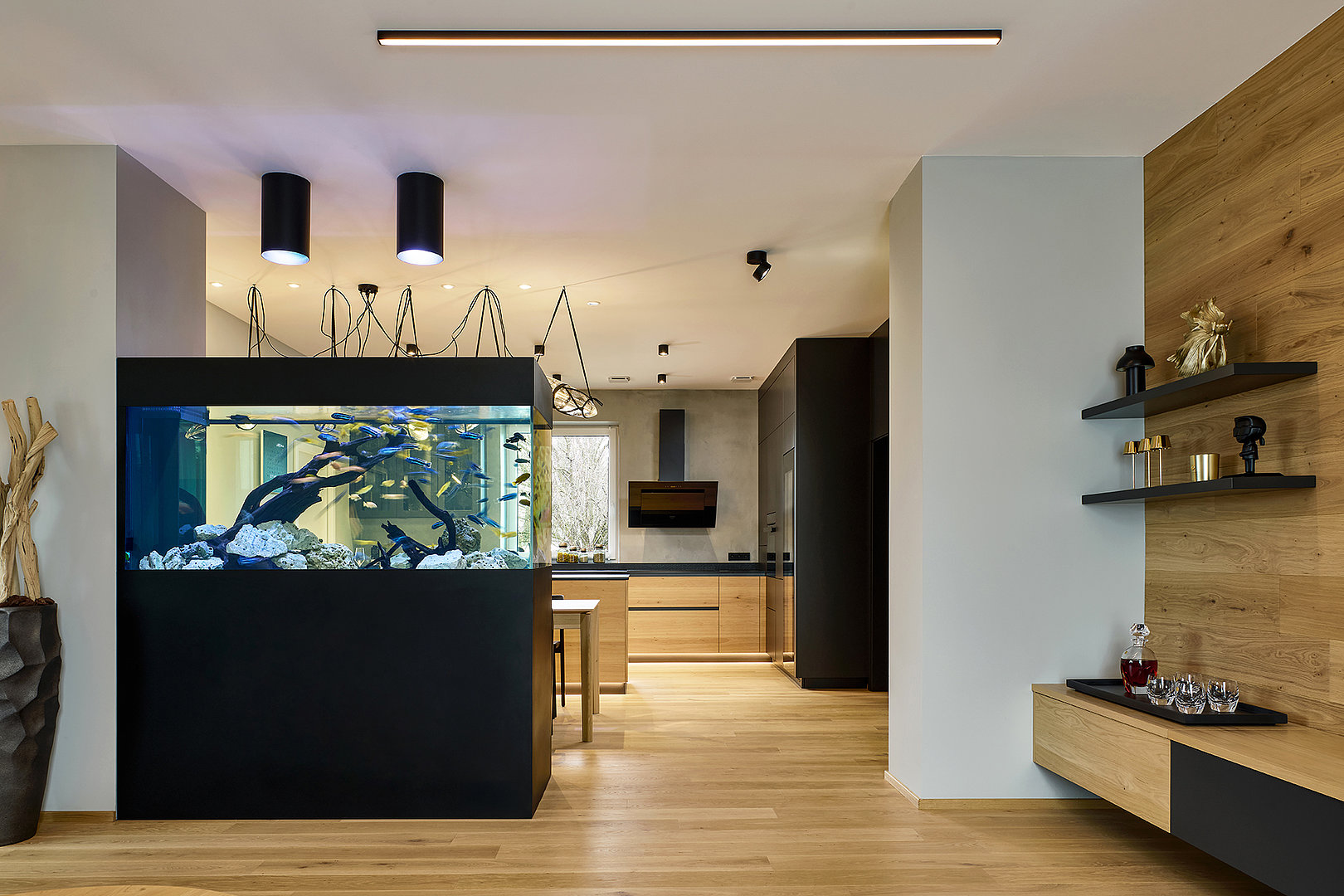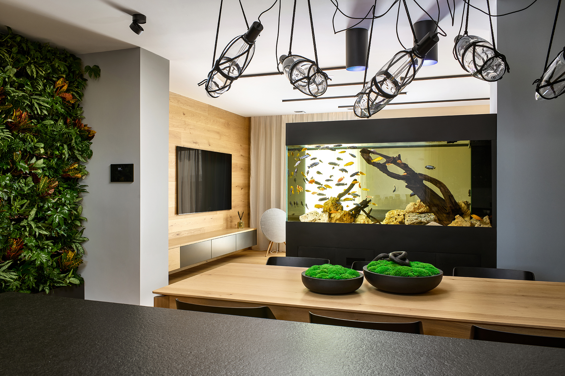Tlumené barvy, přírodní tóny, akvárium jako živý prvek a propojení s relaxační zónou plnou zeleně podtrhují celkový koncept.