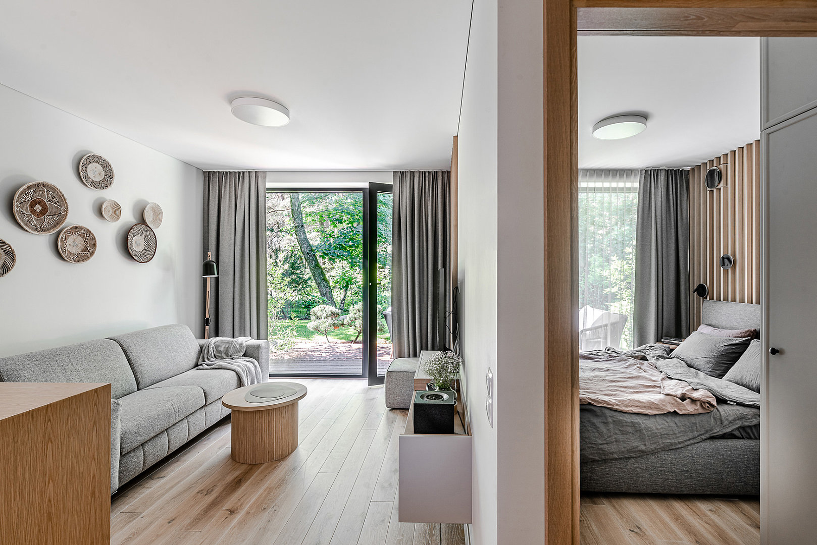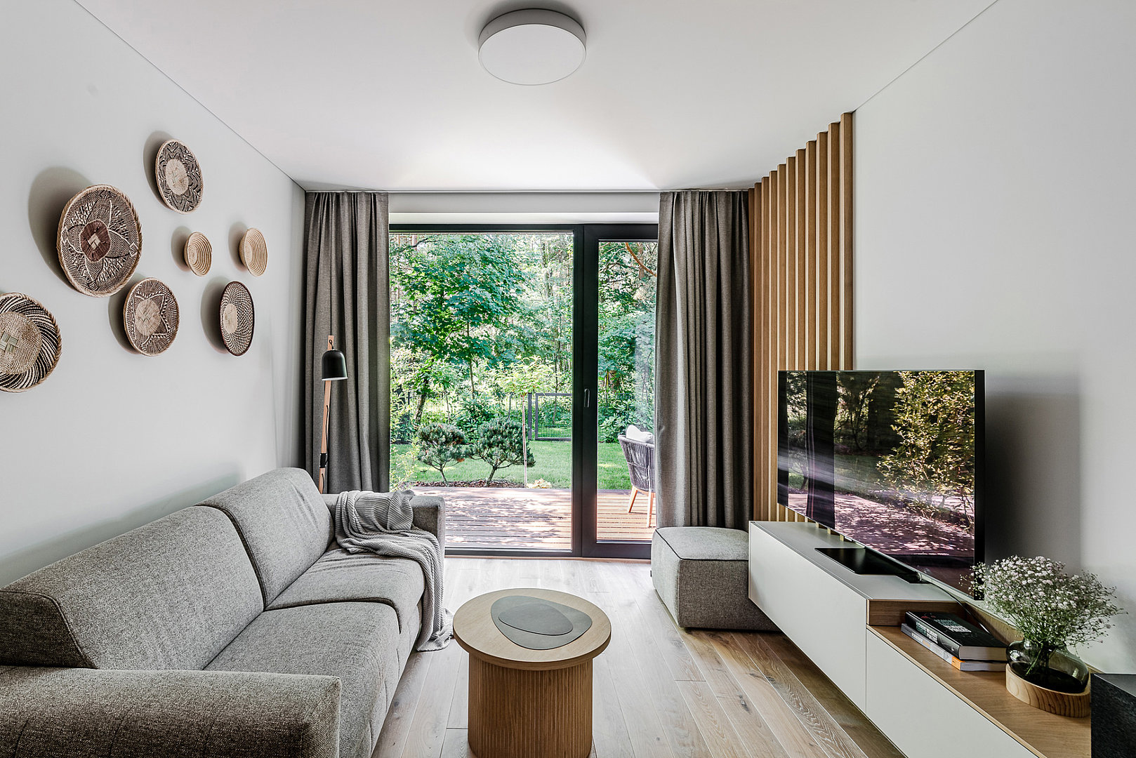Obývací pokoj nabízí řadu designových prvků, které se opakují také v návaznosti na jídelnu s kuchyní. Vše je laděno do stejných materiálů a barev.