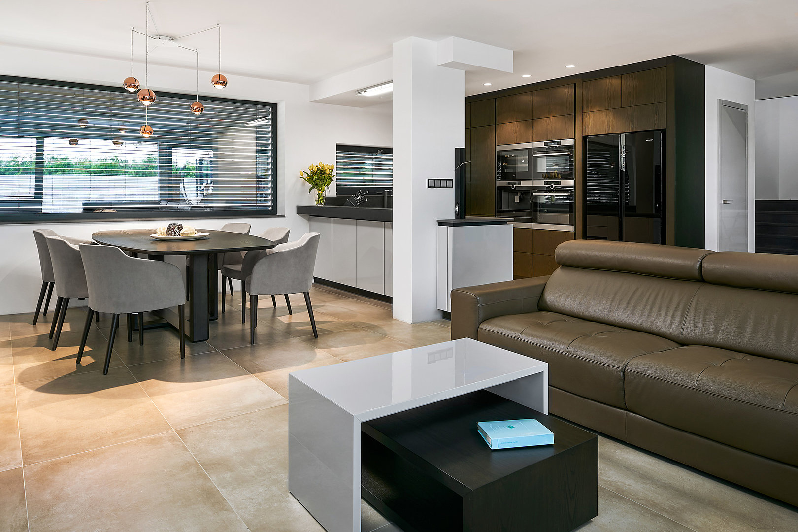 Otevřený interiér si žádá stejné materiálové provedení a design. Vše je v dokonalé souhře.