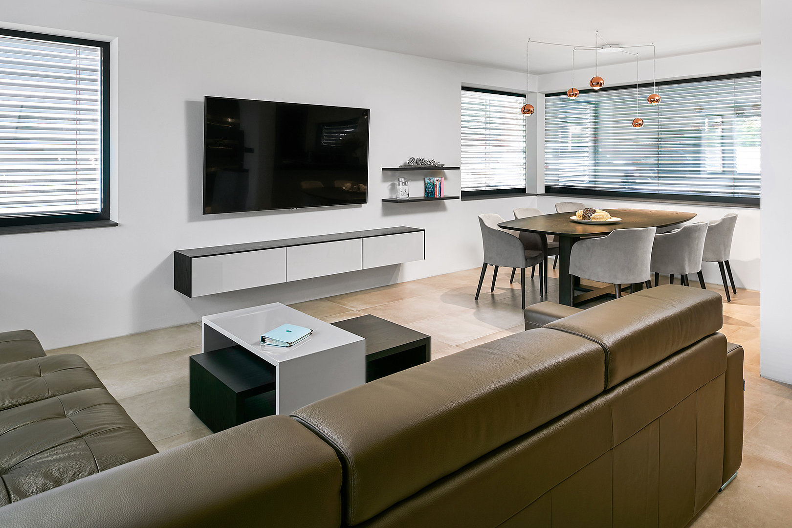 Obývací pokoj v interiéru s tmavou dýhou