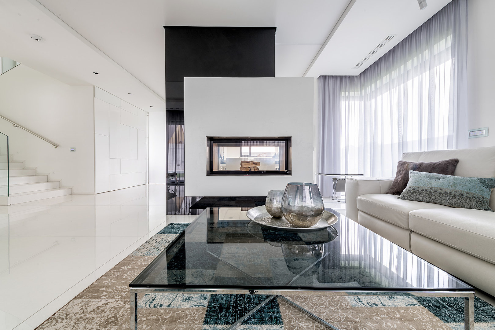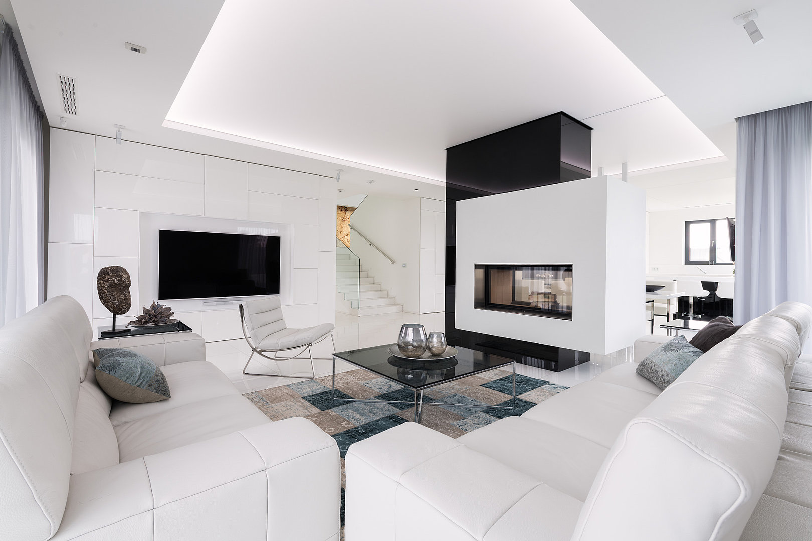 Luxusní obývací pokoj s designovými obklady ve vysokém lesku. Vše do sebe dokonale zapadá a ladí.