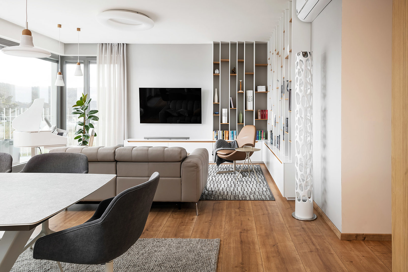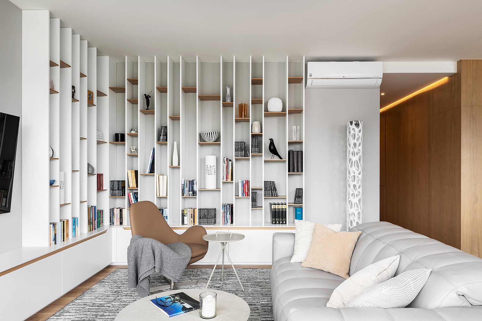 Obývací pokoj s nízkými závěsnými skříňkami modelu SOLID a velmi elegantní a zároveň vkusnou knihovnou.