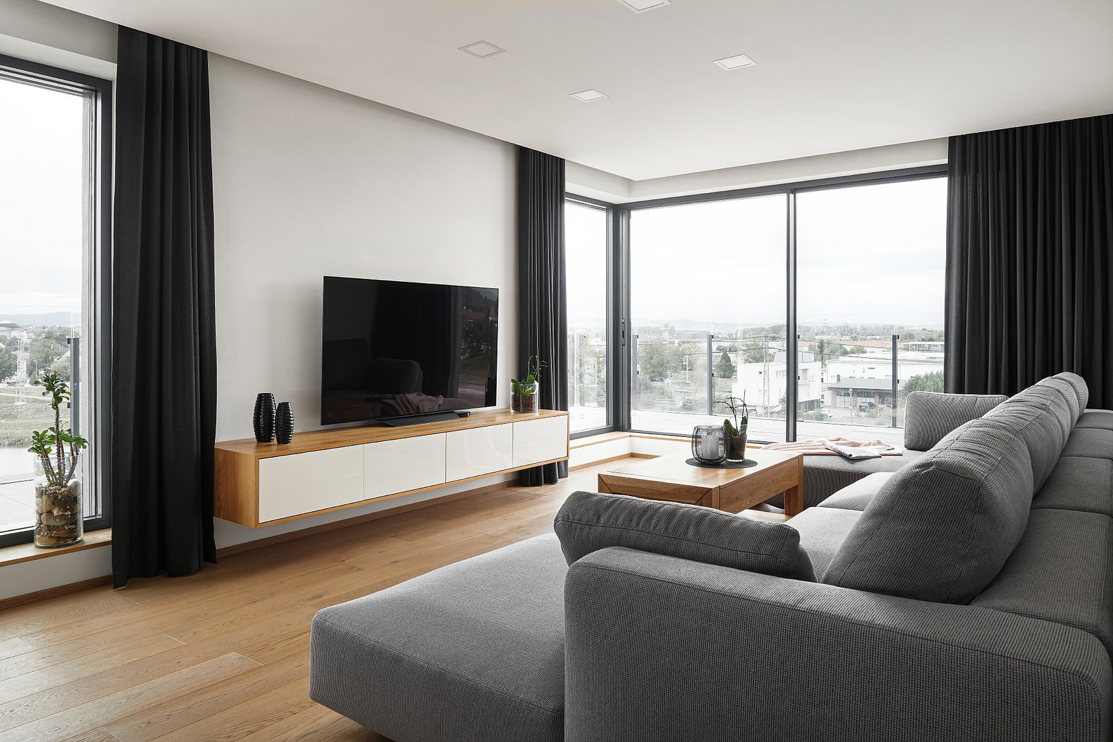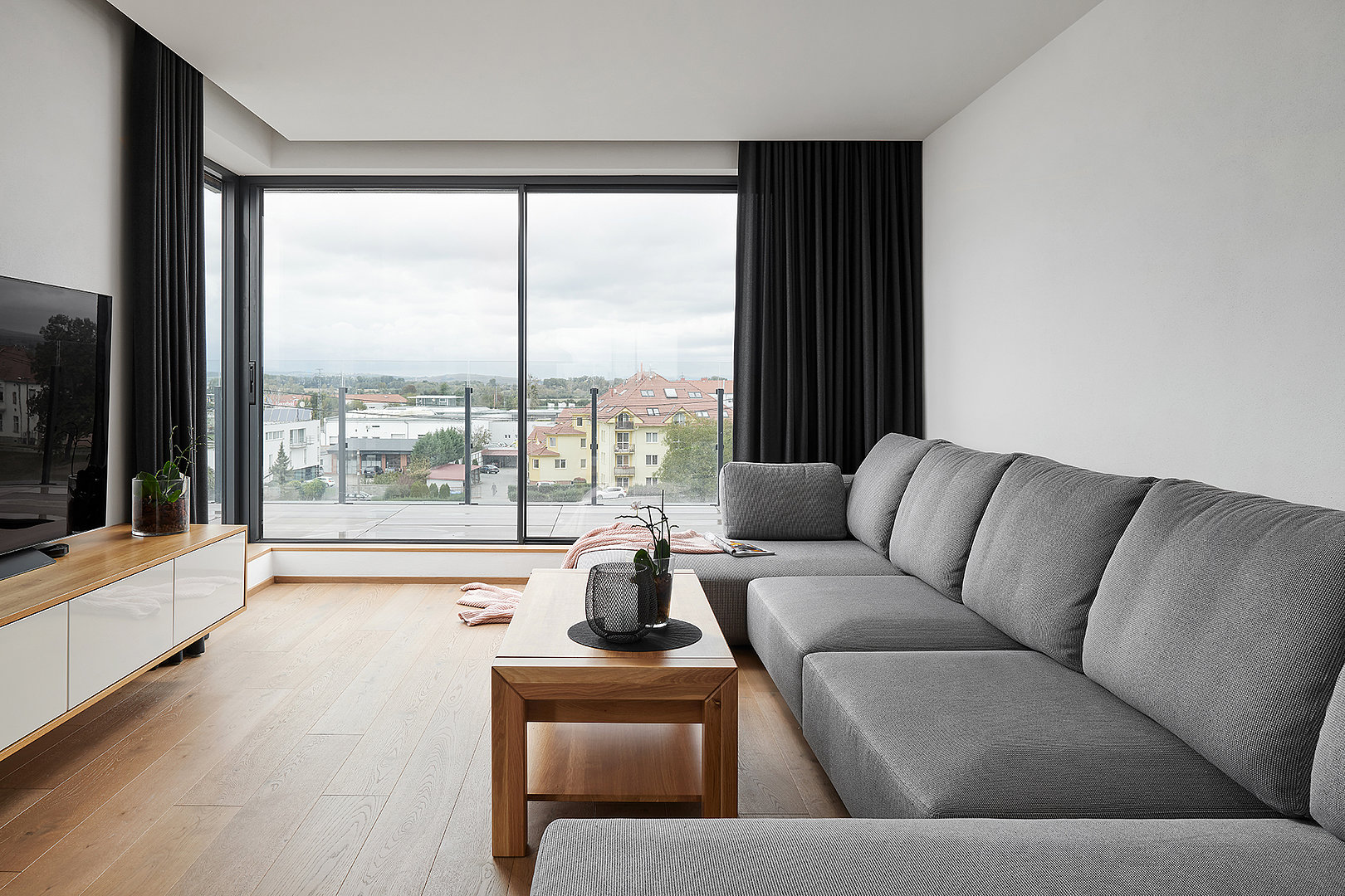 Obývací pokoj v prosluněném luxusním bytě s terasou